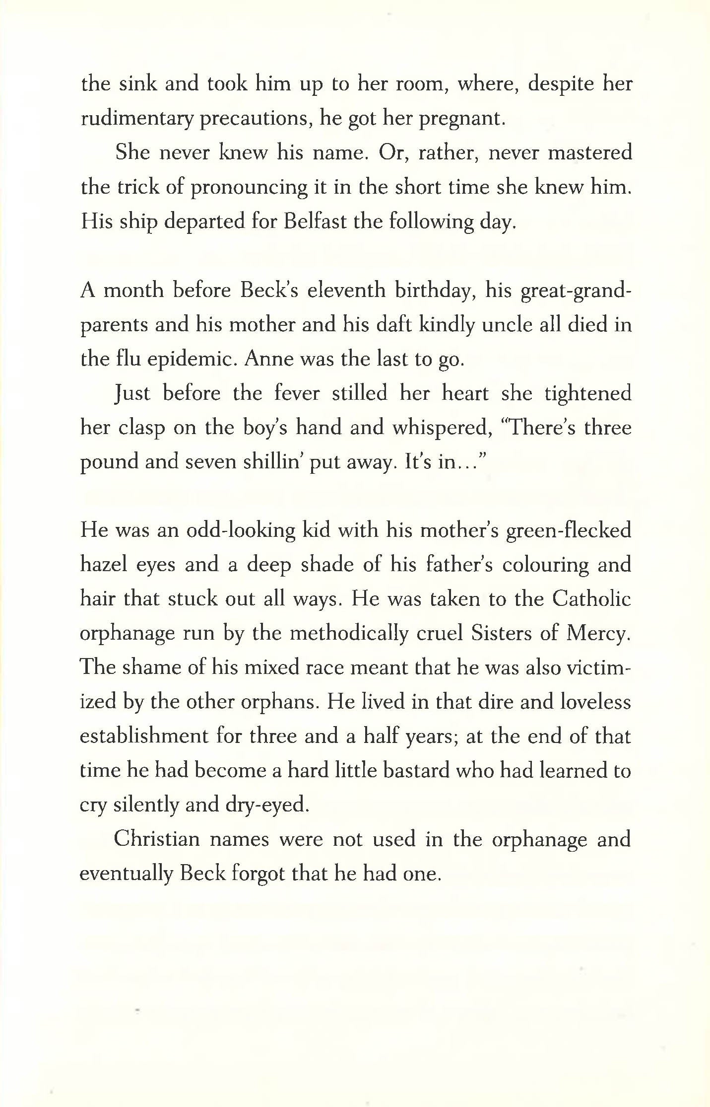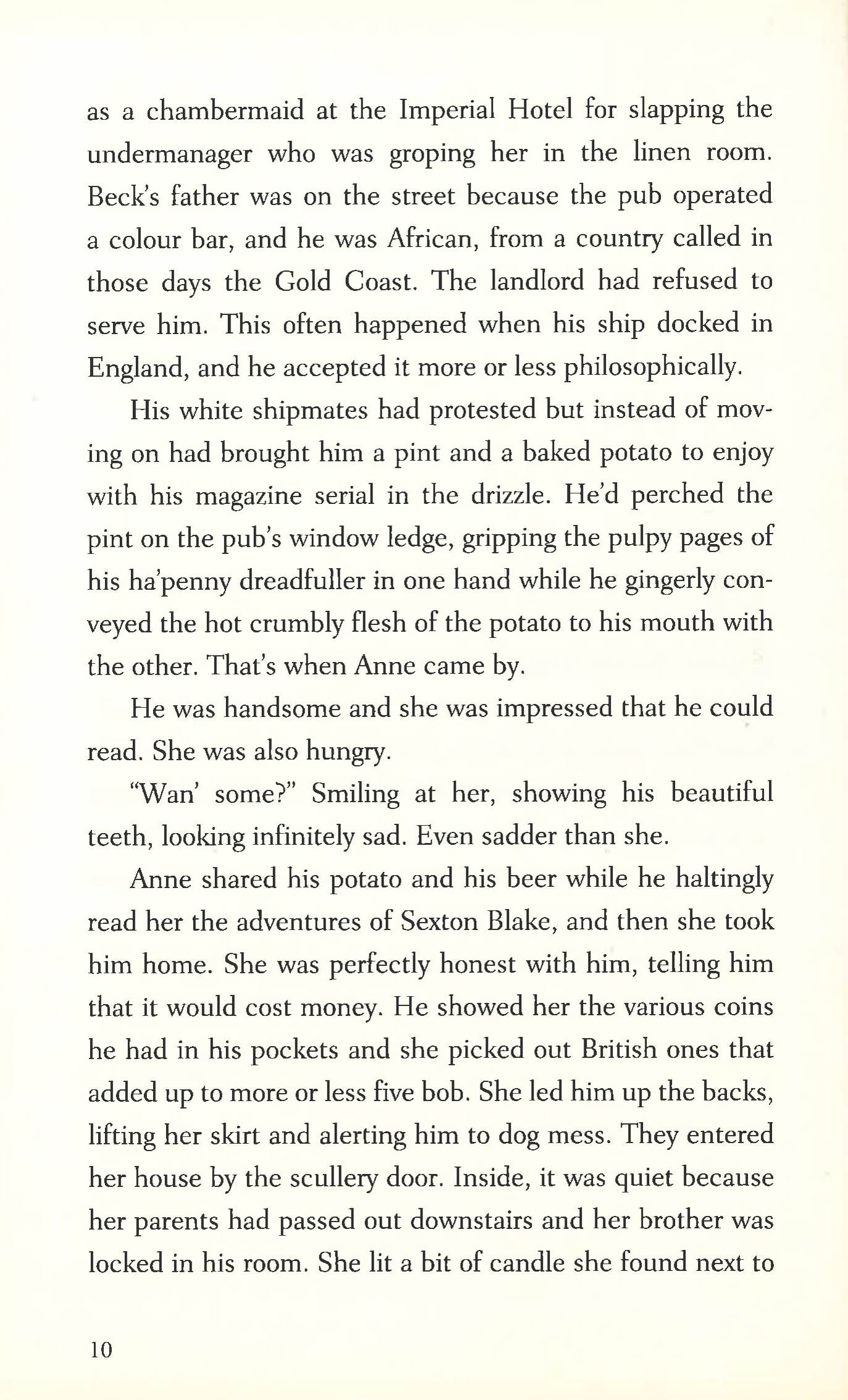 The final novel from Carnegie Medal-winning author Mal Peet is a sweeping coming-of-age adventure, with all the characteristic beauty and strenth of his prose.Both harrowing and life-affirming, the final novel from Carnegie Medal-winning author Mal Peet is the sweeping coming-of-age adventure of a mixed race boy transported to North America.Born from a street liaison between a poor young woman and an African sailor in the 1900s, Beck is soon orphaned and sent to the Catholic Brothers in Canada. Shipped to work on a farm, his escape takes him across the continent in a search for belonging. Enduring abuse and many hardships, Beck has times of comfort and encouragement, eventually finding Grace, the woman with whom he can finally forge his life and shape his destiny as a young man. A picaresque novel set during the Depression as experienced by a young black man, it depicts great pain but has an uplifting and inspiring conclusion.