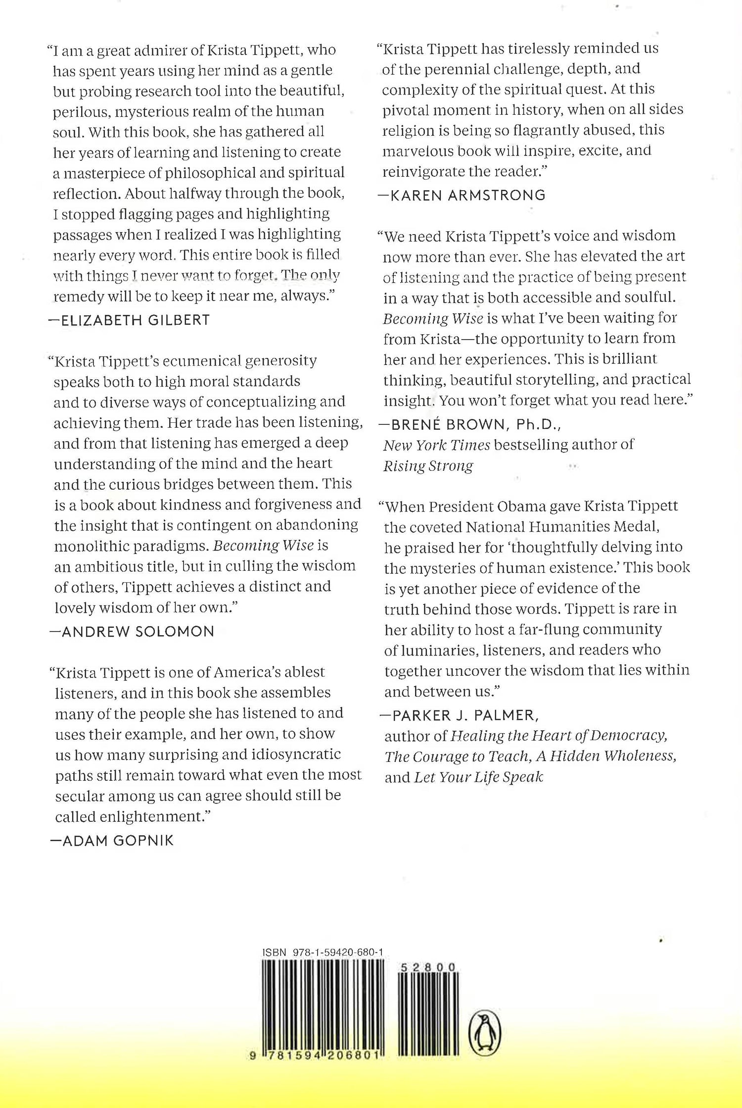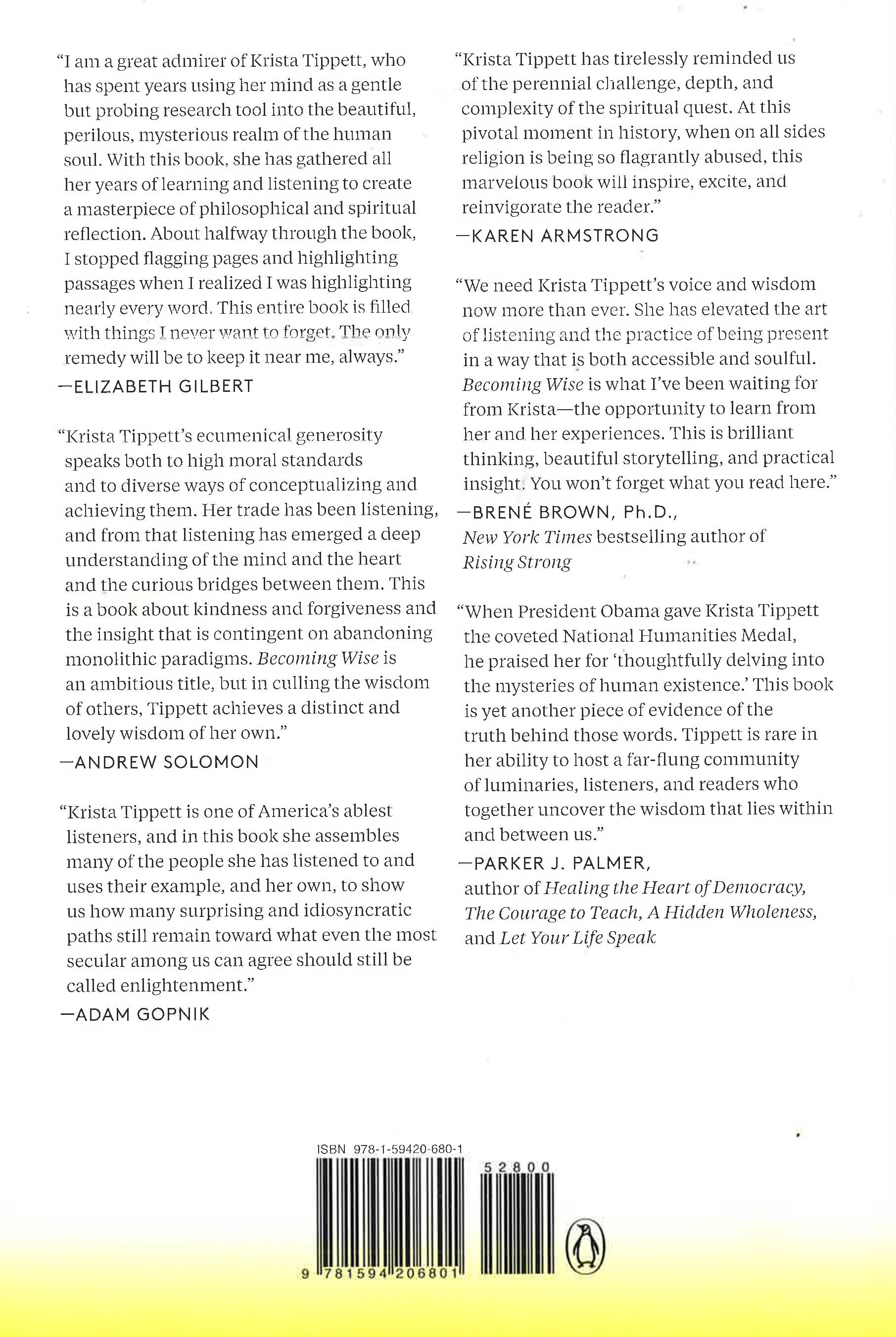 "Krista Tippett [is] a modern-day Simone Weil. . . . Becoming Wise is a tremendously vitalizing read in its totality--a wellspring of nuance and dimension amid our Flatland of artificial polarities, touching on every significant aspect of human life with great gentleness and a firm grasp of human goodness." --Maria Popova, Brain Pickings