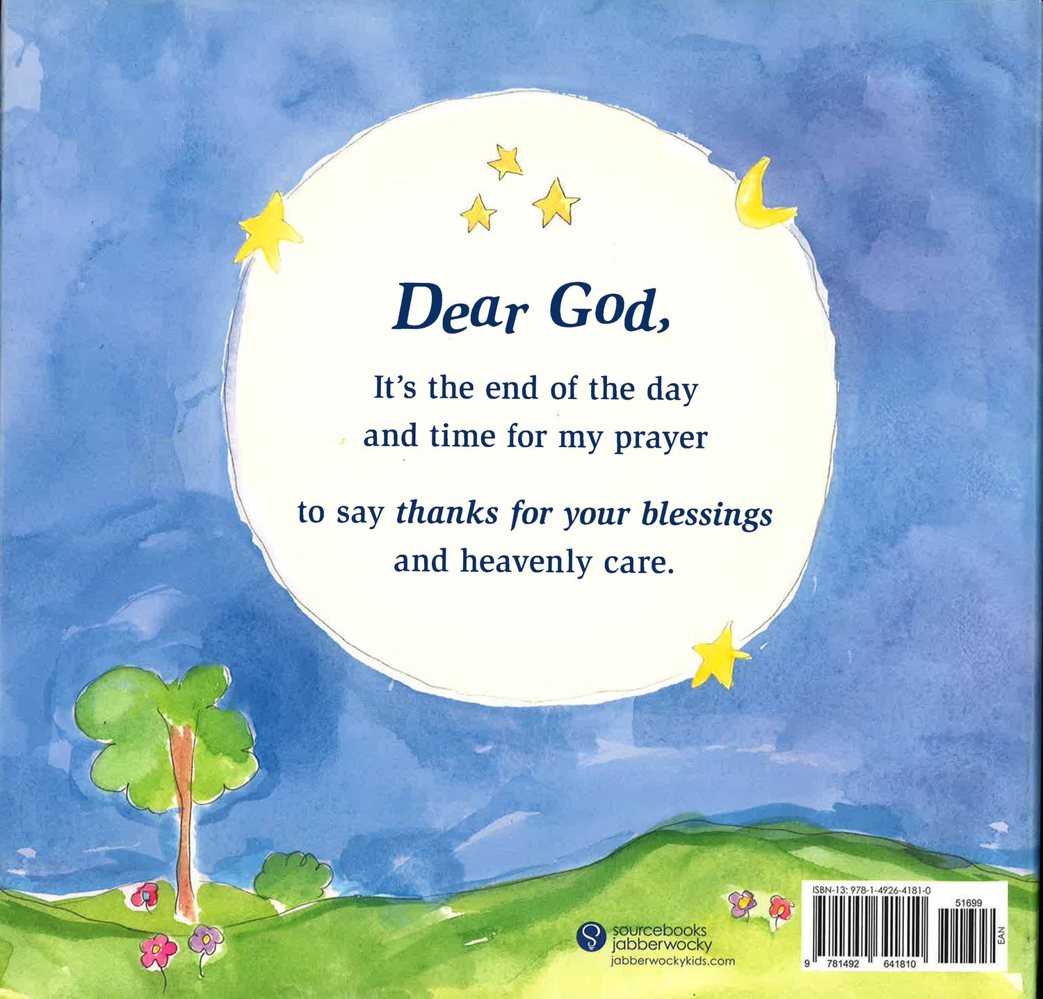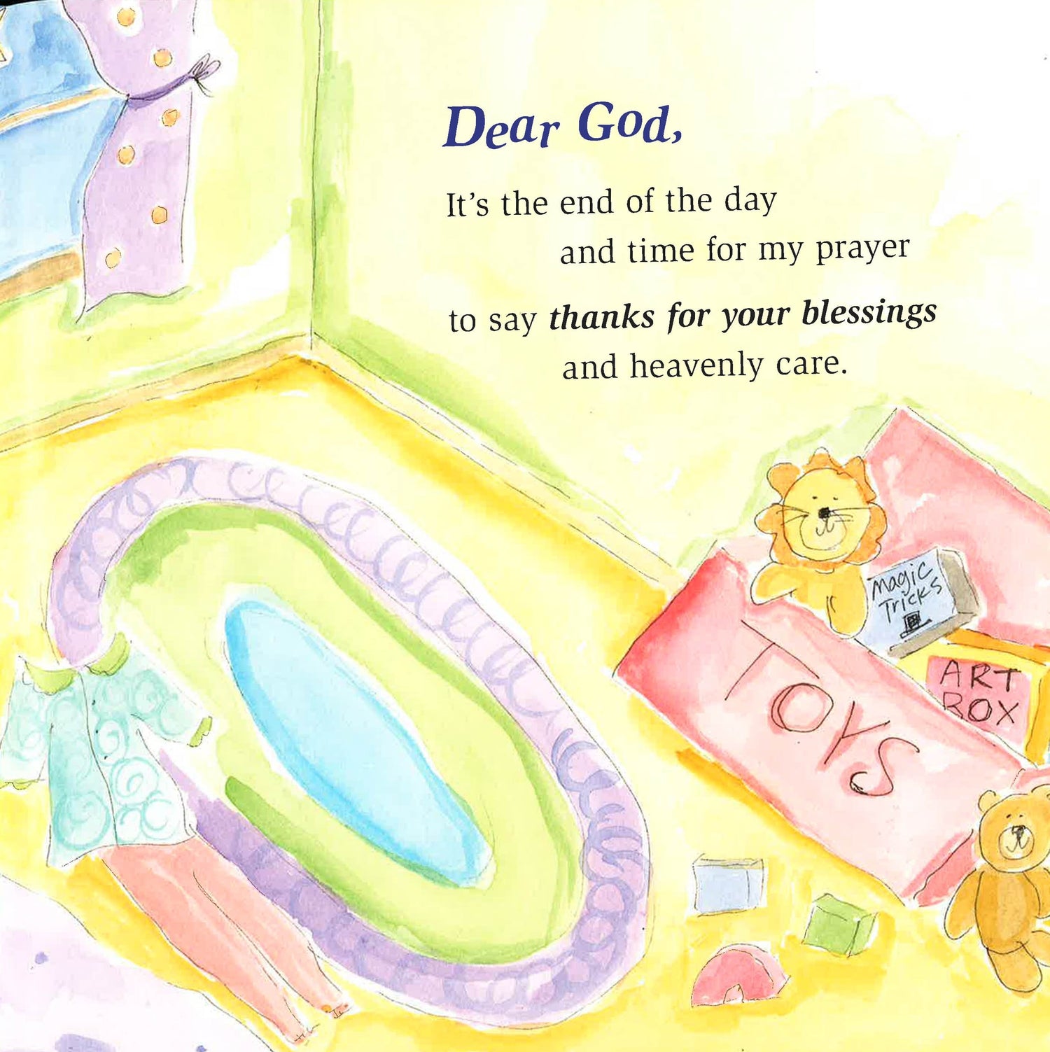Dear God, It's the end of the day and time for my prayer to say thanks for your blessings and heavenly care Bedtime Blessings offers a peaceful way to end the day with a special child, through this heartfelt prayer of gratitude and wish for God's blessings on others, too. Created to help grow a joyful spirit of contentment in even the youngest child, this sweet blessing will guide them into dreamland with a heart full of thanks and love.