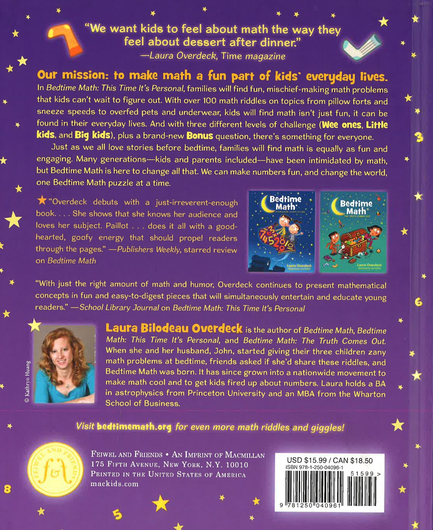 "We want kids to feel about math the way they feel about dessert after dinner." --Laura Overdeck, Time magazine Our mission: to make math a fun part of kids' everyday lives. In, Bedtime Math: This Time It's Personal, families will find fun, mischief-making math problems that kids can't wait to figure out. With over 100 math riddles on topics from pillow forts and and sneeze speeds to overfed pets and underwear, kids will find math isn't just fun, it can be found in their everyday lives. And with three different levels of challenge (Wee ones, Little kids, and Big kids), plus a brand-new Bonus question, there's something for everyone.