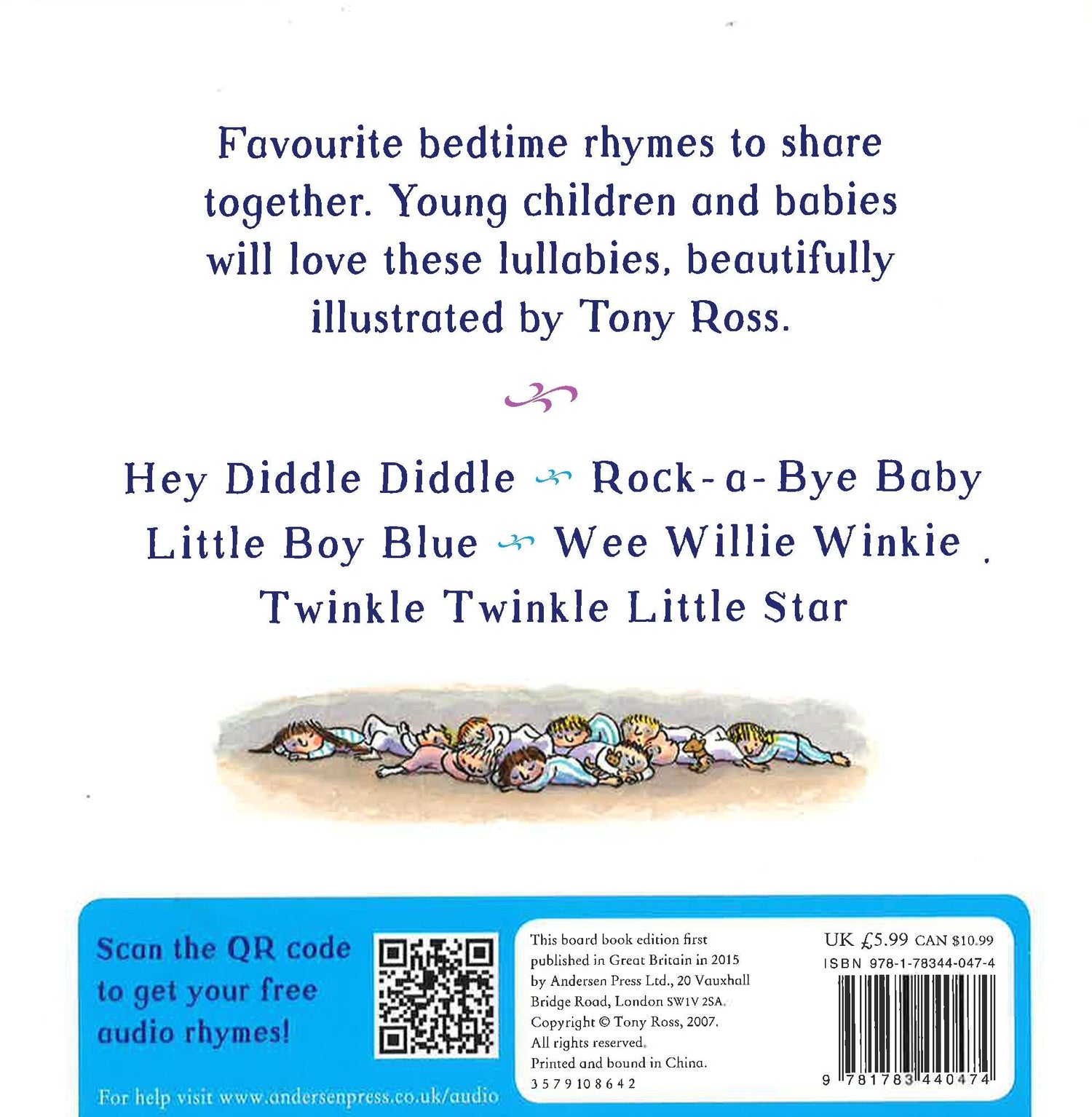 This delightful tabbed board book of favourite bedtime nursery rhymes features a free audio reading and is illustrated by the award-winning Tony Ross.Young children and babies will love these lullaby bedtime rhymes: Hey, Diddle Diddle, Rock-a-Bye Baby, Diddle Diddle Dumpling, Wee Willie Winkie, Twinkle Twinkle Little Star.A wonderful book to share, plus download the QR code so that you can listen along!