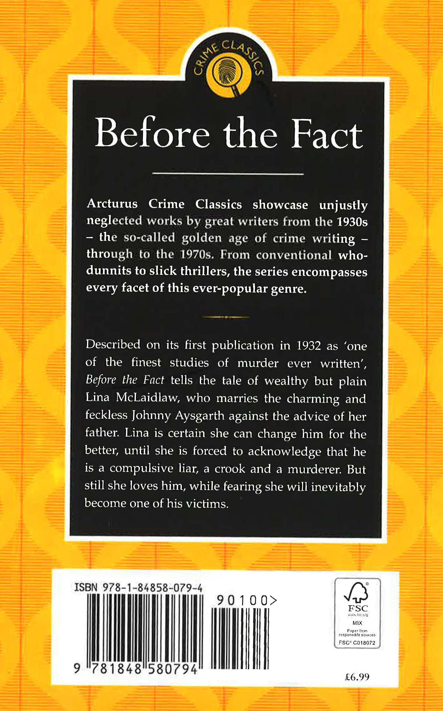 Before the Fact is a ground-breaking psychological drama of immense power, described as 'one of the finest studies of murder ever written'. Inspiring Hitchcock's classic film Suspicion, this classic title was written in the golden age of crime fiction and remains utterly compelling to this day. When wealthy but plain Lina McLaidlaw marries feckless Johnny Aysgarth, she is certain she can change him for the better. Despite her hopes, she is soon forced to acknowledge the truth - that he is not only a compulsive liar and a crook but also a murderer. She continues to love him, while fearing she will inevitably become one of his victims. Written in the age of Agatha Christie's mysteries, this suspenseful novel turns the storytelling on its head, introducing you to the murderer early on before going on to explore the psychology of the relationship between murderer and victim in enthralling detail.