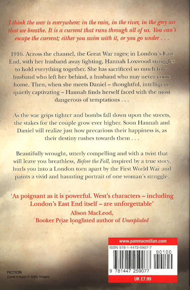 A compelling, moving tale of a love affair, set in the East End during World War 1 and inspired by an unforgettable true story A compelling, moving tale of a love affair, set in the East End during World War 1 and inspired by an unforgettable true story.A great war.A powerful love.An impossible choice.I think the war is everywhere: in the rain, in the river, in the grey air that we breathe. It is a current that runs through all of us. You can't escape the current; either you swim with it, or you go under. 1916. Across the channel, the Great War rages; in London's East End, with her husband away fighting, Hannah Loxwood struggles to hold everything together. But when Hannah takes a job in a cafe, she discovers a glimpse of freedom away from her needy young children, her spiteful sister and desperately ill father. While the conflict drags on, Hannah battles with the overwhelming burden of 'duty'. She has sacrificed so much for a husband who left her behind, a husband who may never come home. Then, when she meets Daniel - thoughtful, intelligent, quietly captivating - Hannah finds herself faced with the most dangerous of temptations . . . As the war grips tighter and bombs fall down upon the streets, the stakes for the couple grow ever higher. Soon Hannah and Daniel will realise just how precarious their happiness is, as their destiny rushes towards them . . . Beautifully wrought, utterly compelling and with a twist that will leave you breathless, Before The Fall, inspired by a true story, hurls you into a London torn apart by the First World War and paints a vivid and haunting portrait of one woman's struggle.