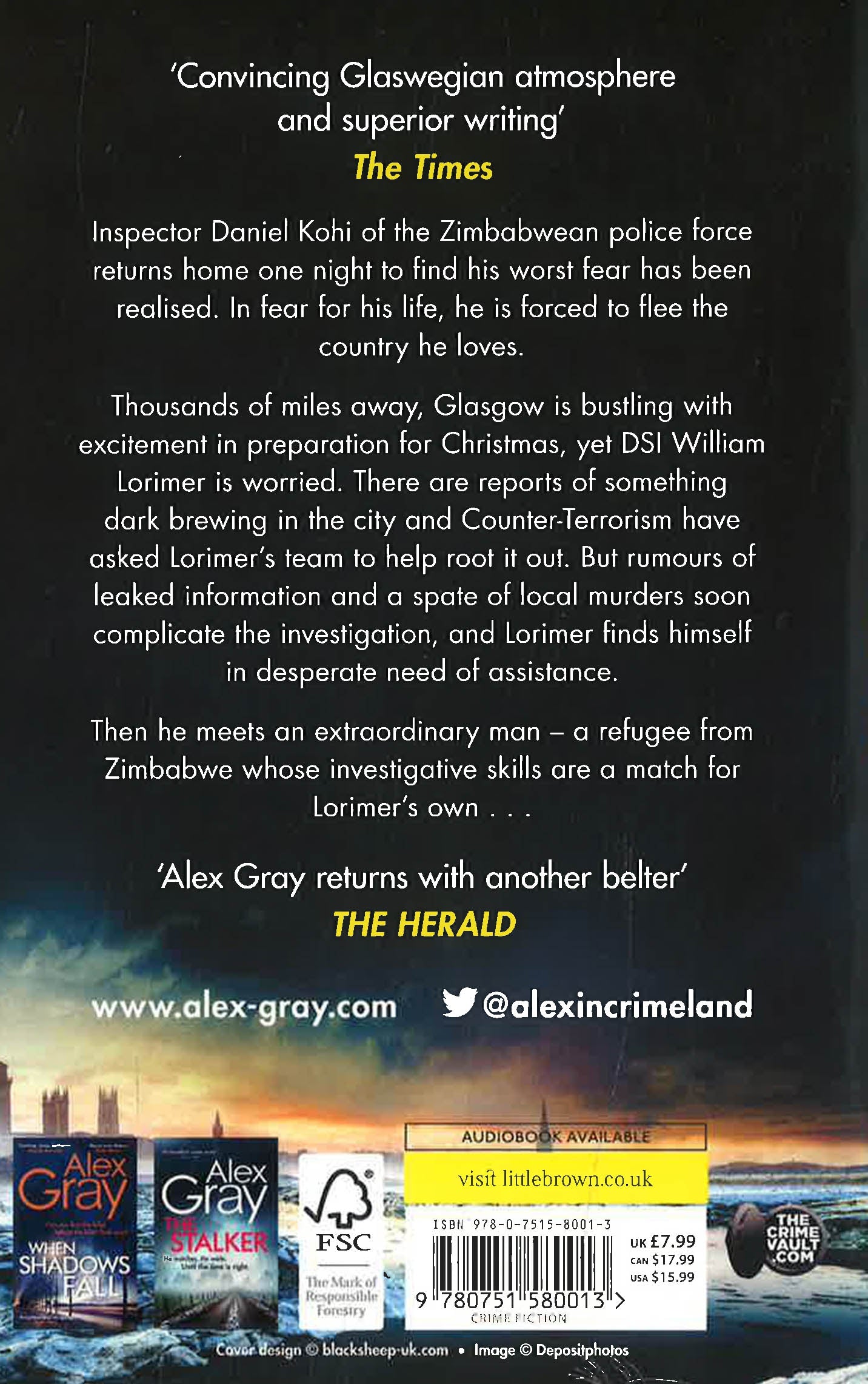 ***Discover your next reading obsession with Alex Gray's Sunday Times bestselling Scottish detective series*** Don't miss the latest from Alex Gray. ECHO OF THE DEAD is out in paperback in November 2022 and a new mystery, QUESTIONS FOR A DEAD MAN, is out in March 2023.Whether you've read them all or whether this is your first Lorimer novel, Before the Storm is perfect if you love Ian Rankin, Val McDermid and Ann Cleeves 'Before the Storm is classic Alex Gray - warm-hearted, atmospheric . . . with a very interesting twist' ANN CLEEVES 'An exciting procedural' SUNDAY TIMES 'Another brilliant Lorimer adventure' ***** Reader Review'Exciting and unexpected, I hope it's not too long till the next one' ***** Reader Review'Lorimer is up there with the best' ***** Reader Review'Alex Gray returns with another belter' THE HERALD_______________Your favourite Scottish detective is back with a brand new case, one that threatens to destroy everything. Inspector Daniel Kohi of the Zimbabwean police force returns home one night to find his worst nightmare has been realised. His family dead, his house destroyed, and in fear for his life, he is forced to flee the country he loves. Far away in Glasgow, DSI William Lorimer has his hands full. Christmas is approaching, the city is bustling, and whilst the homicide rate has been relatively low, something much darker is brewing. Counter-Terrorism have got wind of a plot, here in Lorimer's native city, to carry out an unspeakable atrocity on Christmas Eve. They need someone with local knowledge to help them root it out and who better than the head of the Scottish Major Incidents Team. But the investigation is complicated by a spate of local murders, and by the rumours that someone is passing information to criminal organisations from inside the police force. Soon Lorimer finds himself in desperate need of assistance. Then he meets an extraordinary man - a refugee from Zimbabwe whose investigative skills are a match for Lorimer's own . . .__________________PRAISE FOR THE WILLIAM LORIMER SERIES'Immensely exciting and atmospheric' ALEXANDER MCCALL SMITH'Move over Rebus' DAILY MAIL 'Relentless and intriguing' PETER MAY 'Convincing Glaswegian atmosphere and superior writing' THE TIMES