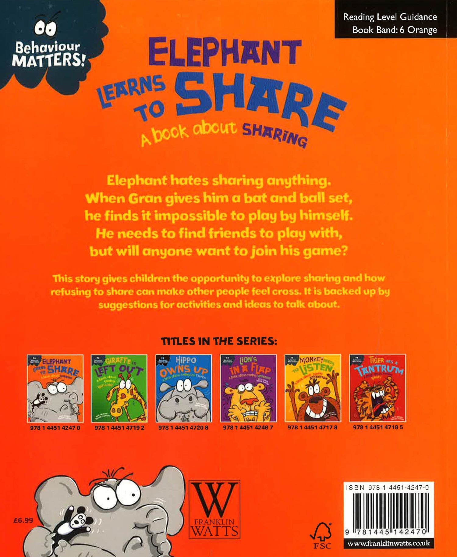 A lively picture book that examines the issue of not sharing in an amusing but reassuring way through animal characters - perfect for young children who don't want to share. The story offers a gentle way in to reinforce this good behaviour. At the end of the story there are notes for parents and teachers with suggestions of ways to help children deal with anger.Elephant hates sharing anything. When Gran gives him a bat and ball set, he finds it impossible to play by himself. He needs to find friends to play with, but will anyone want to join his game?It is part of a series Behaviour Matters, which is perfect for sharing with children as a gentle means of discussing their emotions, boosting self-esteem and reinforcing good behaviour. Each book has a fun story featuring fantastic characters which is backed up by suggestions for activities and ideas to talk through together. They support the Personal, Social and Emotional Development Area of Learning in the Early Years Foundation Stage.'Excellent for sharing and encouraging discussion... we can all learn from the approach taken in this series.' Parents in Touch