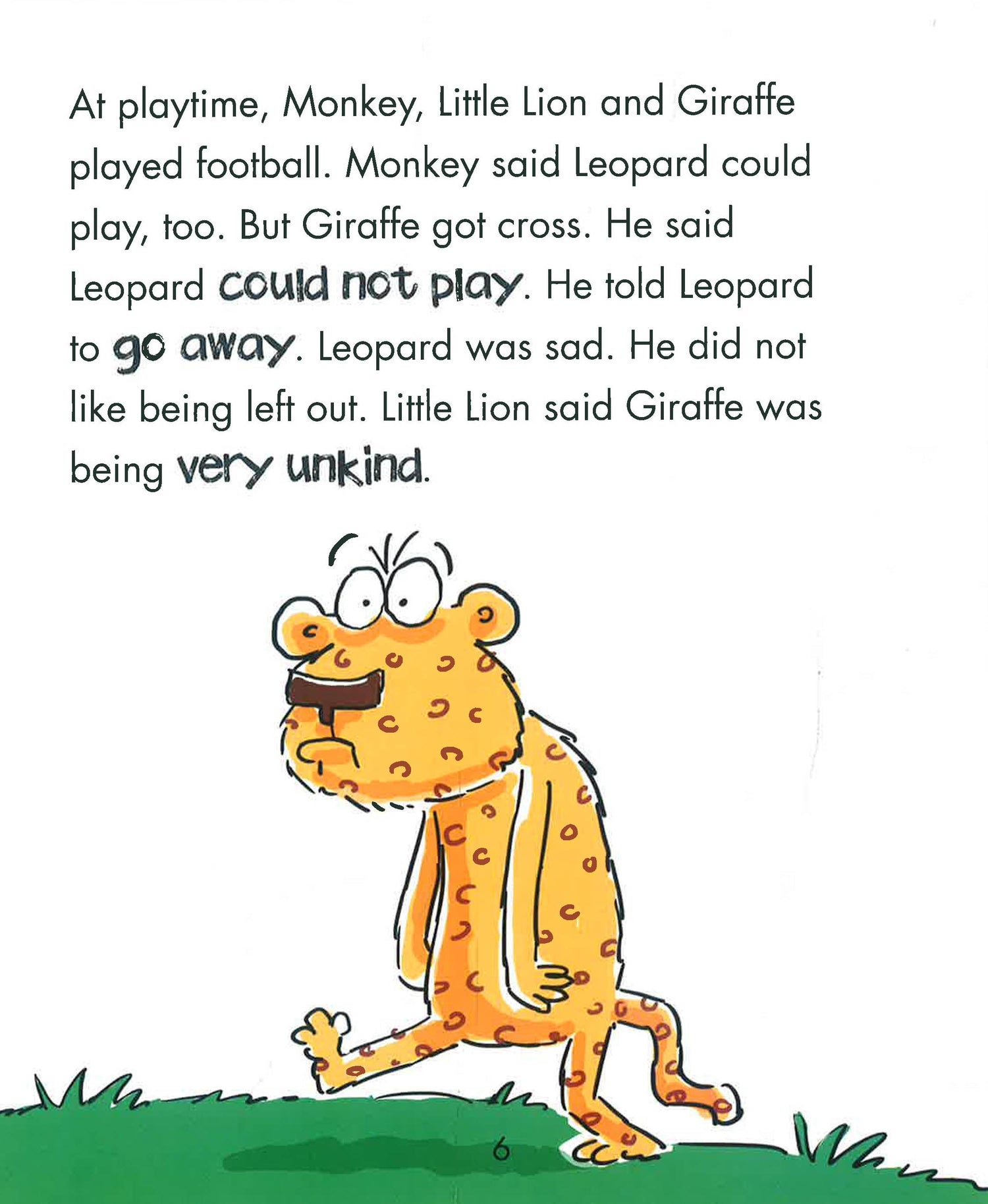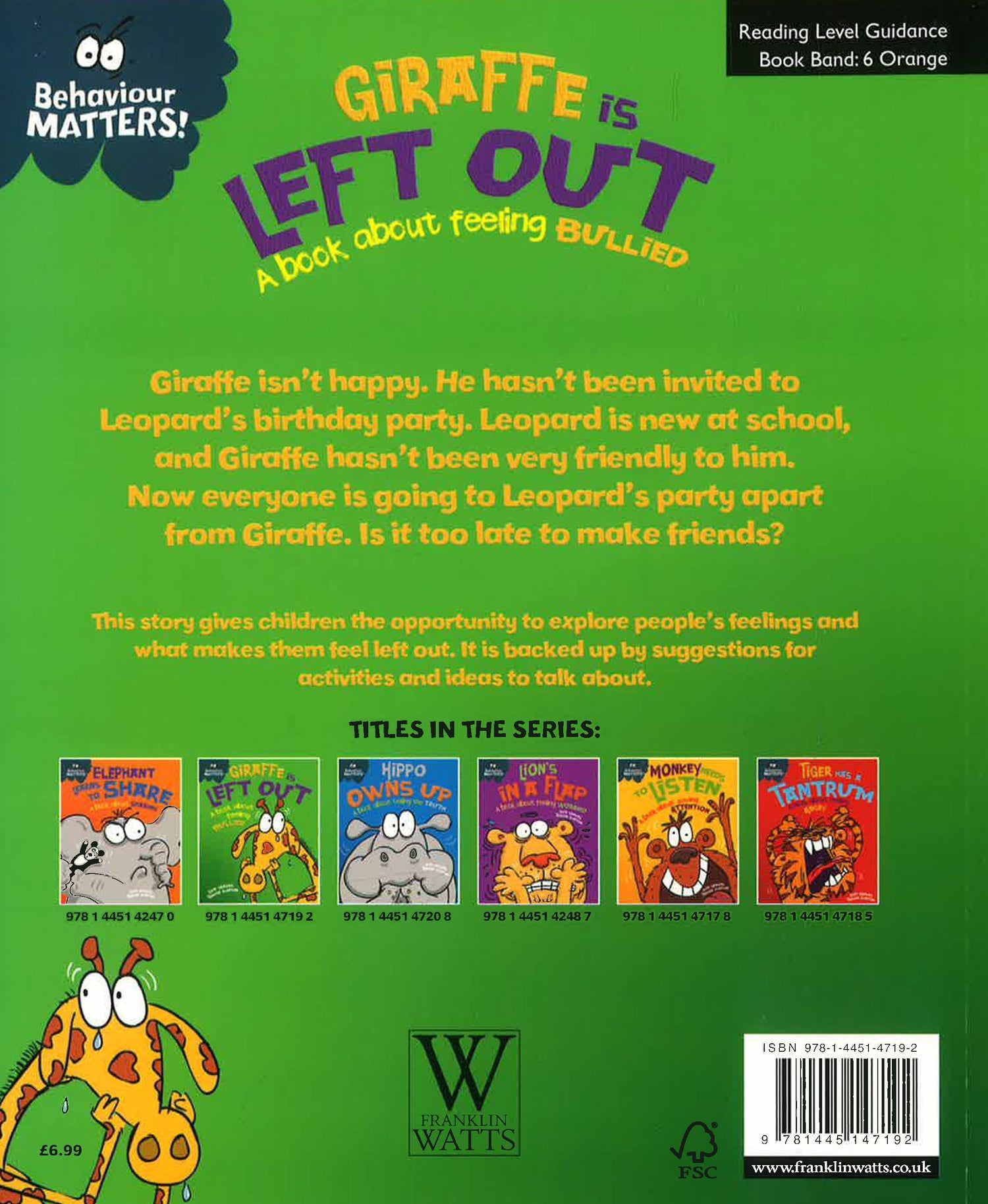 This simple, engaging story is the perfect way to introduce young children to what bullying is, and help them become aware of how their behaviour can impact on other children.There are even suggestions for activities and ideas to talk through together to help children understand.When Leopard arrives at Jungle School, Giraffe doesn't want to include him and tries to exclude him from joining in. So when Leopard has a birthday party he doesn't invite Giraffe, even though he has invited all his friends. Slowly Giraffe begins to understand how Leopard must have felt when he started school. Can the two of them learn to become friends after all? The Behaviour Matters series of picture books provide a gentle means of discussing emotions, boosting self-esteem and reinforcing good behaviour. Supports the Personal, Social and Emotional Development Area of Learning in the Early Years Foundation Stage, and is also suitable for use with children in KS1 and can be used to discuss values. Suitable for children under 5.