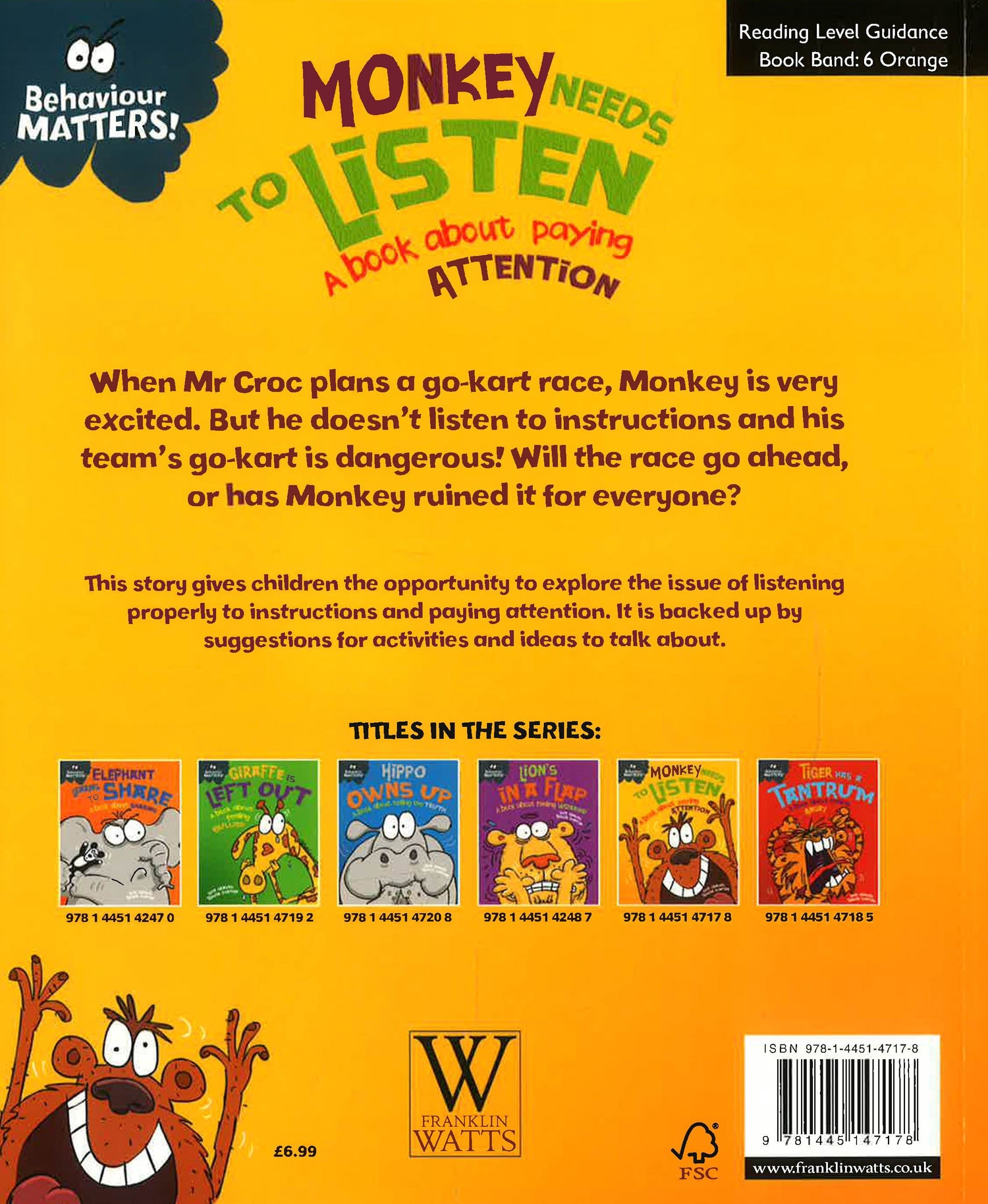 A lively picture book that examines the issue of not listening in an amusing but reassuring way through animal characters - perfect for young children who forget to listen. The story offers a gentle way in to reinforce this good behaviour. At the end of the story there are notes for parents and teachers with suggestions of ways to help children deal with anger.Monkey is so excited about a go-kart race that he doesn't listen to any of the instructions. He doesn't stop to check his kart and he nearly ruins the race for all the animals. Can Monkey learn to listen and pay attention or will the race be abandoned for good?It is part of a series Behaviour Matters, which is perfect for sharing with children as a gentle means of discussing their emotions, boosting self-esteem and reinforcing good behaviour. Each book has a fun story featuring fantastic characters which is backed up by suggestions for activities and ideas to talk through together. They support the Personal, Social and Emotional Development Area of Learning in the Early Years Foundation Stage.'Excellent for sharing and encouraging discussion... we can all learn from the approach taken in this series.' Parents in Touch