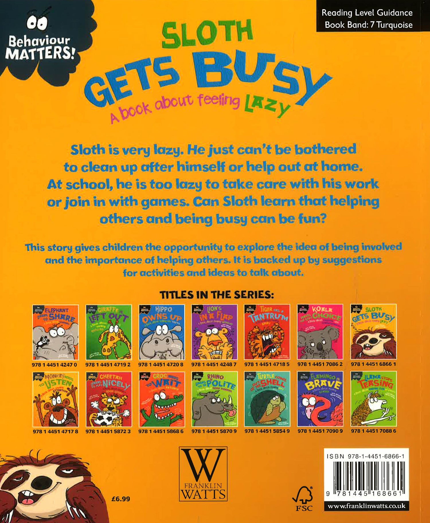 This funny, charming story is the perfect way to introduce young children to the idea of being involved and the importance of helping others and being responsible. Also included are suggestions for activities and ideas to talk through together to help children understand their behaviour.Sloth is very lazy. He just can't be bothered to clean up after himself or help out at home. At school, he is too lazy to take care with his work or join in with games. Can Sloth learn that helping others and being busy can be fun?The Behaviour Matters series of picture books provide a gentle means of discussing emotions, boosting self-esteem and reinforcing good behaviour. Supports the Personal, Social and Emotional Development Area of Learning in the Early Years Foundation Stage, and is also suitable for use with children in KS1 and can be used to discuss values. Suitable for children under 5.