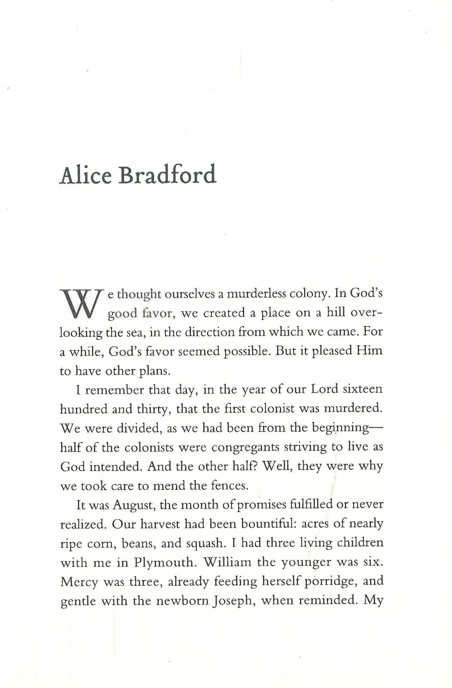 With gripping, immersive details and exquisite prose, TaraShea Nesbit reframes the story of the pilgrims in the previously unheard voices of two women of very different status and means. She evokes a vivid, ominous Plymouth, populated by famous and unknown characters alike, each with conflicting desires and questionable behavior.