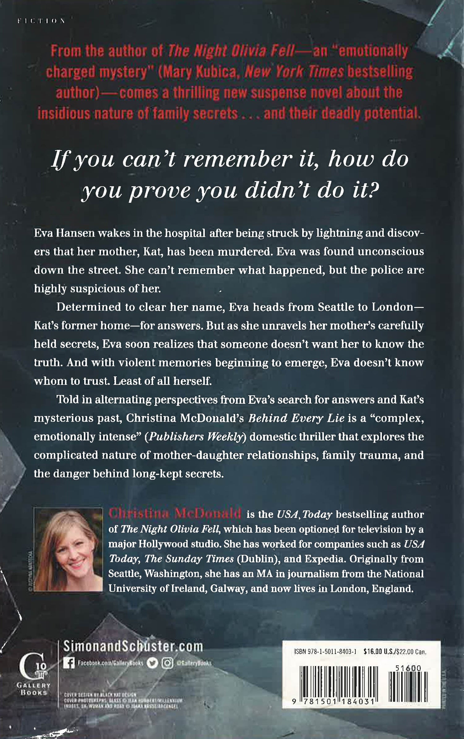 Told in alternating perspectives from Eva’s search for answers and Kat’s mysterious past, Christina McDonald has crafted another “complex, emotionally intense” (Publishers Weekly) domestic thriller. Perfect for fans of Lisa Jewell’s I Found You and Karin Slaughter’s Pieces of Her, Behind Every Lie explores the complicated nature of mother-daughter relationships, family trauma, and the danger behind long-held secrets.