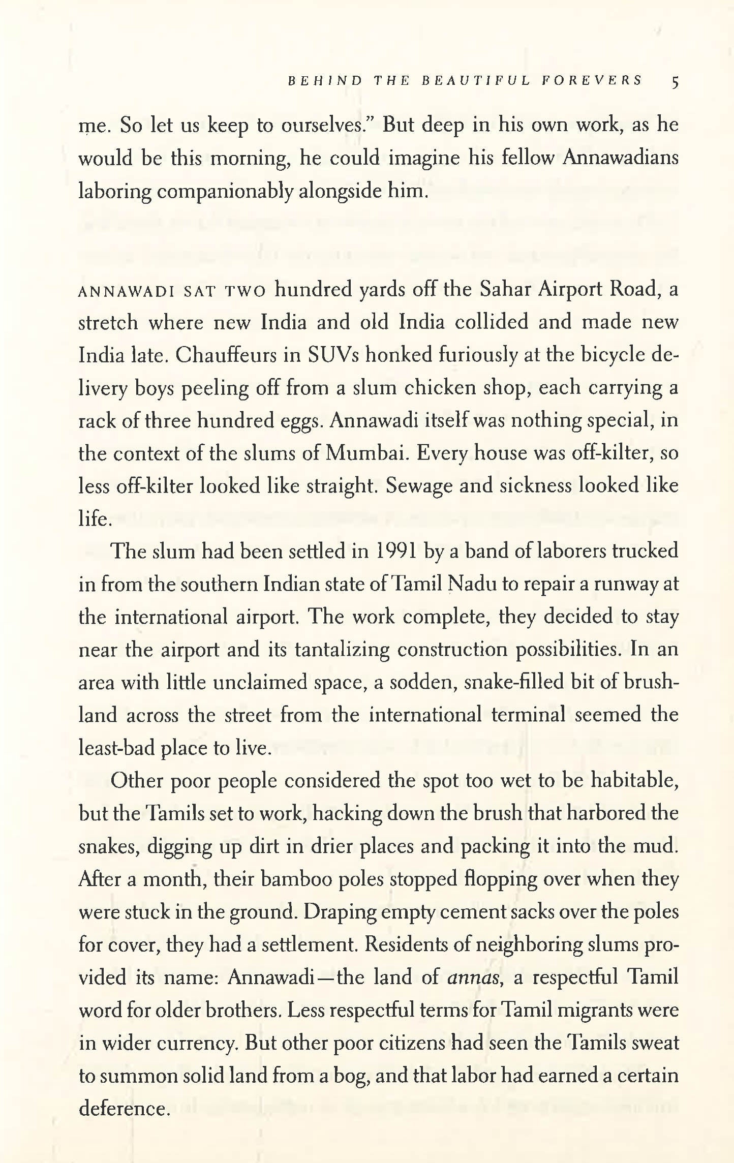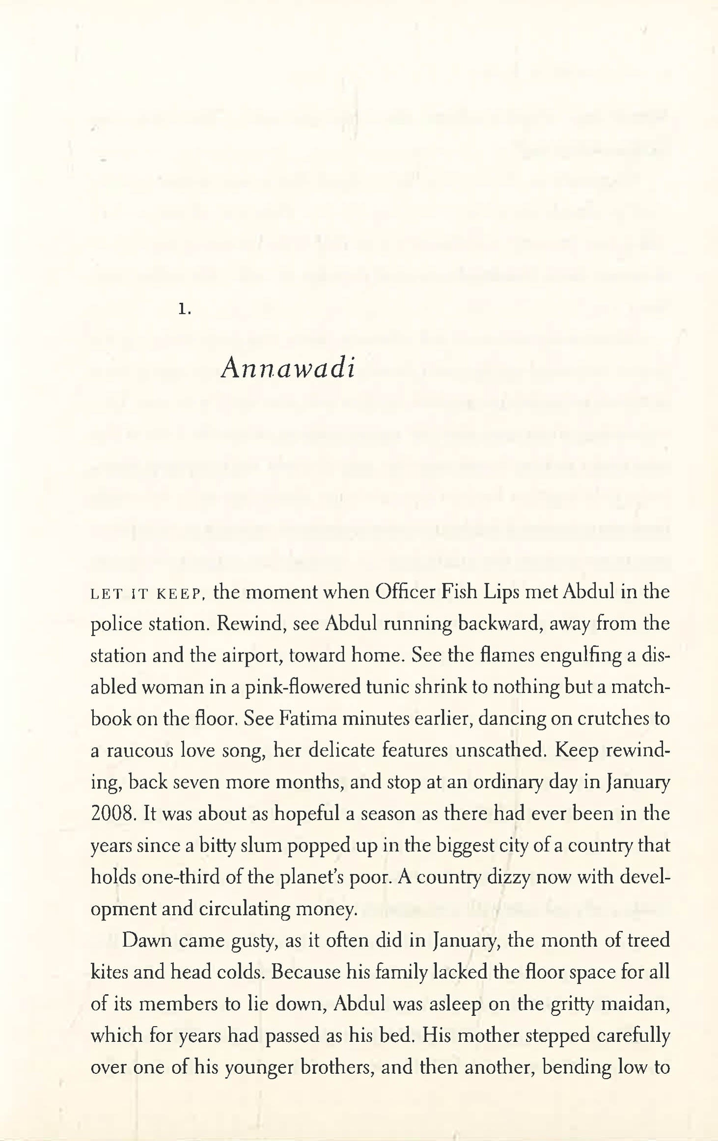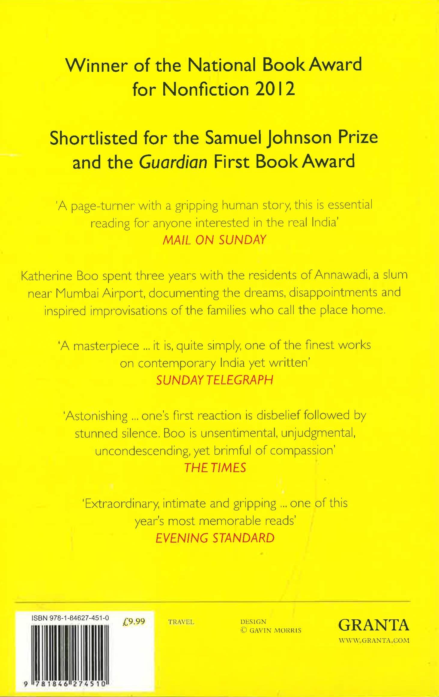 Annawadi is a slum at the edge of Mumbai Airport, in the shadow of shining new luxury hotels. Its residents are garbage recyclers and construction workers, economic migrants, all of them living in the hope that a small part of India's booming future will eventually be theirs. But when a crime rocks the slum community and global recession and terrorism shocks the city, tensions over religion, caste, sex, power, and economic envy begin to turn brutal. As Boo gets to know those who dwell at Mumbai's margins, she evokes an extraordinarily vivid and vigorous group of individuals flourishing against the odds amid the complications, corruptions and gross inequalities of the new India.