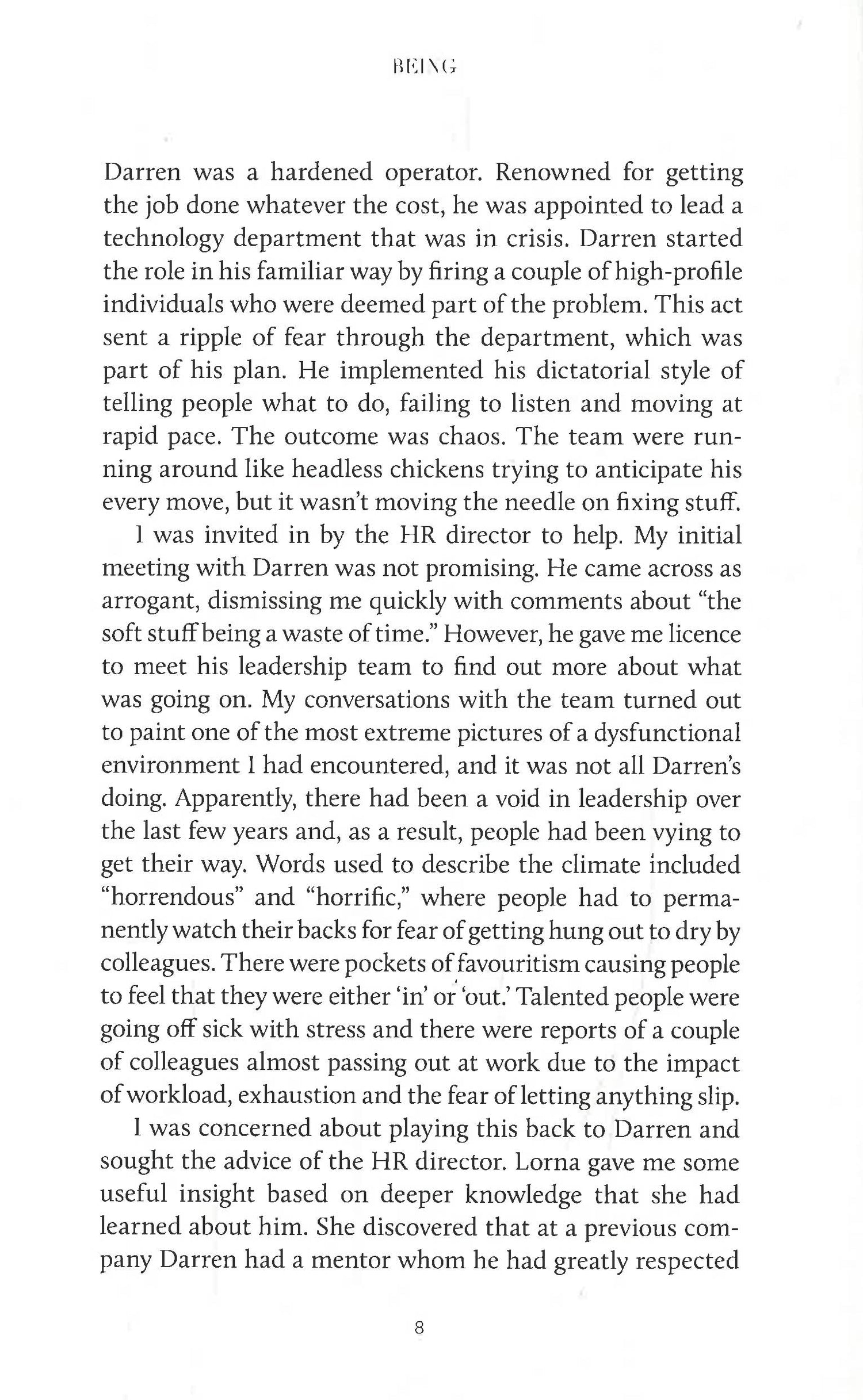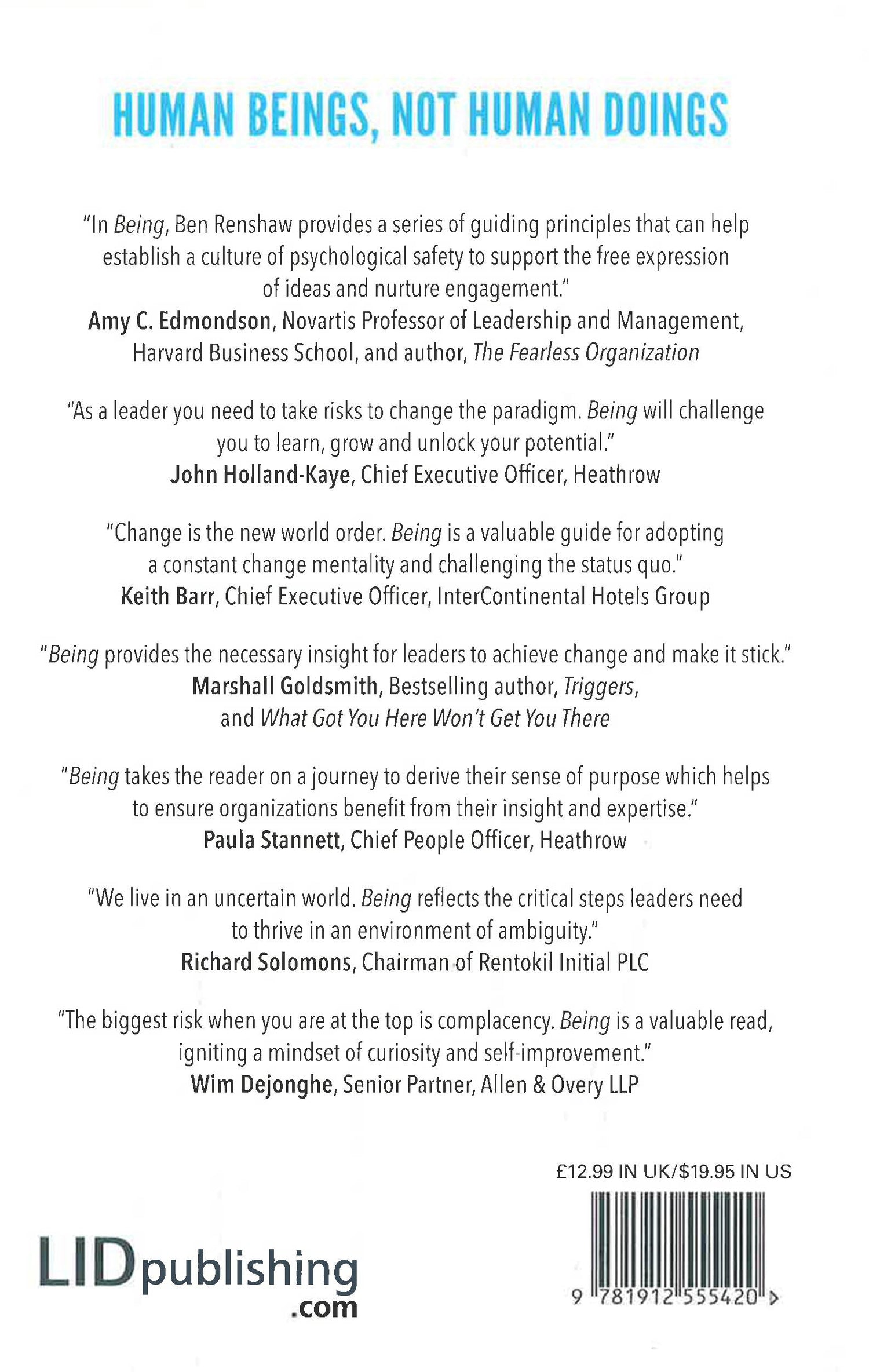We can often become governed by our 'to do' lists and forget that we are human 'beings', not human 'doings'. Doing is important, but it is not why we exist. In a world characterized by complexity, ambiguity, disruption and globalization the quality of our being will determine the quality of our experience. This is true in all walks of life but has heightened significance in the leadership domain. As a leader, the risk of being dominated by 'doing' can cause you to lose touch with the essential qualities required to provide great leadership. In Being, popular author and leadership coach Ben Renshaw blends six principles with compelling calls to action. Drawing upon engaging stories and rich insight from interviewing C-suite leaders across a range of sectors, the author reveals the few core truths required to lead in an age of fast change.