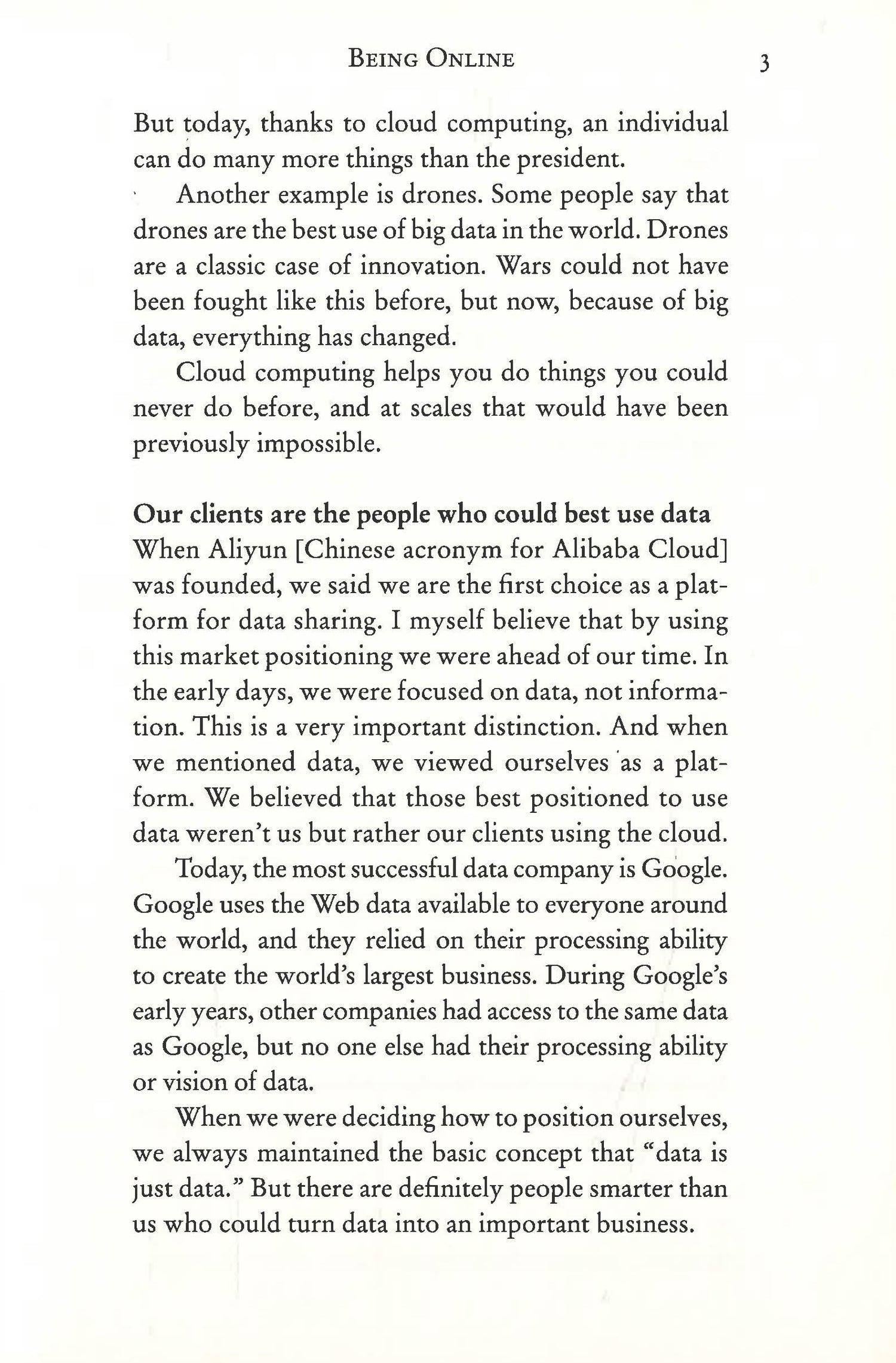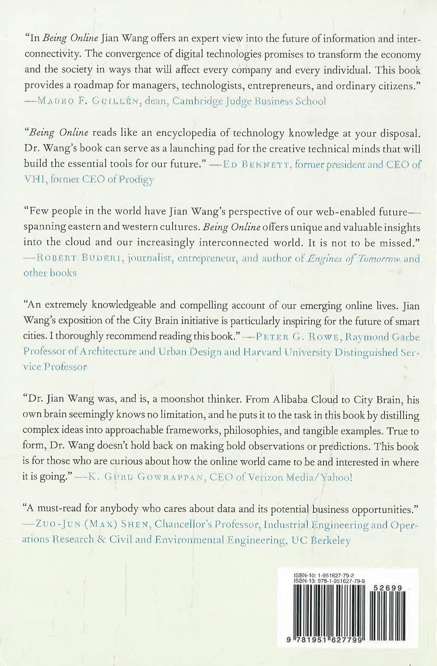 A pioneer of cloud computing and big data offers his vision of the future world taking shape around us. Jian Wang was the founder and architect of Alibaba's cloud and has been the driving force behind its technology innovations. He was also the founder of the City Brain initiative to develop a new digital infrastructure for sustainable cities. Being Online is his meditation on the moment we are in, as the digital era shifts to the internet era, spawning new innovations at a seemingly dizzying pace: cloud computing, 5G, artificial intelligence, big data, wearables, robots, virtual reality, the internet of things, blockchain, and more. For Wang, the invisible hand that connects them is being online. The conjunction of computing, data, and the internet has erased the difference between being online and off. When computing can be done in the cloud, it is on the road to becoming a utility. When data is connected, making it big, its usefulness multiplies exponentially in unforeseeable ways, as does its value. This moment will be as transformative for humanity as Henry Ford's production line. Data is changing the nature of business. Computing is reshaping the economy. The cloud will help us do things we could never do before, at scales that were previously impossible. It will reshape our vision of the world, as electrification once did and, more recently, the transition from analog to digital. While telling the story of Alibaba’s breakthroughs and the development of his own understanding of the internet, Jian Wang's visionary book lays out the implications of this shift and how to think about being online.