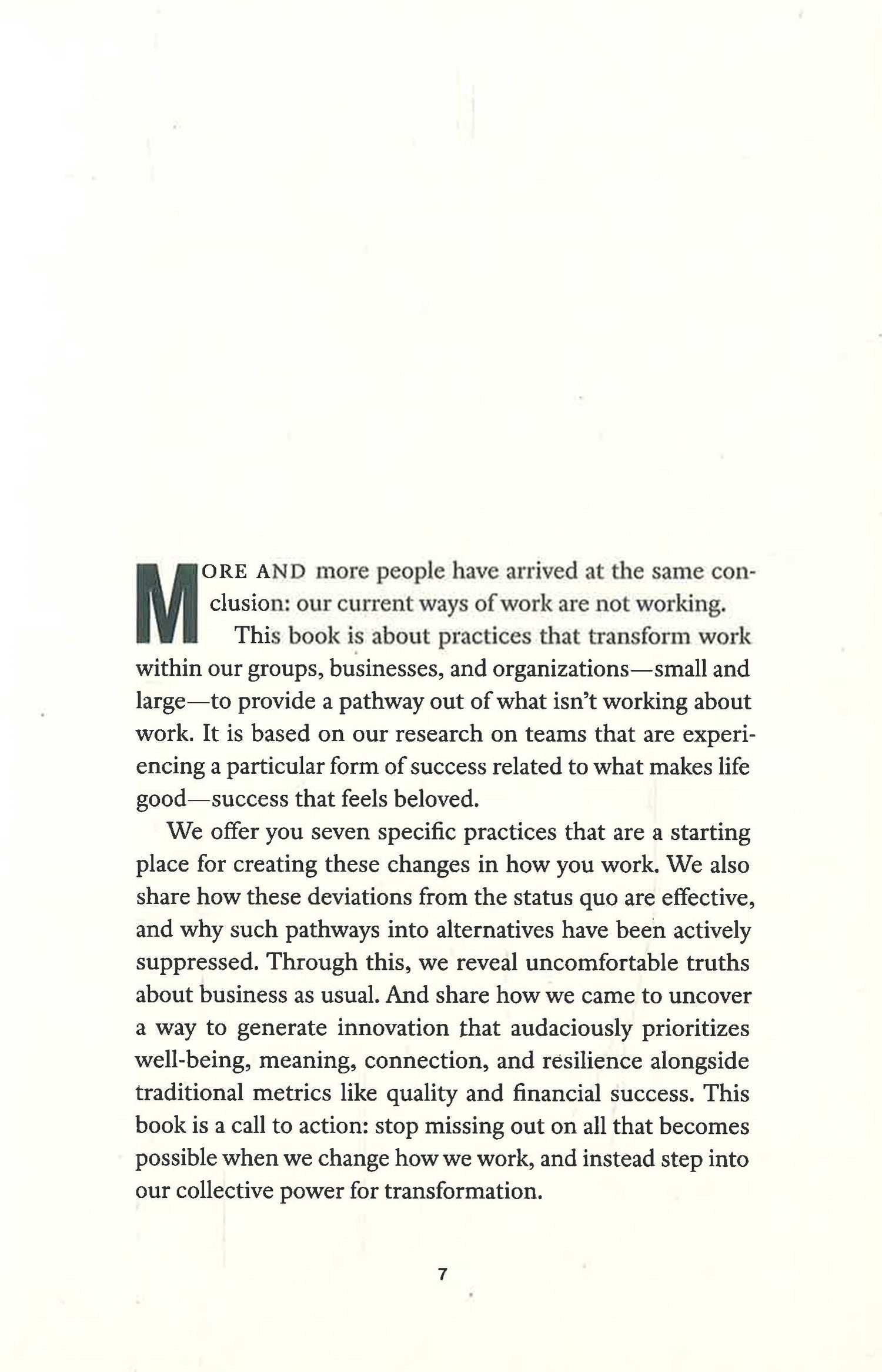Based on five years of data, Beloved Economies offers seven practices for individuals who are part of teams within enterprises―from businesses to nonprofits, farms, and after-school groups―to build economic realities of more purpose, meaning, and joy. These seven practices are: