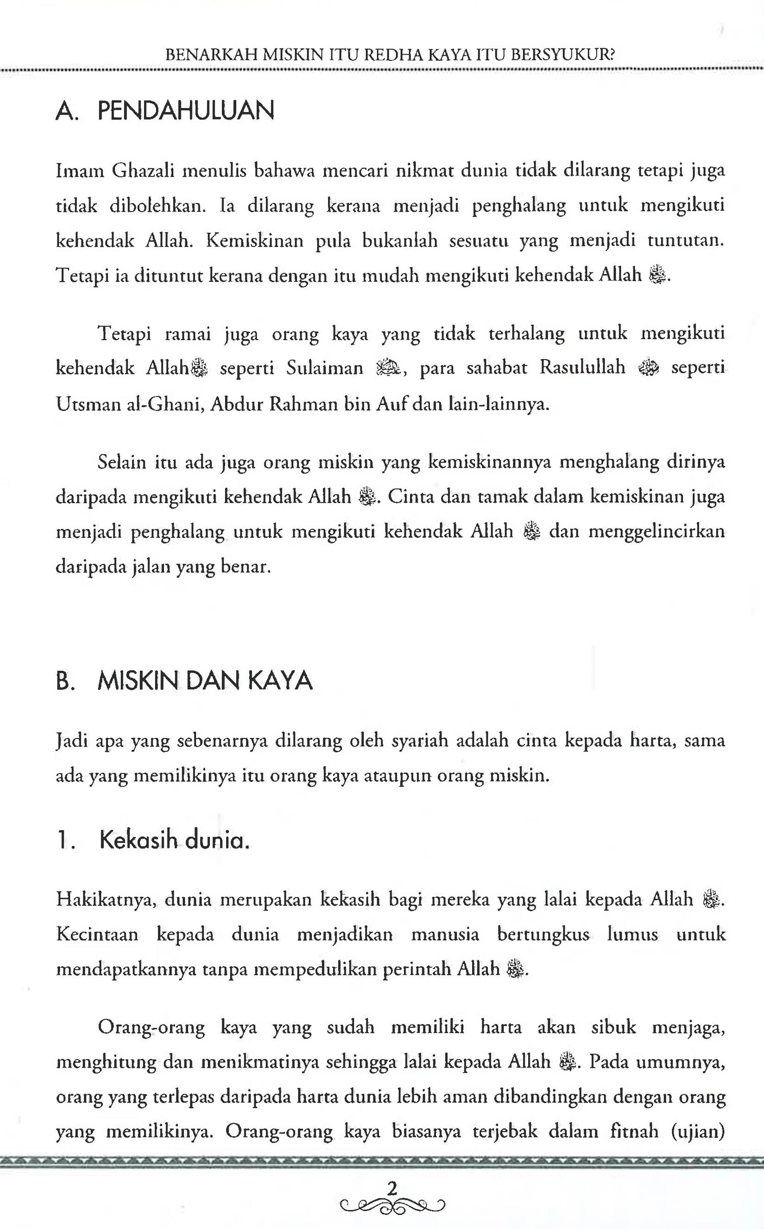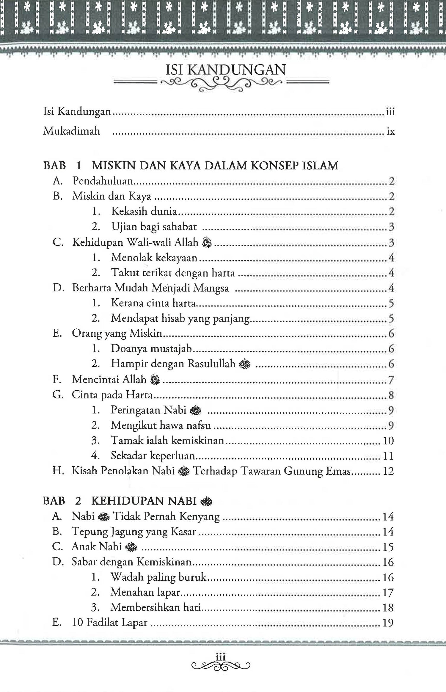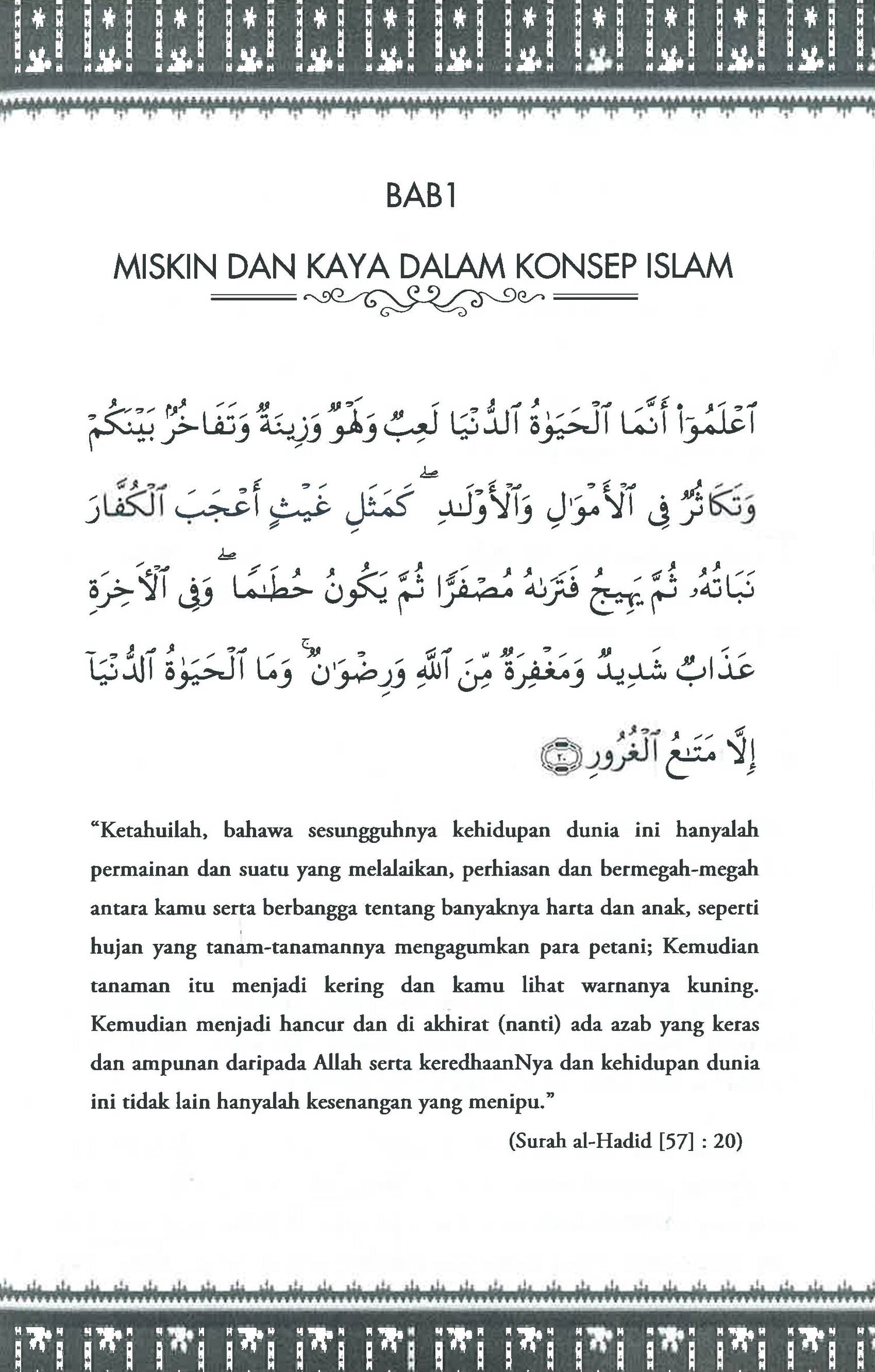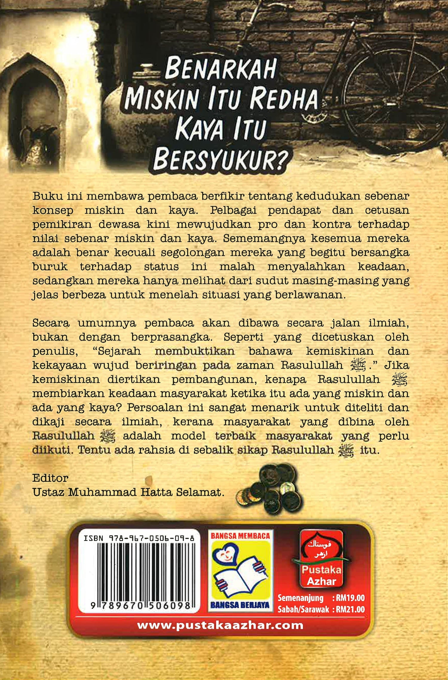 Buku ini membawa pembaca berfikir tentang kedudukan sebenar konsep miskin dan kaya. Pelbagai pendapat dan cetusan pemikiran dewasa kini mewujudkan pro dan kontra terhadap nilai sebenar miskin dan kaya. Sememangnya kesemua mereka adalah benar kecuali segolongan mereka yang begitu bersangka buruk terhadap status ini malah menyalahkan keadaan sedangkan mereka hanya melihat dari sudut masing-masing yang jelas berbeza untuk menelah situasi yang berlawanan