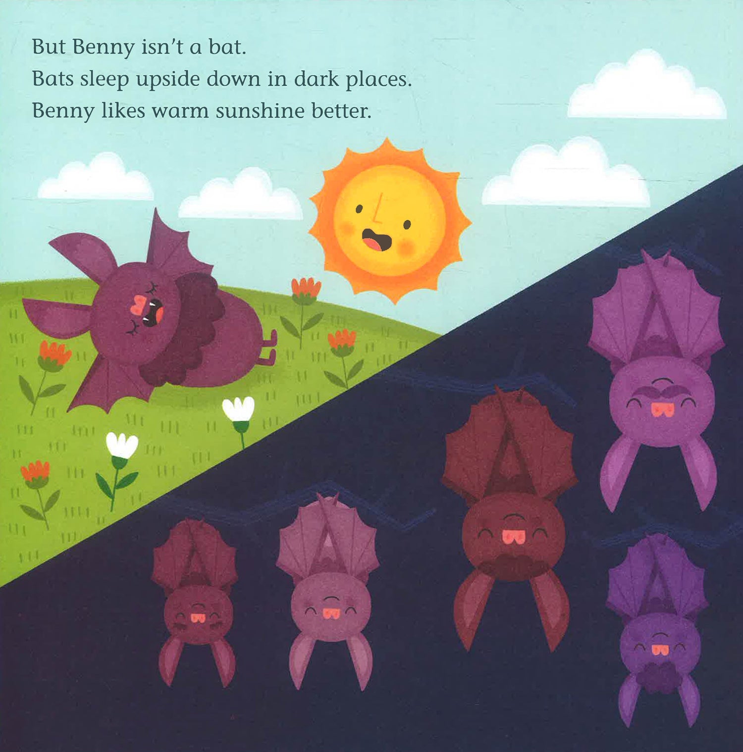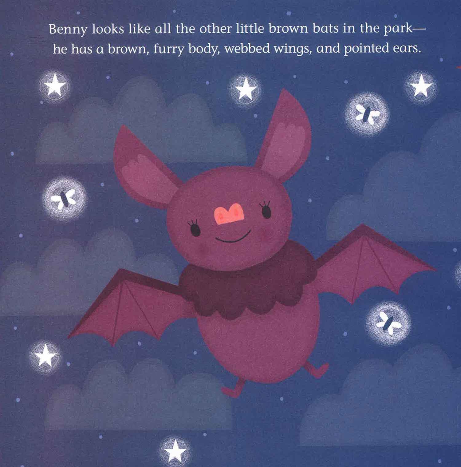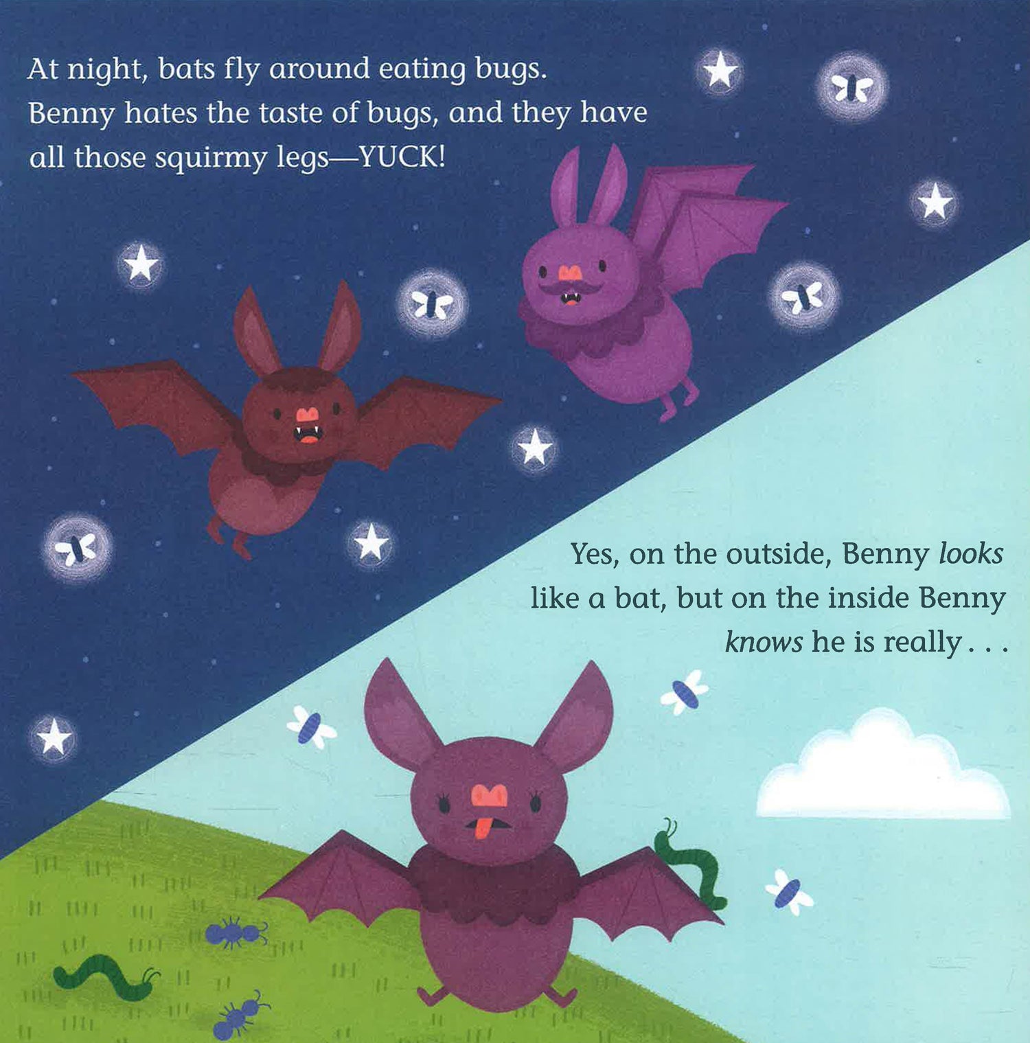 Benny may look like a bat, but Benny doesn’t like flying at night, or eating bugs, or hanging upside down. Benny does like sunshine and fluttering and colorful wings. On the inside, Benny knows he is a butterfly!