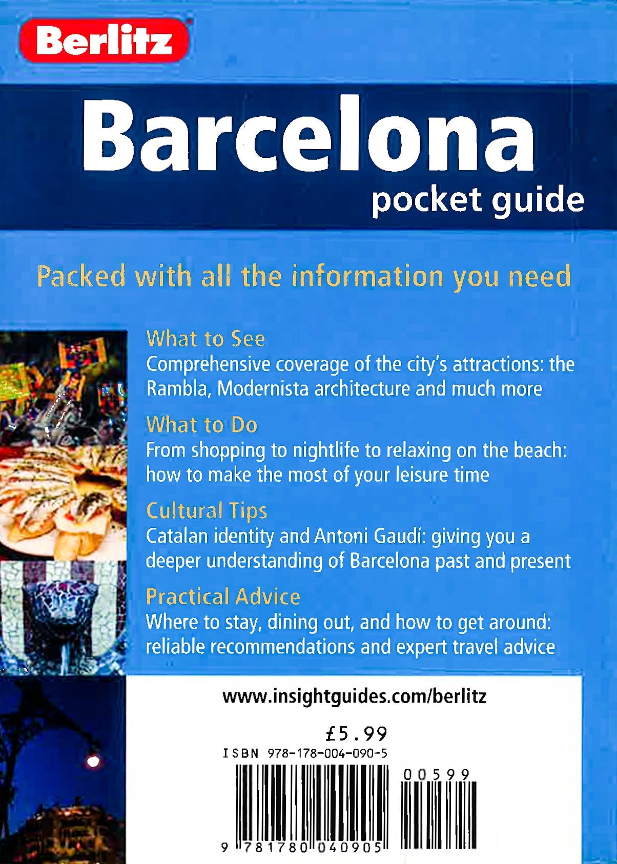 "Berlitz Pocket Guide Barcelona" is a concise, full-colour travel guide that combines lively text with vivid photography to highlight the very best that this vibrant city has to offer. The Where To Go chapter details all the key sights, from the dazzling architecture of Gaudi's Sagrada Familia and the modernista buildings for which the city is famous, to the old Gothic Quarter, the Palau Nacional housing 1,000 years of Catalan art, and the attractive waterfront and beaches. Excursions to Montserrat, Sitges and the nearby Penedes wine region offer diverse day trip ideas. Handy maps on the cover help you get around with ease. To inspire you, the book offers a rundown of the Top 10 Attractions in Barcelona, followed by an itinerary for a Perfect Day in the city. The What to Do chapter is a snapshot of ways to spend your spare time, from browsing in markets and state-of-the-art interior design shops to sipping cocktails until the small hours, catching a fiesta and taking a cycling tour. You'll also be armed with background information, including a brief history of Barcelona and an Eating Out chapter covering its mouth-watering Catalan cuisine. There are carefully chosen listings of the best hotels and restaurants, and an A-Z to equip you with all the practical information you will need.