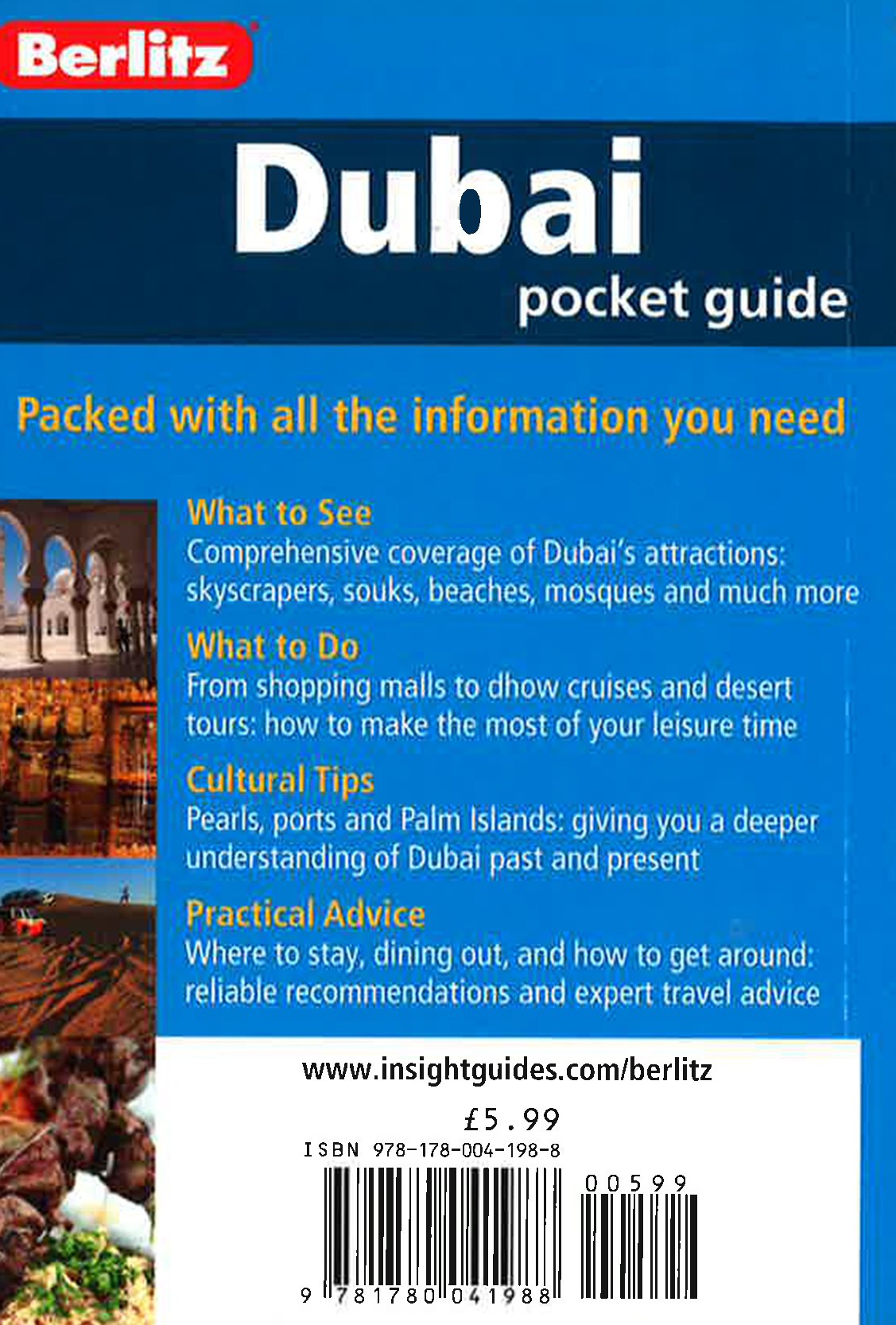 Berlitz Pocket Guide Dubai is a concise, full-colour travel guide that combines lively text with vivid photography to highlight the very best that this ever-changing city has to offer. The Where To Go chapter details all the key sights, from modern icons such as the seven-star Burj Al Arab and the world's tallest building, the Burj Khalifa, to the more traditional attractions such as the Gold Souk and historic Bastakiya. There are also excursions into the desert, Al Ain and even nearby Abu Dhabi. Handy maps on the cover help you get around with ease. To inspire you, the book offers a rundown of the Top 10 Attractions in the city, followed by an itinerary for a Perfect Day in Dubai. The What to Do chapter is a snapshot of ways to spend your spare time, including shopping in the city's opulent malls and atmospheric souks, taking in the horse racing and hitting Dubai's famous clubs and bars. You'll also be armed with background information, including a brief history of the city and an Eating Out chapter covering its cosmopolitan cuisine. There are carefully chosen listings of the best hotels and restaurants, and an A-Z to equip you with all the practical information you will need.