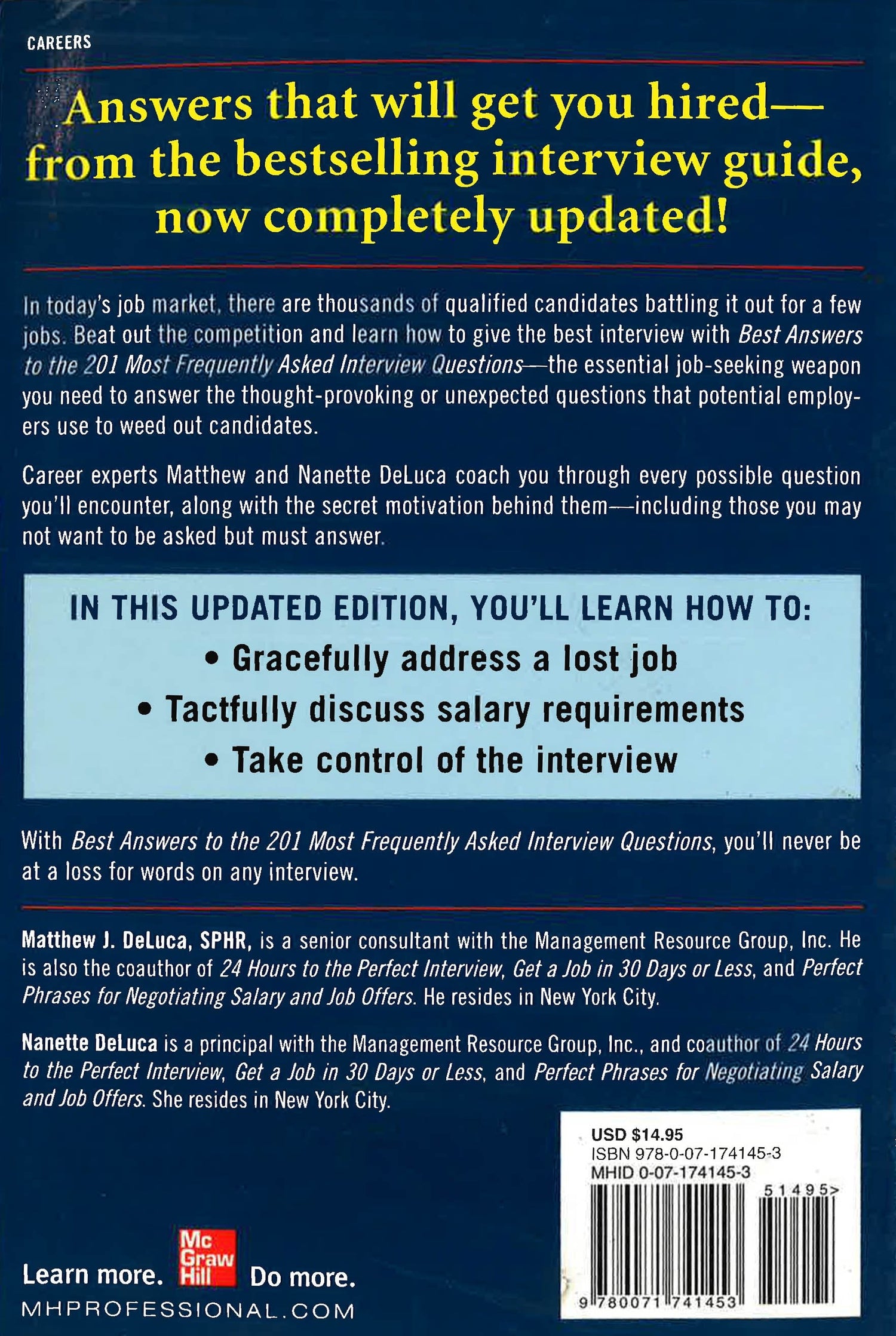 With Best Answers to the 201 Most Frequently Asked Interview Questions, you'll never be at a loss for words on any interview. Matt DeLuca, SPHR (New York, NY) is a Senior Consultant with the Management Resource Group, Inc. Matt is also the author/coauthor of 24 Hours to the Perfect Interview, Get a Job in 30 Days or Less, and Perfect Phrases for Negotiating Salary and Job Offers.Nanette DeLuca (New York, NY) is a Principal with the Management Resource Group, Inc., and coauthor of 24 Hours to the Perfect Interview, Get a Job in 30 Days or Less, and Perfect Phrases for Negotiating Salary and Job Offers.