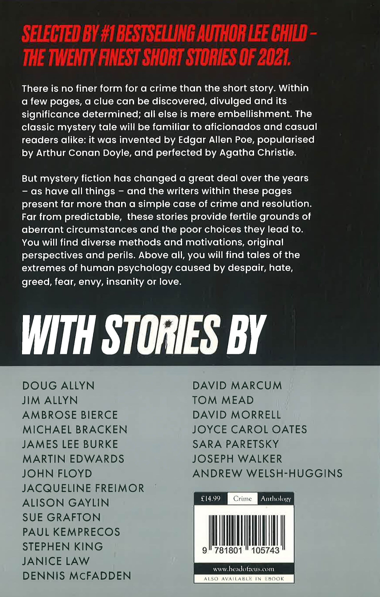 Selected by #1 bestselling author Lee the twenty finest short stories of 2021. .Selected by #1 bestselling author Lee the twenty finest short stories of 2021.There is no finer form for a crime than the short story. WIthin a few pages, a clue can be discovered, divulged and its significance determined; all else is mere embellishment. The classic mystery tale will be familiar to aficionados and casual readers it was invented by Edgar Allen Poe, popularised by Arthur Conan Doyle, and perfected by Agatha Christie.But mystery fiction has changed a great deal over the years – as have all things – and the writers within these pages present far more than a simple case of crime and resolution. Far from predictable, these stories provide fertile grounds of aberrant circumstances and the poor choices they lead to. You will find diverse methods and motivations, original perspectives and perils. Above all, you will find tales of the extremes of human psychology caused by despair, hate, greed, fear, envy, insanity or love.Featuring stories Doug Allyn, Jim Allyn, Ambrose Bierce, Michael Bracken, James Lee Burke, Martin Edwards, John Floyd, Jacqueline Freimor, Alison Gaylin, Sue Grafton, Paul Kemprecos, Stephen King, Janice Law, Dennis McFadden, David Marcum, Tom Mead, David Morrell, Joyce Carol Oates, Sara Paretsky, Joseph Walker, Andrew Welsh-Huggins.