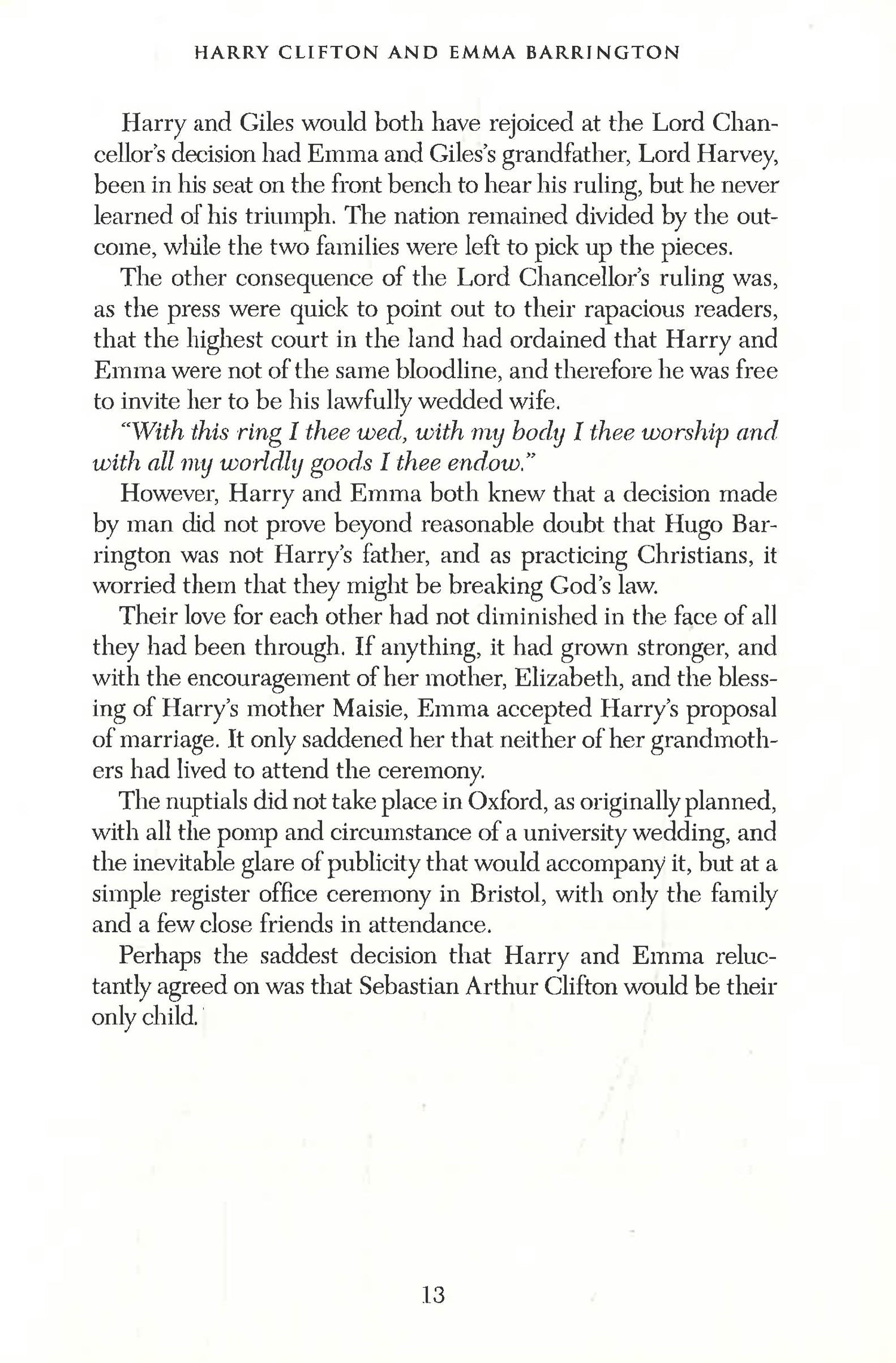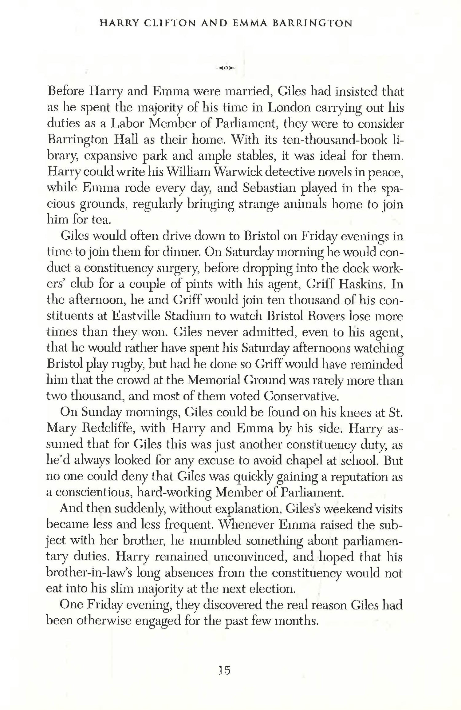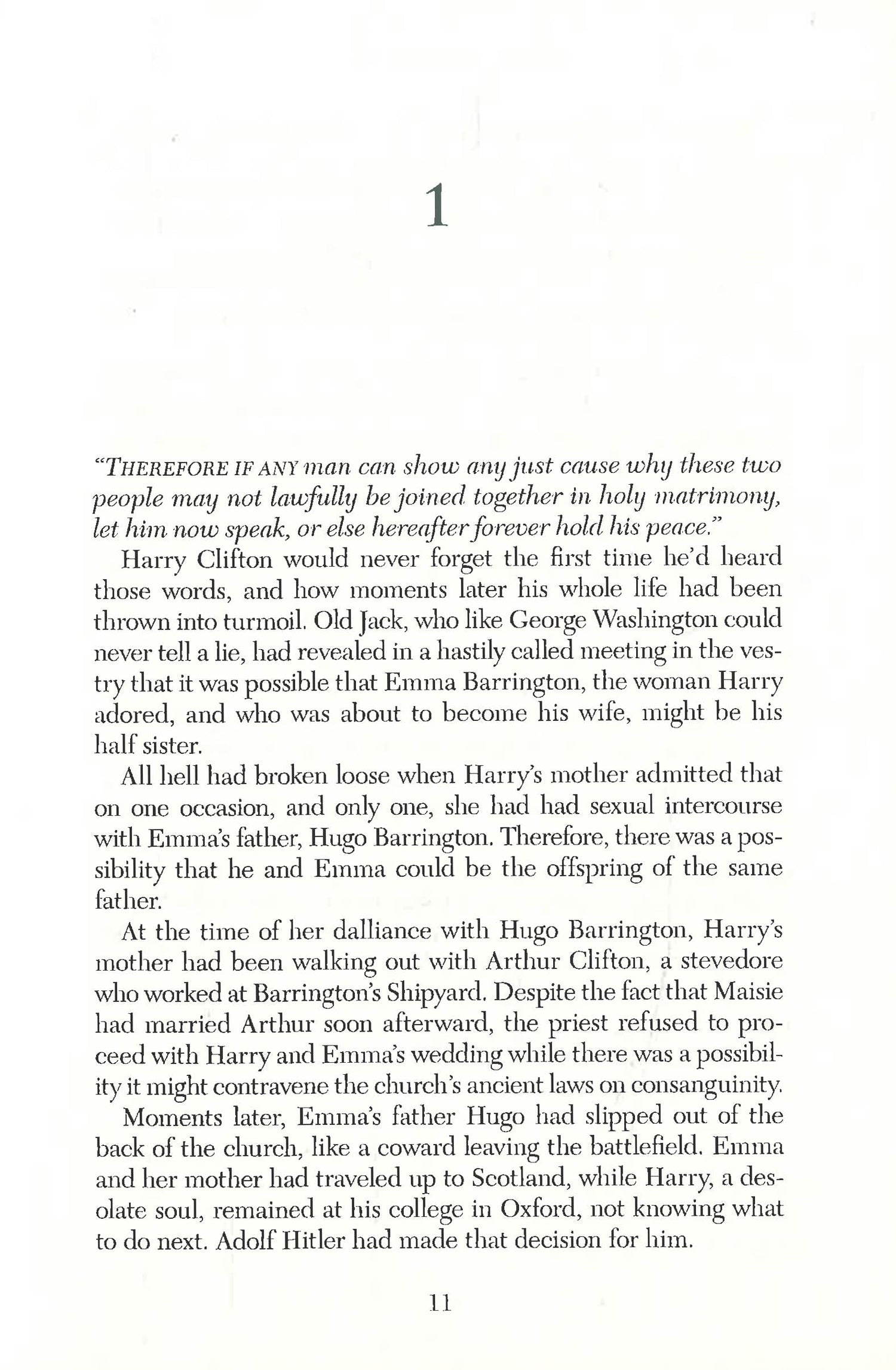 1945, London. The vote in the House of Lords as to who should inherit the Barrington family fortune has ended in a tie. The Lord Chancellor's deciding vote will cast a long shadow on the lives of Harry Clifton and Giles Barrington. Harry returns to America to promote his latest novel, while his beloved Emma goes in search of the little girl who was found abandoned in her father's office on the night he was killed. When the general election is called, Giles Barrington has to defend his seat in the House of Commons and is horrified to discover who the Conservatives select to stand against him. But it is Sebastian Clifton, Harry and Emma's son, who ultimately influences his uncle's fate.