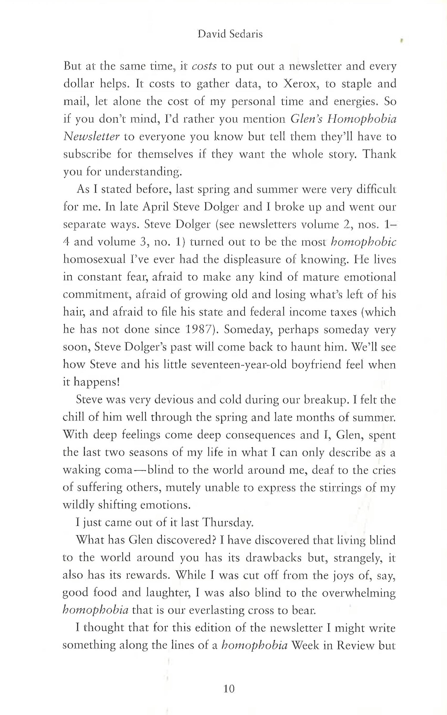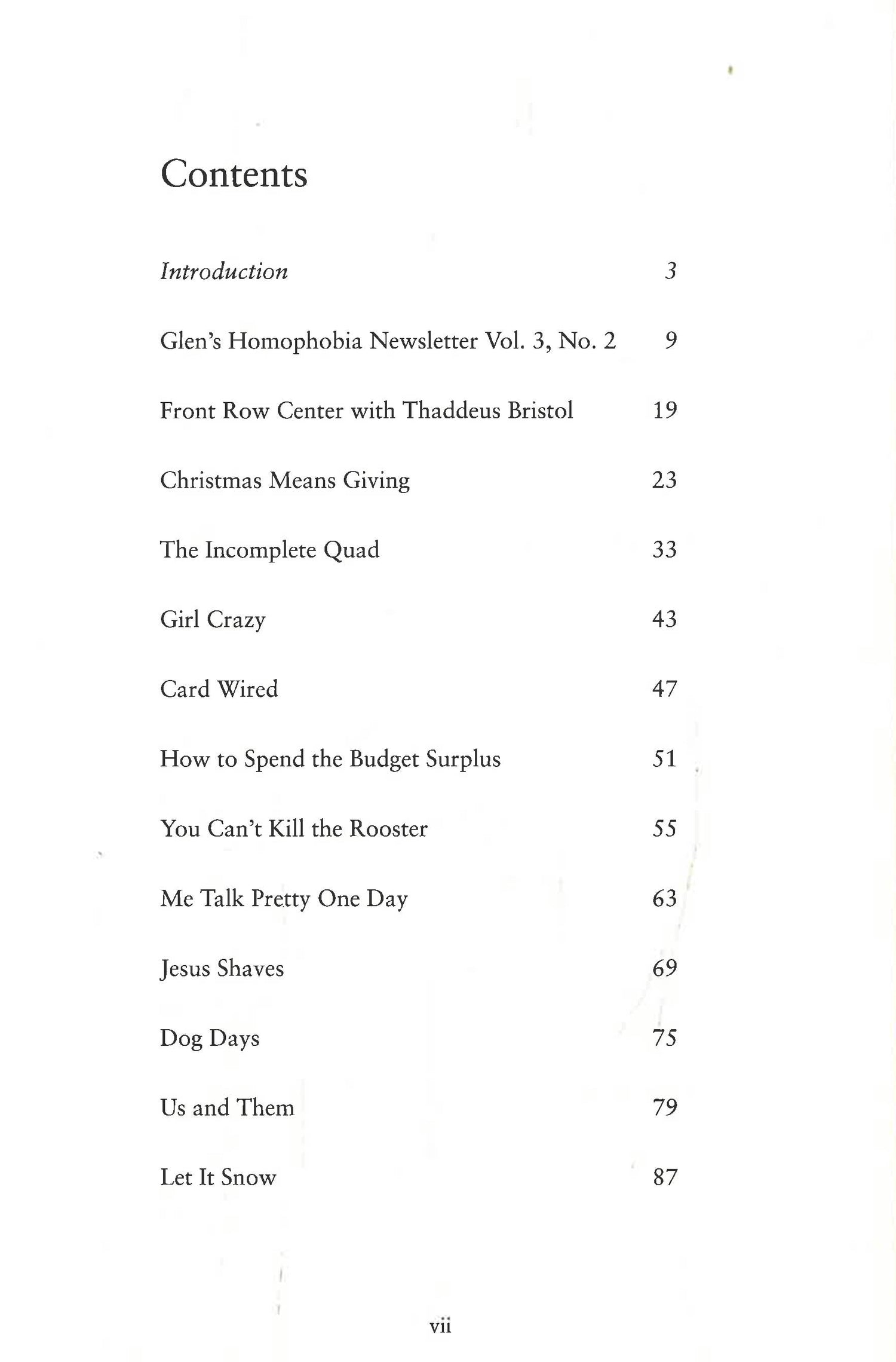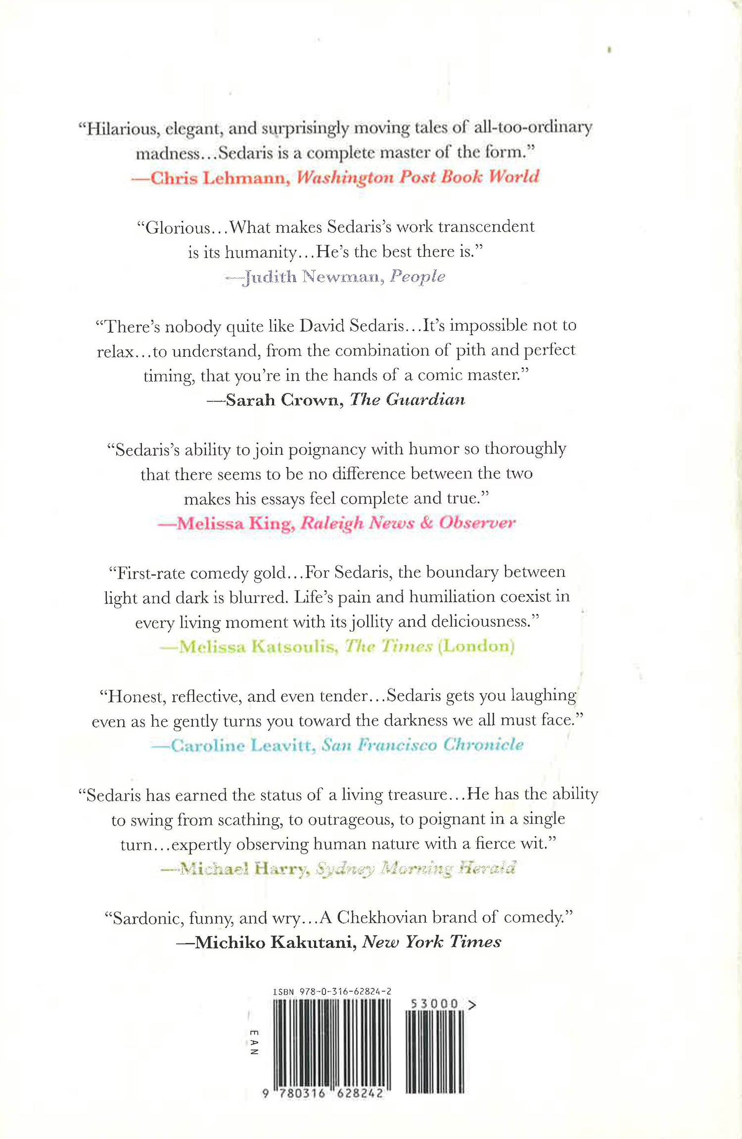 Now, for the first time collected in one volume, the author brings us his funniest and most memorable work. In these stories, Sedaris shops for rare taxidermy, hitchhikes with a lady quadriplegic, and spits a lozenge into a fellow traveler's lap. He drowns a mouse in a bucket, struggles to say "give it to me" in five languages, and hand-feeds a carnivorous bird.