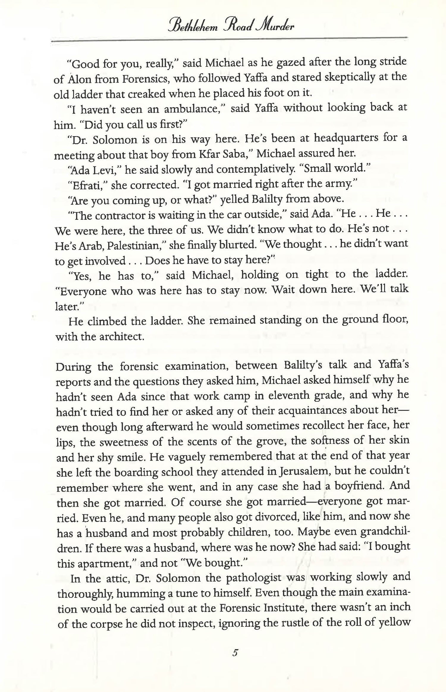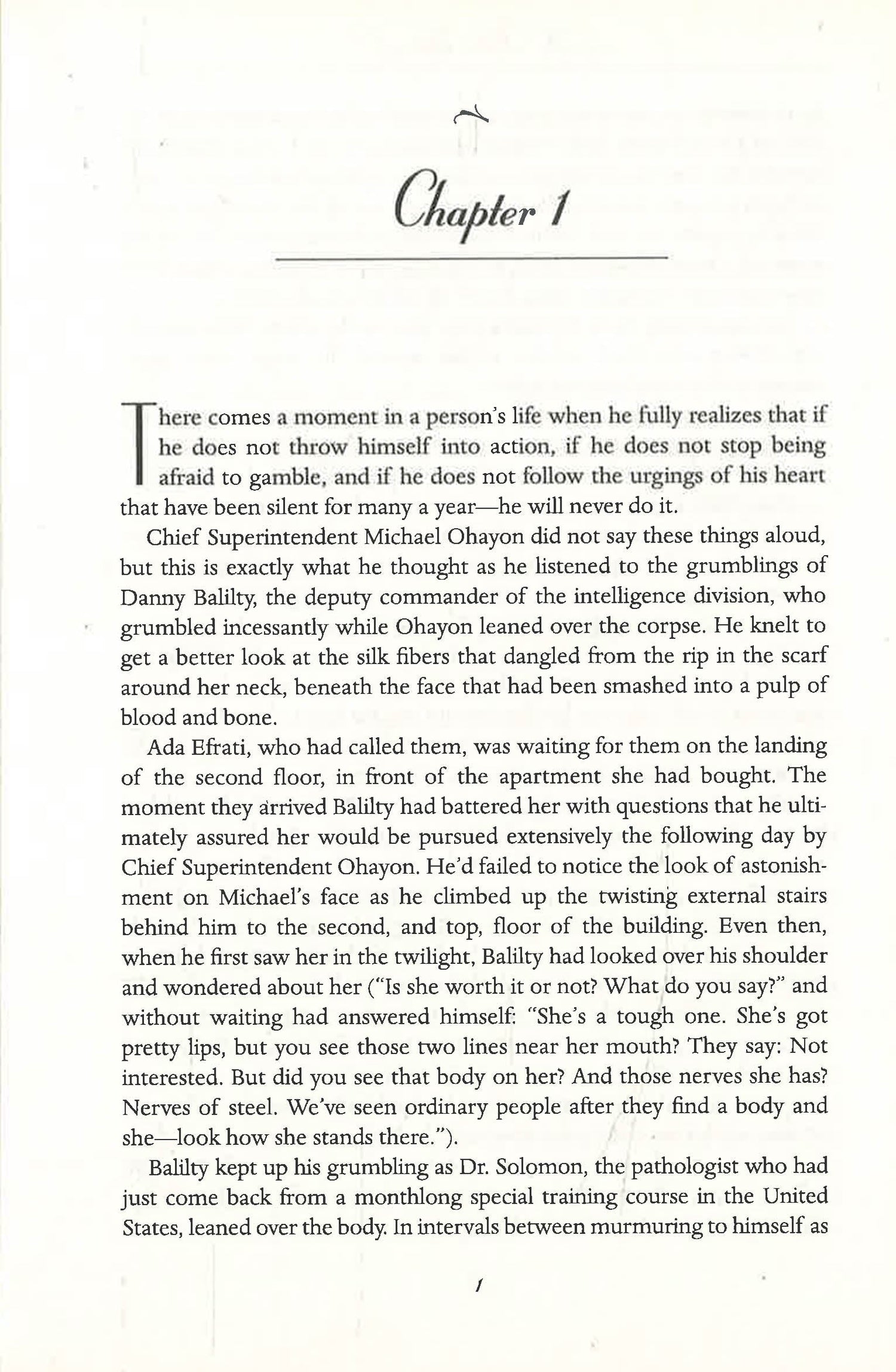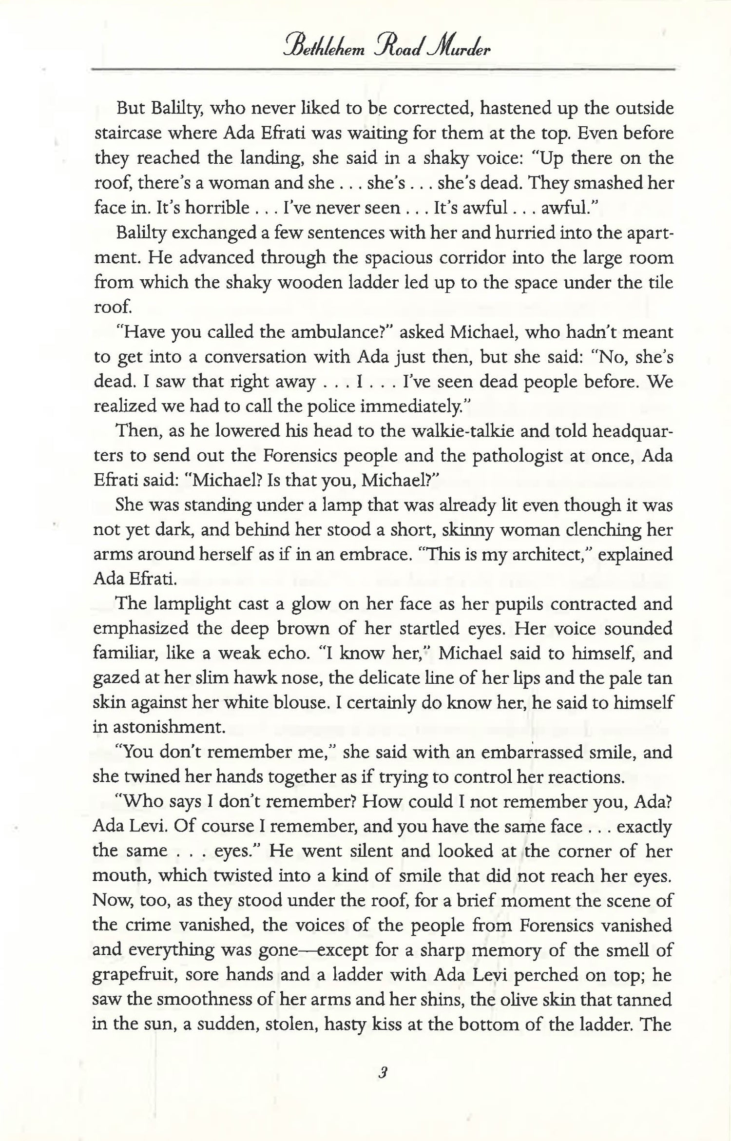 The body of a young woman with her face smashed in is discovered in the attic of a house on Bethlehem Street, in the Baka neighborhood of Jerusalem. Chief Superintendent Michael Ohayon is called to the scene of the crime where, beyond the usual horror, an old love and an unfinished romance await him.