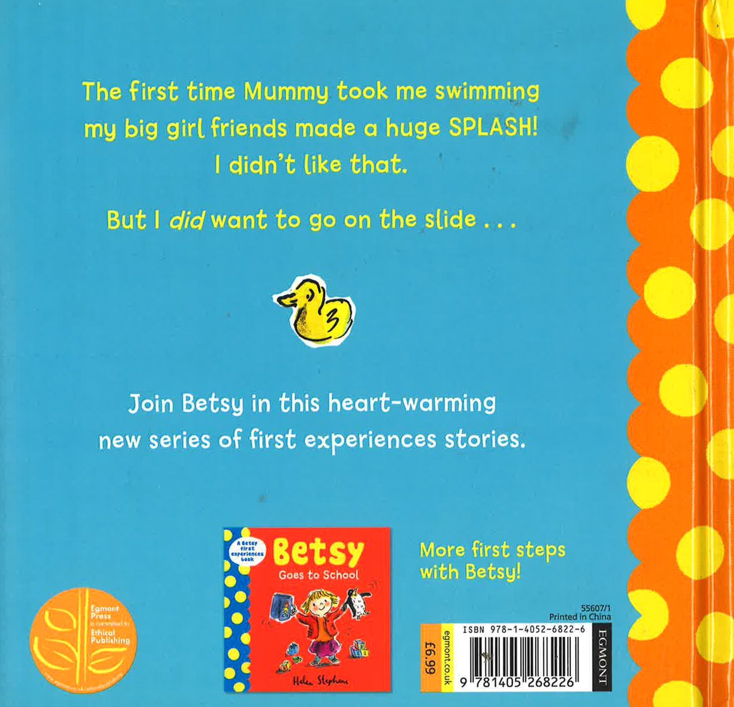 From Helen Stephens, author and illustrator of How to Hide a Lion, Fleabag, and Gracie Grabbit and the Tiger, comes a brilliant first experiences series, perfect for children aged 2+. Betsy is excited about doing new things. Today she is going to the swimming pool for the first time. There are so many things to see! There is a big slide and Betsy's big girl friends, Holly and Poppy are at the pool too. But they jump in and make a big splash. Betsy isn't sure she likes it. Will Betsy find the courage to go down the slide? These fun, reassuring and heart-warming stories are great for introducing concepts. Little ones will love relating to Betsy's early experiences.