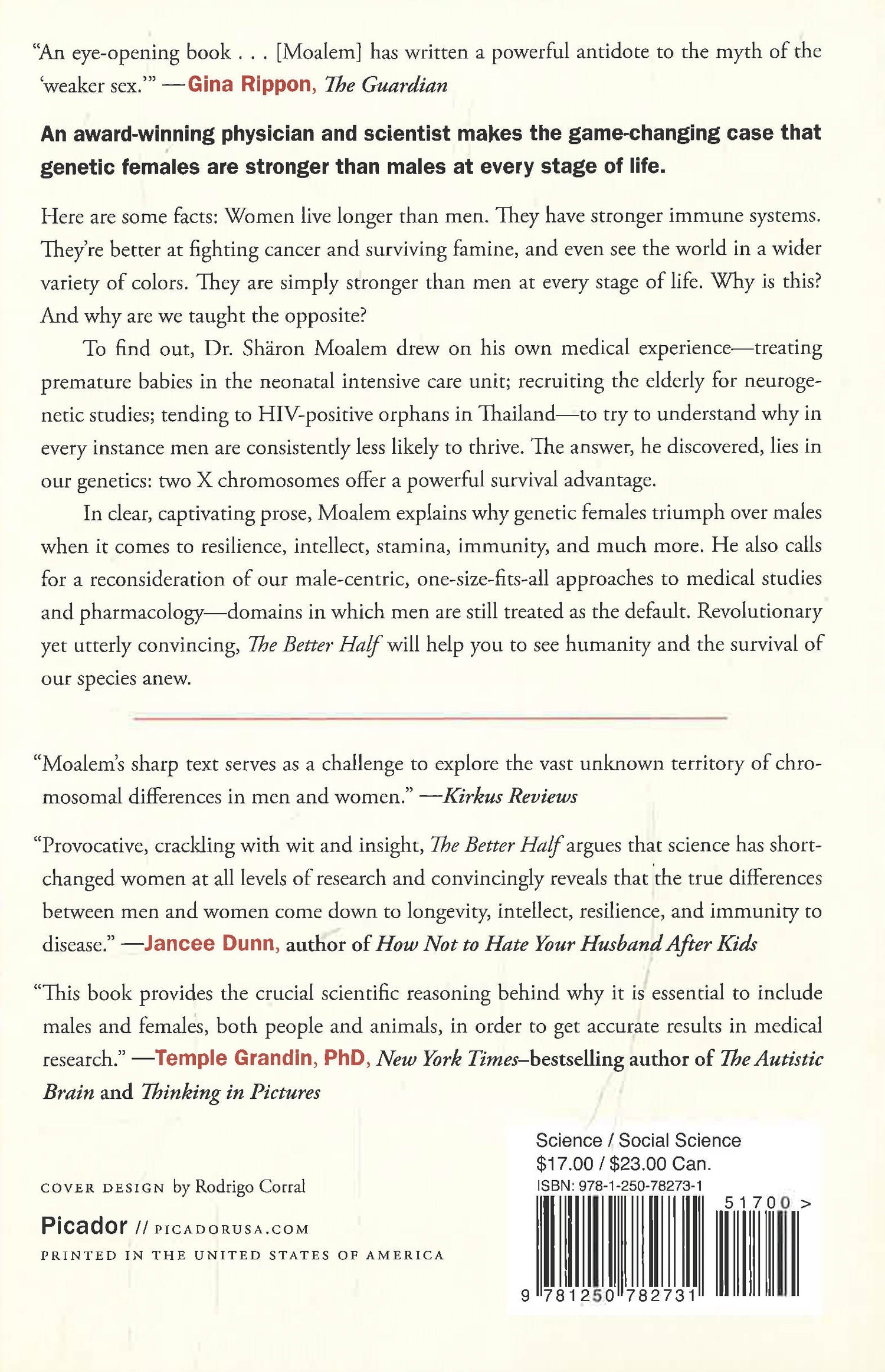 With clear, captivating prose that weaves together eye-opening research, case studies, diverse examples ranging from the behavior of honeybees to American pioneers, as well as experiences from his personal life and his own patients, Moalem explains why genetic females triumph over males when it comes to resiliency, intellect, stamina, immunity and much more. He also calls for a reconsideration of our male-centric, one-size-fits-all view of medical studies and even how we prescribe medications - a view that still sees women through the lens of men.