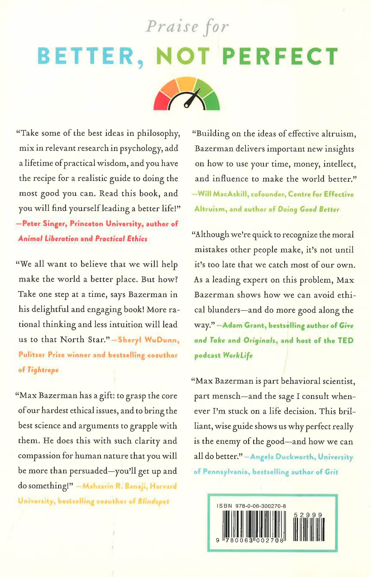 *** Distinguished Winner for the Responsible Research in Management Award ***Negotiation and decision-making expert Max Bazerman explores how we can make more ethical choices by aspiring to be better, not perfect.Every day, you make hundreds of decisions. They're largely personal, but these choices have an ethical twinge as well; they value certain principles and ends over others. Bazerman argues that we can better balance both dimensions-and we needn't seek perfection to make a real difference for ourselves and the world.Better, Not Perfect provides a deeply researched, prescriptive roadmap for how to maximize our pleasure and minimize pain. Bazerman shares a framework to be smarter and more efficient, honest and aware-to attain your "maximum sustainable goodness." In Part Two, he identifies four training grounds to practice these newfound skills for outsized impact: how you think about equality and your tribe(s); waste-from garbage to corporate excess; the way you spend time; and your approach to giving-whether your attention or your money. Ready to nudge yourself toward better, Part Three trains your eye on how to extend what you've learned and positively influence others.Melding philosophy and psychology as never before, this down-to-earth guide will help clarify your goals, assist you in doing more good with your limited time on the planet, and see greater satisfaction in the process.