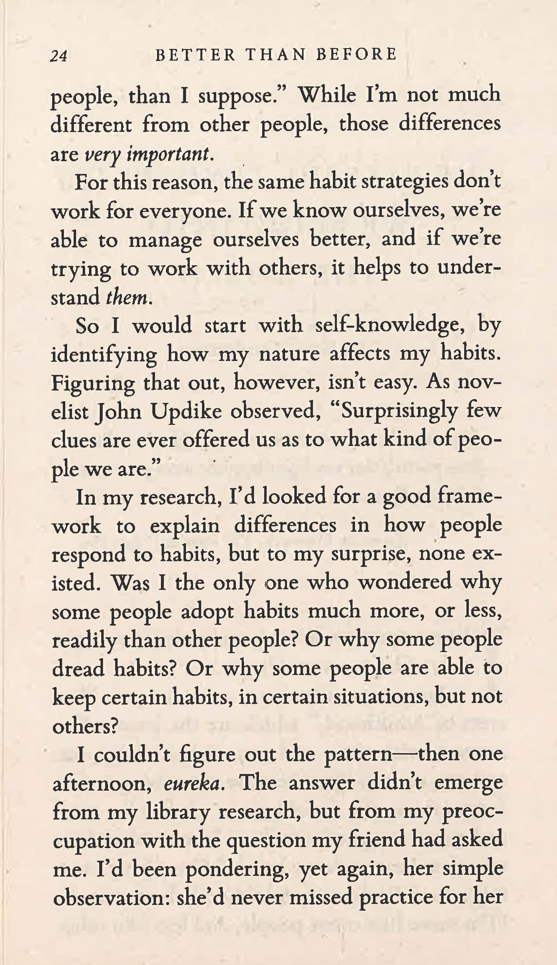 New York Times Bestseller Washington Post Bestseller The author of the blockbusterNew York Timesbestsellers,The Happiness ProjectandHappier at Home,tackles the critical question:How do we change? Gretchen Rubin's answer: through habits. Habits are the invisible architecture of everyday life.It takes work to make a habit, but once that habit is set, we can harness the energy of habits to build happier, stronger, more productive lives. So if habits are a key to change, then what we really need to know is: How do we change our habits? Better than Before answers that question. It presents a practical, concrete framework to allow readers to understand their habitsand to change them for good. Infused with Rubins compelling voice, rigorous research, and easy humor, and packed with vivid stories of lives transformed, Better than Before explains the (sometimes counter-intuitive) core principles of habit formation. Along the way, Rubin uses herself as guinea pig, tests her theories on family and friends, and answers readers most pressing questionsoddly, questions that other writers and researchers tend to ignore: Why do I find it tough to create a habit for something Iloveto do? Sometimes I can change a habit overnight, and sometimes I cant change a habit, no matter how hard I try. Why? How quickly can I change a habit? What can I do to make sure I stick to a new habit? How can I help someone else change a habit? Why can I keep habits that benefit others, but cant make habits that are just for me? Whether readers want to get more sleep, stop checking their devices, maintain a healthy weight, or finish an important project, habits makechange possible. Reading just a few chapters of Better Than Before will make readers eager to start work on their own habitseven before theyve finished the book. From the Hardcover edition.