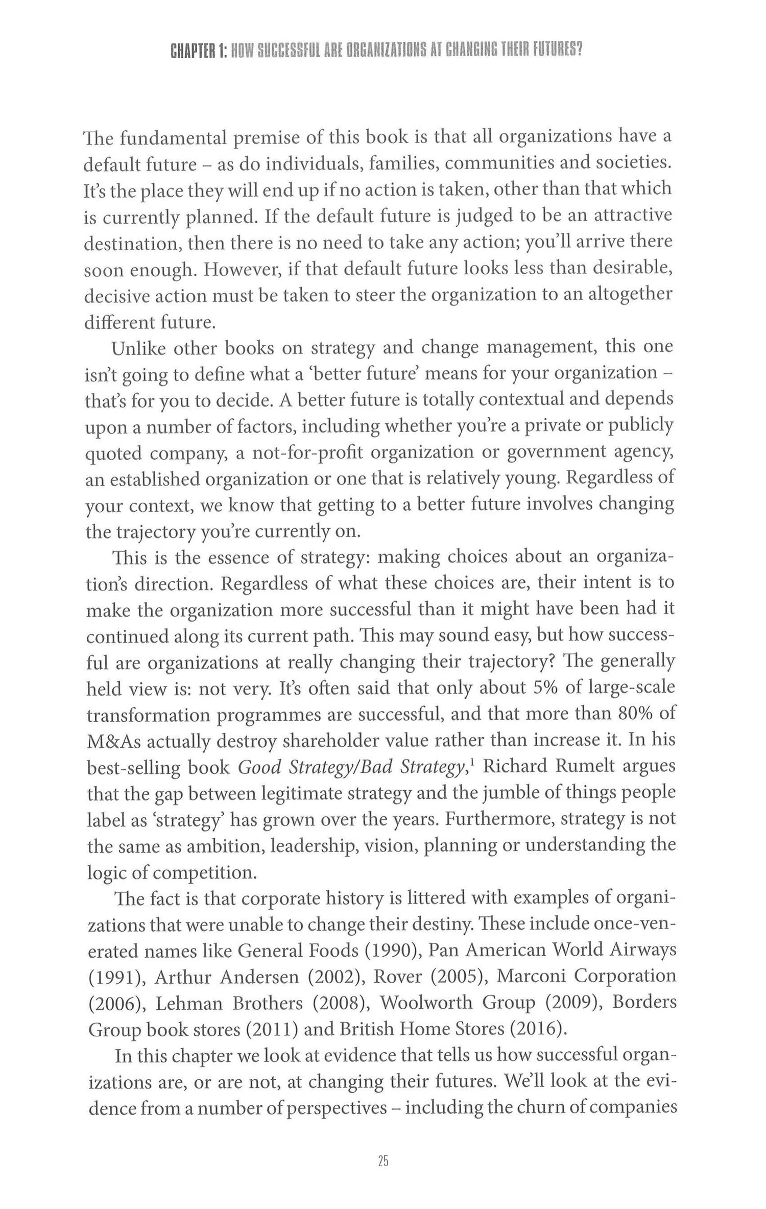 Have you ever wondered where your organisation is headed? Have you ever asked yourself: why is it that some organizations are more successful than others? Management fads can bring some benefit, but they rarely deliver the sustained success their advocates promised. Equally, while the calibre of an organization's leadership is important, along with the strategies they pursue, they in themselves are not the answer the question. This book argues there is something more fundamental at play; something that ultimately determines the destiny of an organization. All companies are on a trajectory - their "default future"; a place they will end up in if they take no action other than that currently planned. Identifying this default future, knowing whether this future is acceptable or not, and what actions to take for an improved future, is the ultimate key to sustaining future success for any business. This book, by two experienced strategy consultants, provides an important perspective on sustaining business success.
