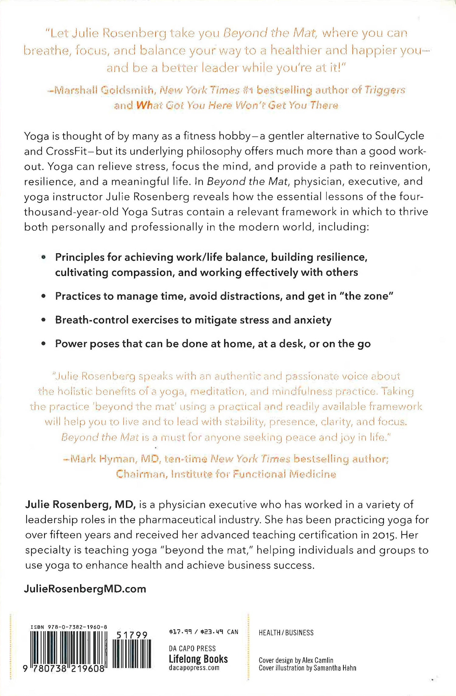 Achieve professional and personal success by following the philosophical principles of yoga, along with powerful poses that can be done at a desk, in flight, or on the goYoga is thought of by many as a fitness hobby--a gentler alternative to SoulCycle and CrossFit--but its underlying philosophy offers much more than a good workout. Yoga can relieve stress, focus the mind, and provide a path to reinvention, resilience, and a meaningful life. In Beyond the Mat, physician, executive, and yoga instructor Julie Rosenberg reveals how the essential lessons of the four-thousand-year-old Yoga Sutras contain a relevant framework in which to thrive both personally and professionally, with:• Principles for achieving work/life balance, building resilience, cultivating compassion, and working effectively with others• Practices to manage time, avoid distractions, and get in "the zone"• Breath-control exercises to mitigate stress and anxiety• Power poses that can be done at home, at a desk, or on the go