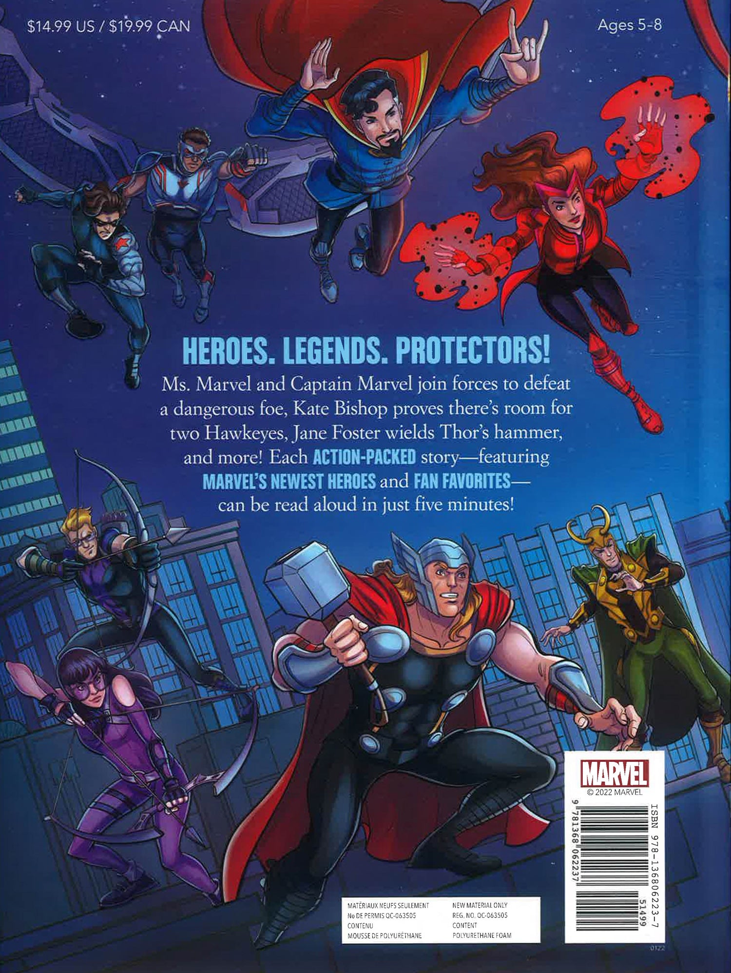 Heroes. Legends. Protectors! This padded storybook collection features 12 stories: Ms. Marvel and Captain Marvel join forces to defeat a dangerous foe, Kate Bishop proves there's room for two Hawkeyes, Jane Foster wields Thor's hammer, and more! Each action-packed adventure paired with colorful illustrations on every page--featuring Marvel's newest heroes and fan favorites--can be read aloud in just five minutes. Perfect for cuddle time, bedtime, or anytime!