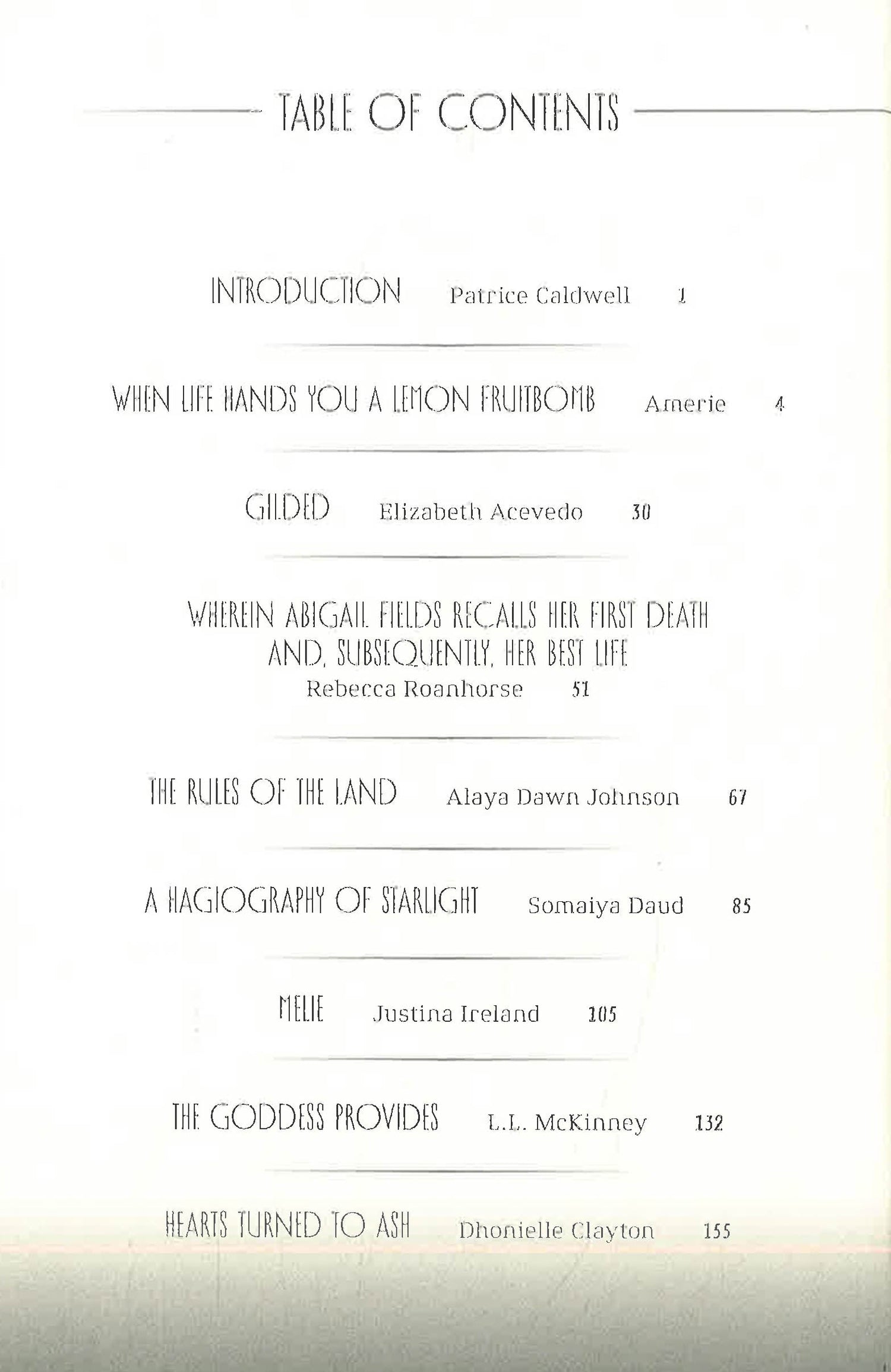 With stories by: Elizabeth Acevedo, Amerie, Patrice Caldwell, Dhonielle Clayton, J. Marcelle Corrie, Somaiya Daud, Charlotte Nicole Davis, Justina Ireland, Alaya Dawn Johnson, Danny Lore, L. L. McKinney, Danielle Paige, Rebecca Roanhorse, Karen Strong, Ashley Woodfolk, and Ibi Zoboi.
