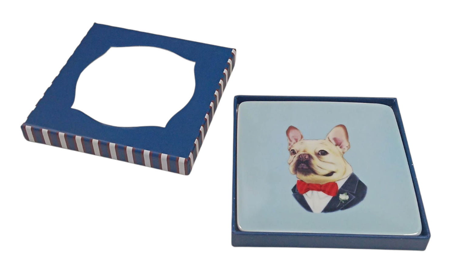 This square porcelain tray from Galison features a dapper French bulldog by Berkley Illustration and is perfect for keys, coins, or jewelry.