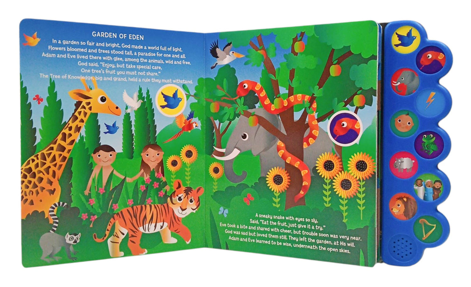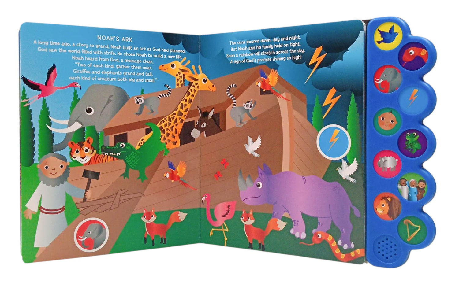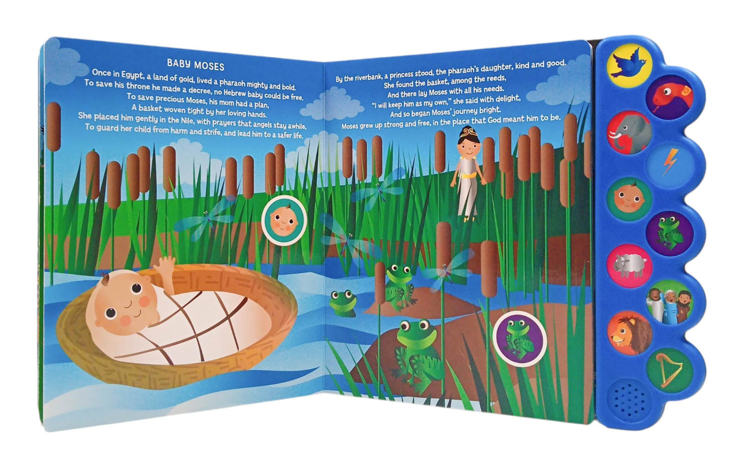 Experience a fun and creative way to teach classic Bible stories to young children filled with beautiful illustrations and inspiring people from the Bible. As you read along, press the button to hear the 10 exciting sounds bringing the stories to life! Ages 3 & up