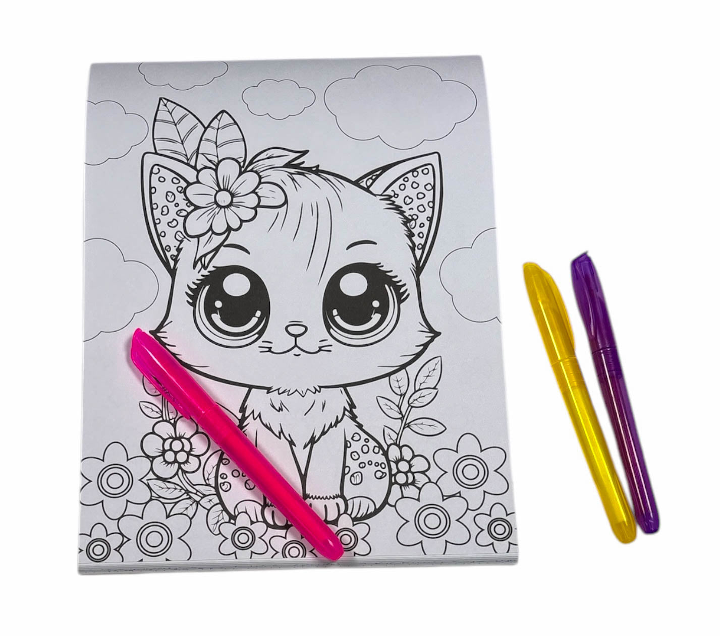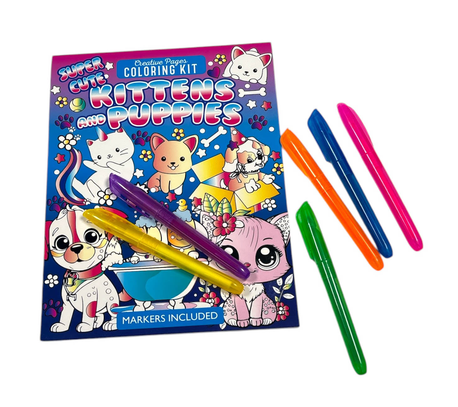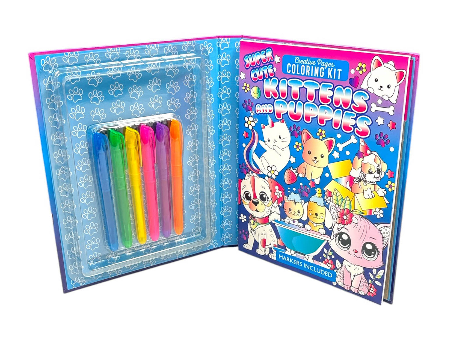 Inside you will find 24 amazing hand-illustrated pages of super cute puppies and kittens and six bright markers to bring them to life.