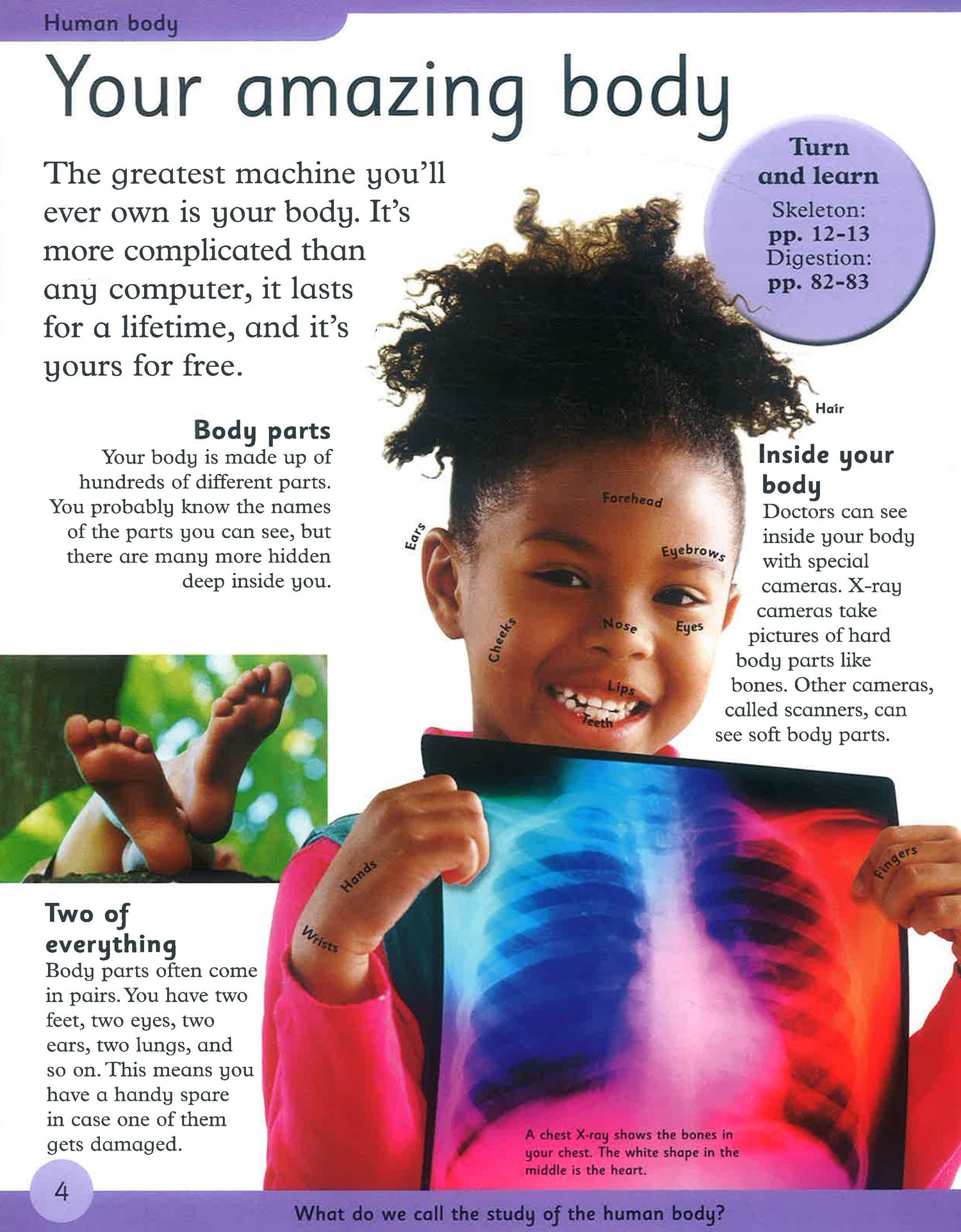 Know what is inside your bones, find out about how joints move, and how muscles work. Peek into the control center of the body – the brain. Explore all the senses including touch, sight, hearing, smell, and taste. Find out how our organs, such as the heart and lungs, work.