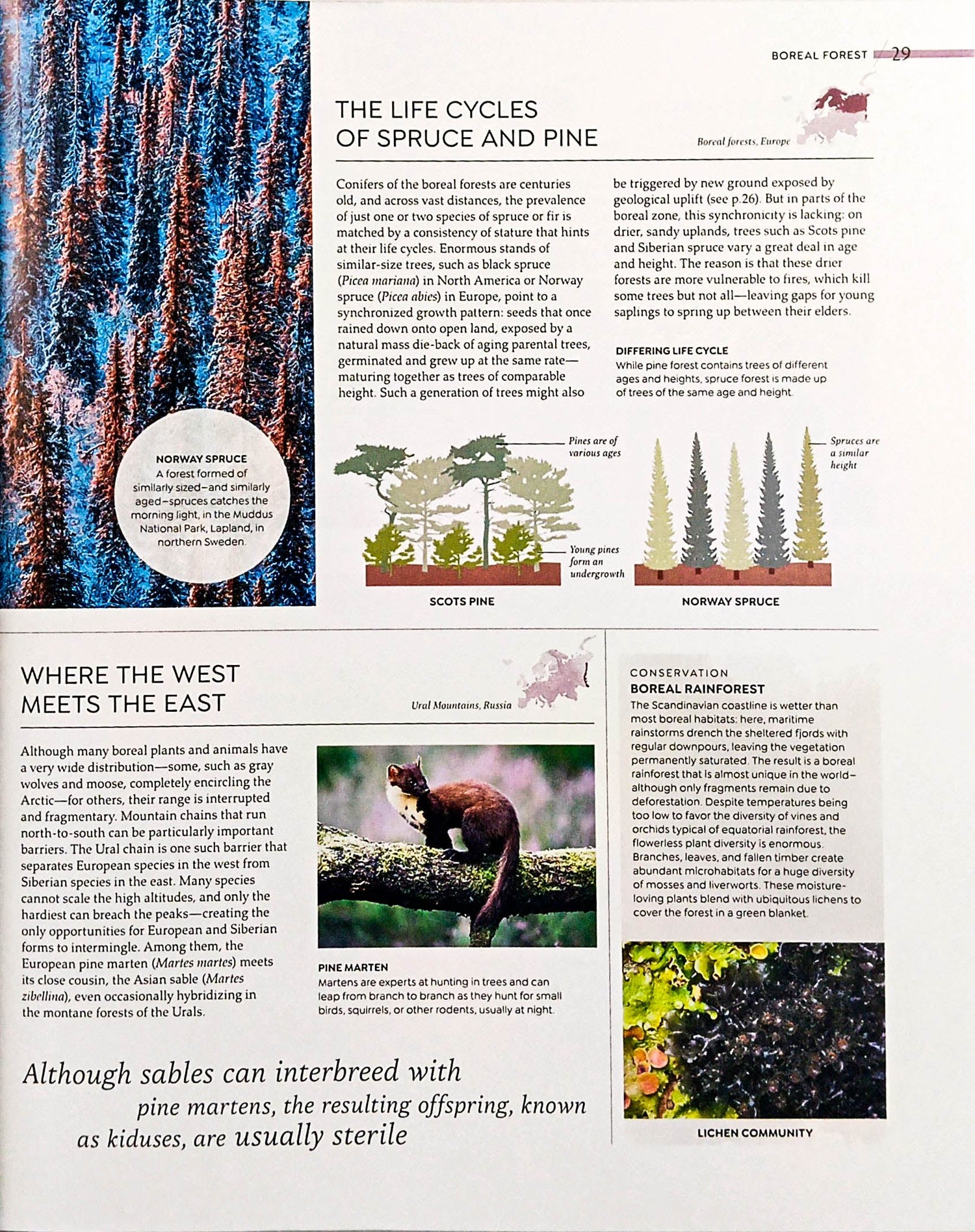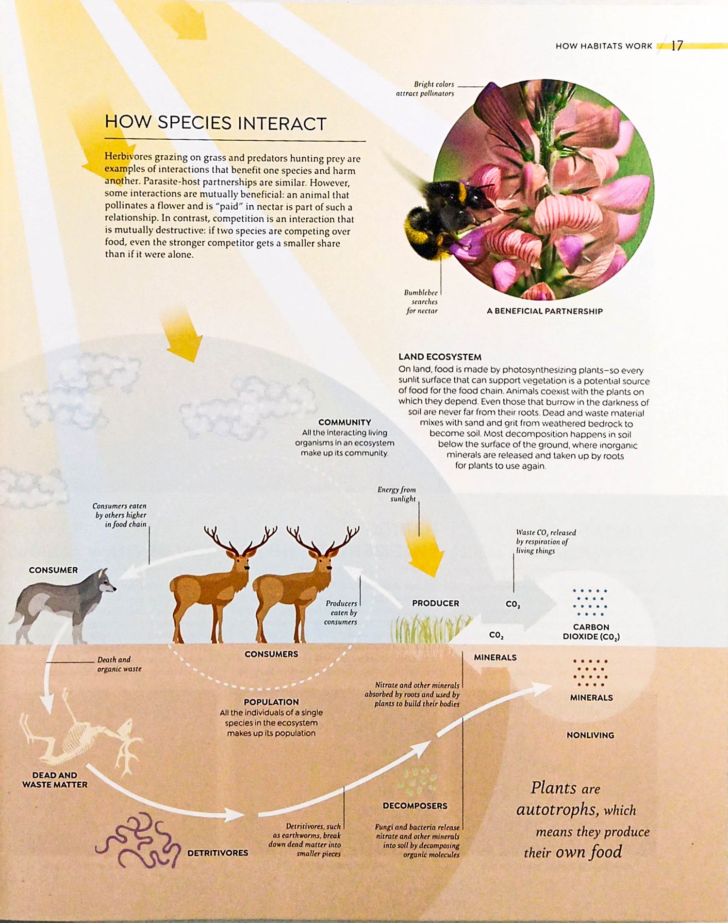 Packed with fascinating illustrations, the book analyzes how each habitat works and examines its unique combination of plants and animals, along with the features that suit them to live there. It then goes deeper, telling stories about how the inhabitants relate to one another and interact. Stories are told using images and graphics, showing what is going on in the natural ecosystem. The stories include survival strategies and life cycles, how pollinators fertilize plants, and how animals distribute the seeds, how similar species divide up food or living space to avoid competition, and how some species cooperate in intimate partnerships.