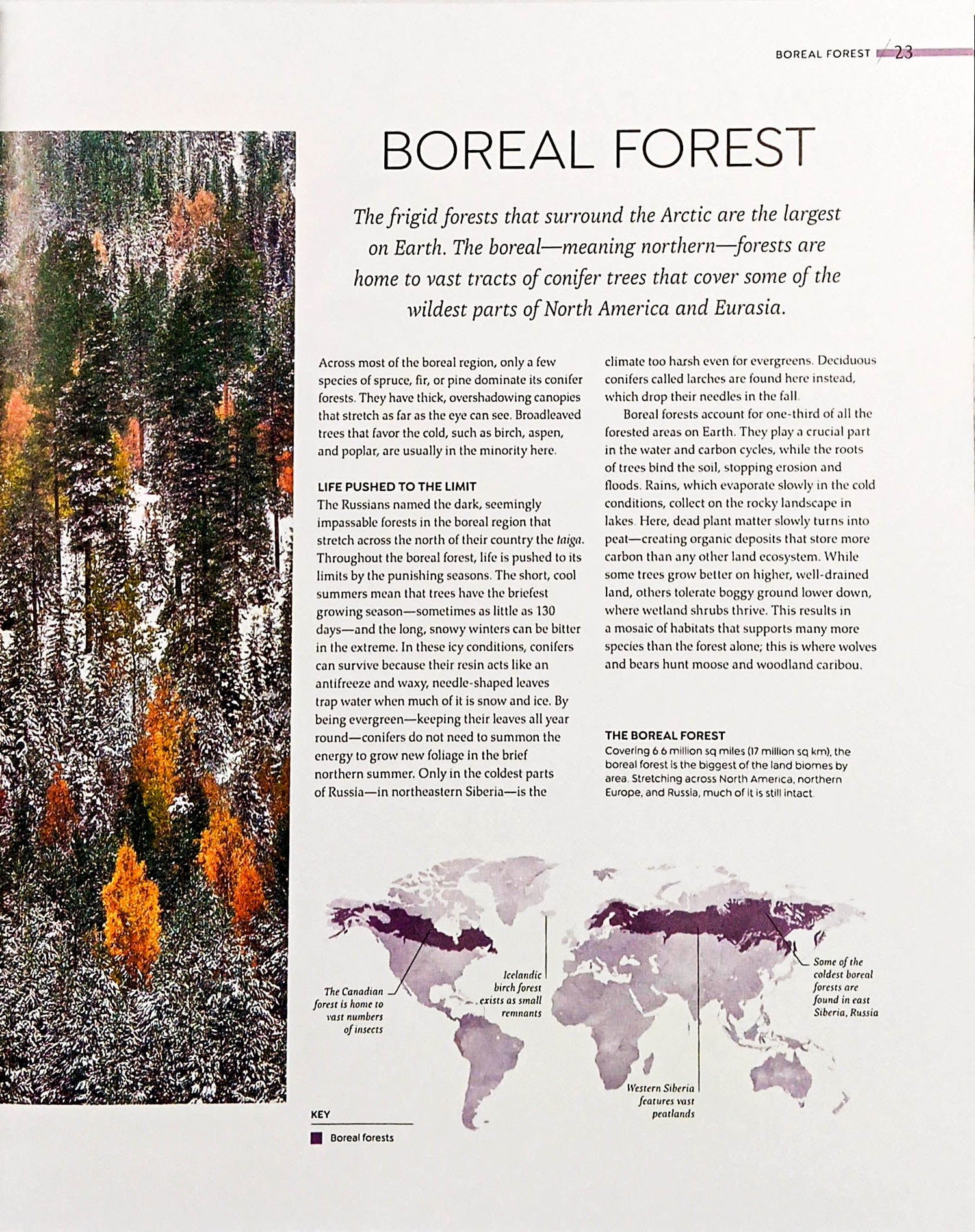Earth’s pristine wildernesses are dwindling, so the book includes national parks, wildlife reserves, and other protected areas, and the conservation efforts needed to preserve our precious biological diversity.