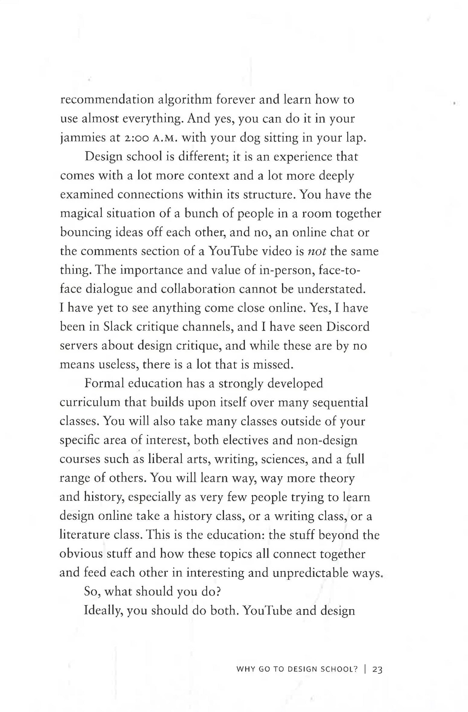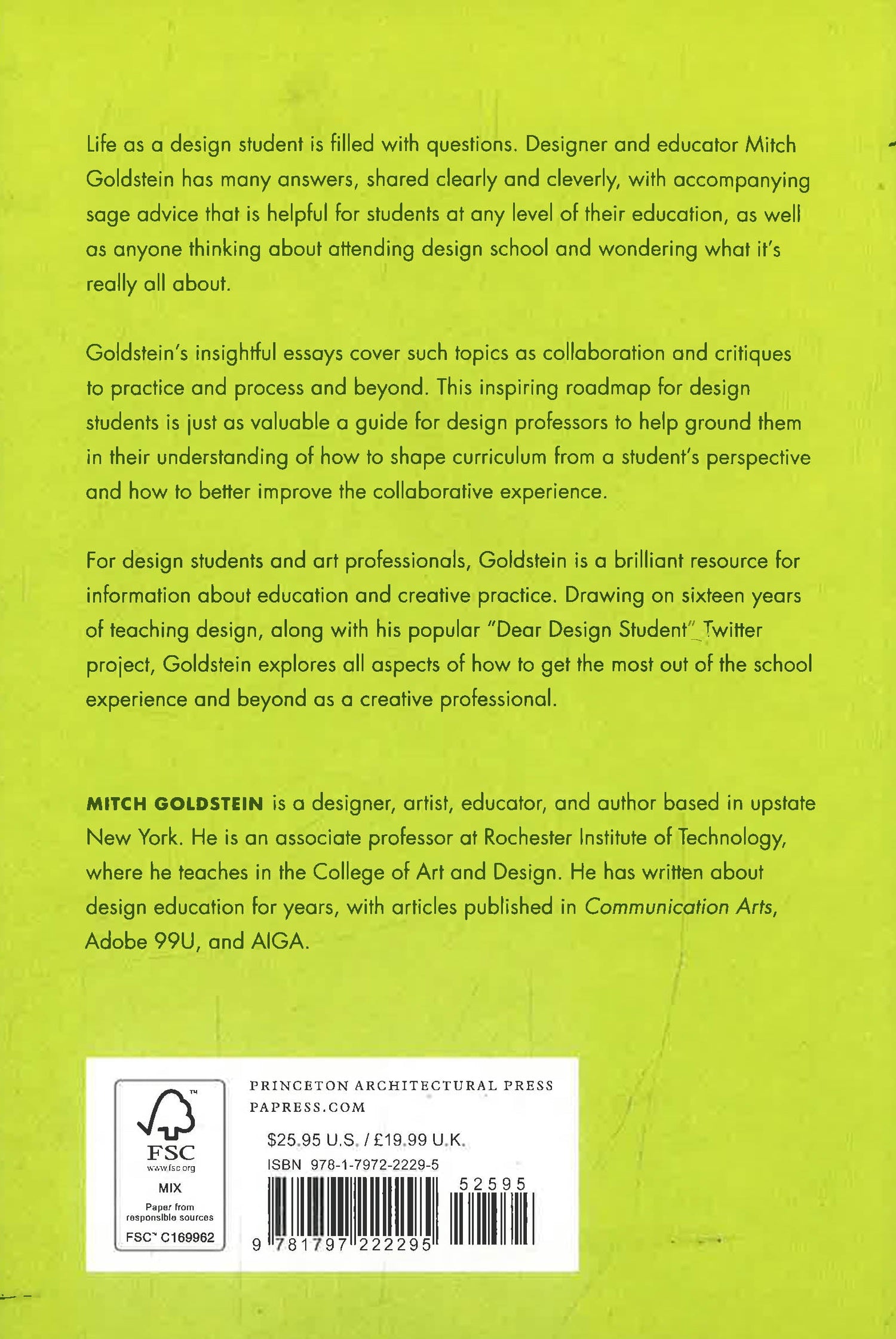 Twenty short essays by designer, artist, and educator Mitch Goldstein to help design students to get the most out of school. Having taught design for 16 years, Mitch Goldstein explores all aspects of how to get the most out of the design school experience, in a way that makes sense for design students at any level of their education, or someone thinking about attending a design school and wondering what it’s really all about. Goldstein will cover such topics as: • Why go to design school • What actually happens in your classes during your time at design school • What kind of assignments you can expect • How critiques work • What you’re actually expected to do on a daily basis • How to translate ideas into paying client projects • How to make things that will get you a job • And much moreFrom collaboration and critiques to practice and process, this book gives design students a guide to make the best of their school experience, while also adding value for design professors to understand how to design school from a student’s perspective, and to better the collaborative experience.