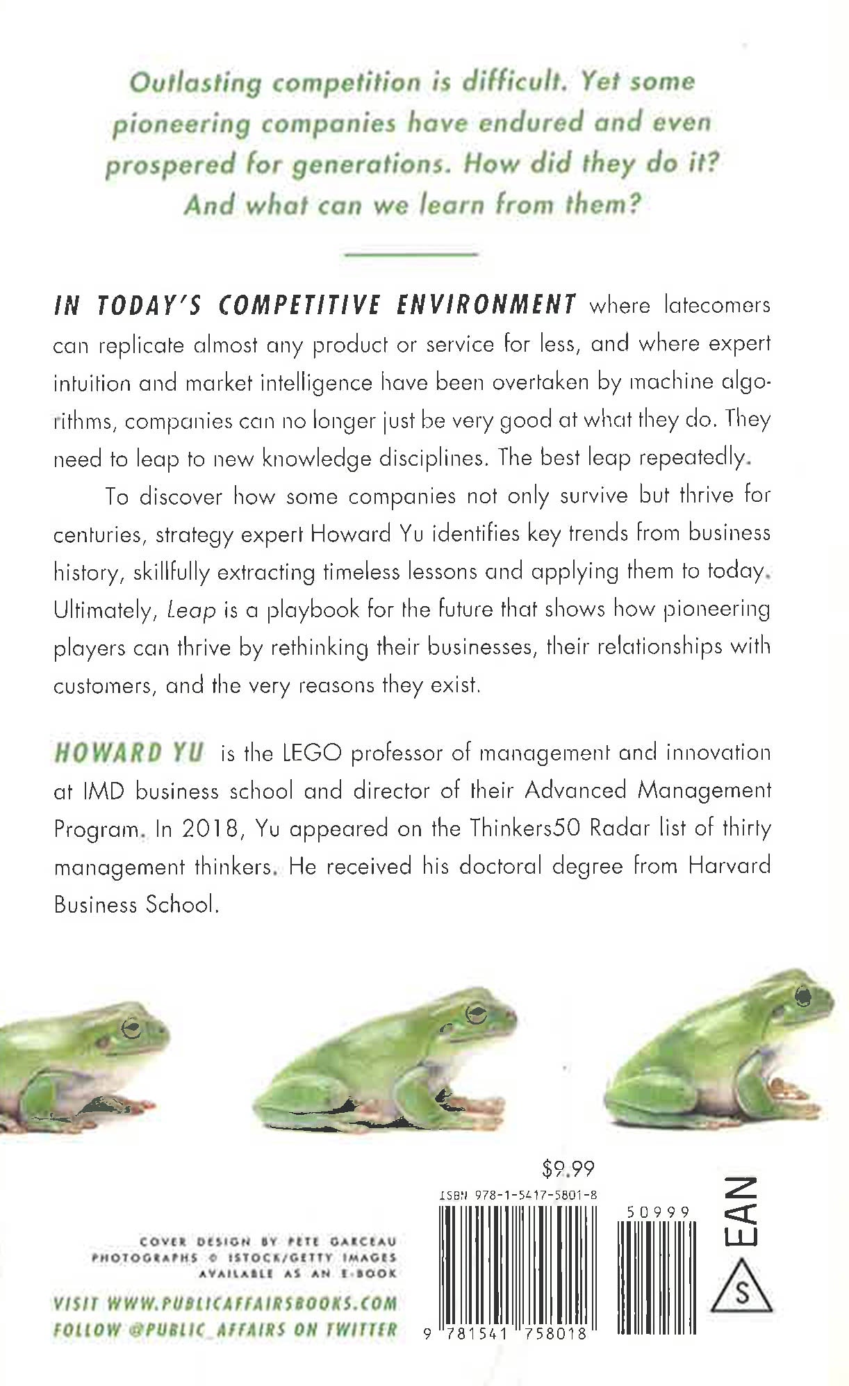 Using riveting case studies of successful leaps and tragic falls, Yu illustrates five principles to success that span a wide range of industries, countries, and eras. Learn about how P&G in the 19th century made the leap from handcrafted soaps and candles to mass production of its signature brand Ivory, leaped into the new fields of consumer psychology and advertising, then leaped again, at the risk of cannibalizing its core product, into synthetic detergents and won with Tide in 1946. Learn about how Novartis and other pharma pioneers stayed ahead by making leaps from chemistry to microbiology to genomics in drug discovery; and how forward-thinking companies, including China's largest social media app--WeChat, Tokyo-based Internet service provider Recruit Holdings, and Illinois-headquartered John Deere are leaping ahead by leveraging the emergence of ubiquitous connectivity, the inexorable rise of intelligent machines, and the rising importance of managerial creativity.