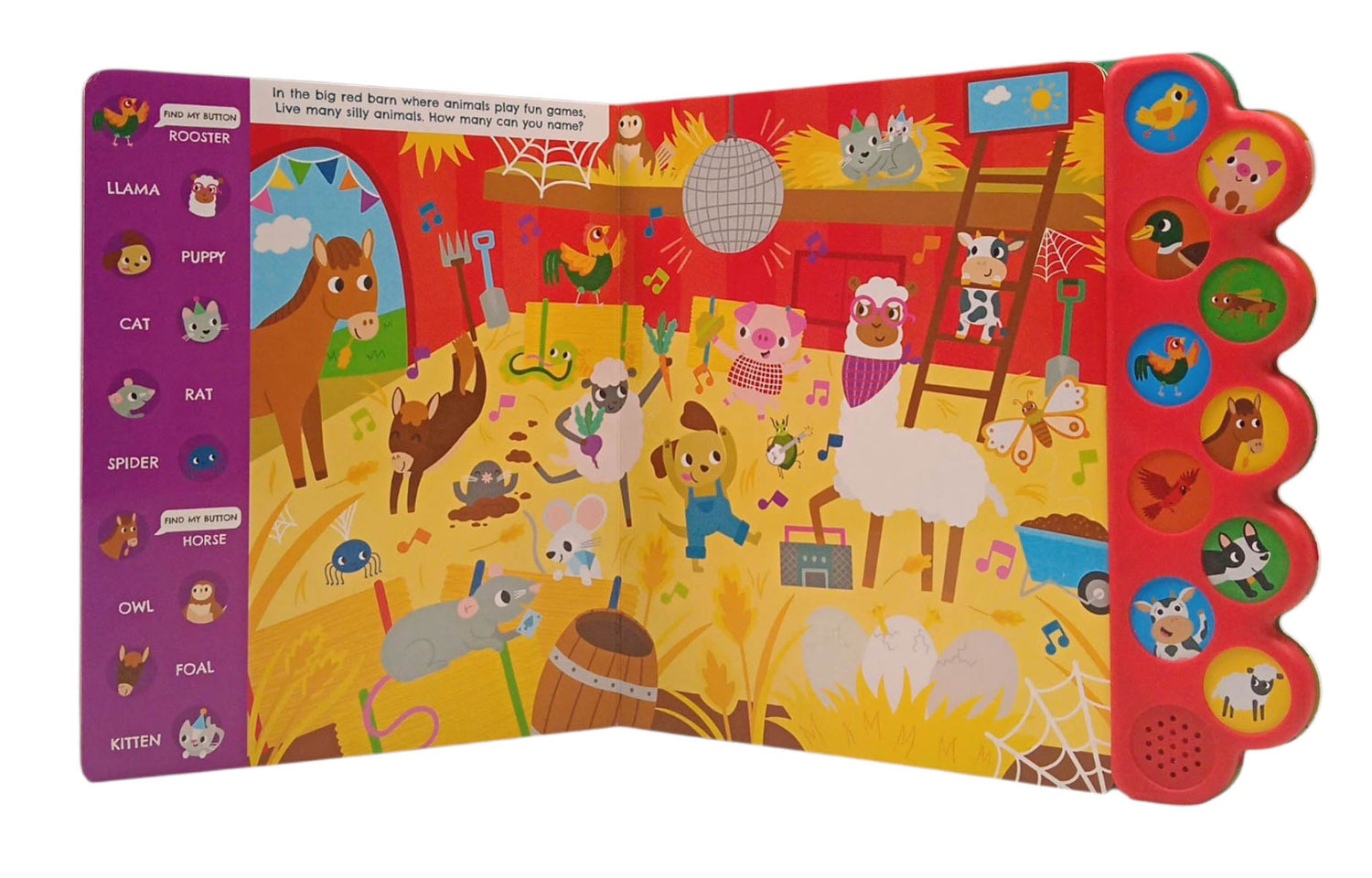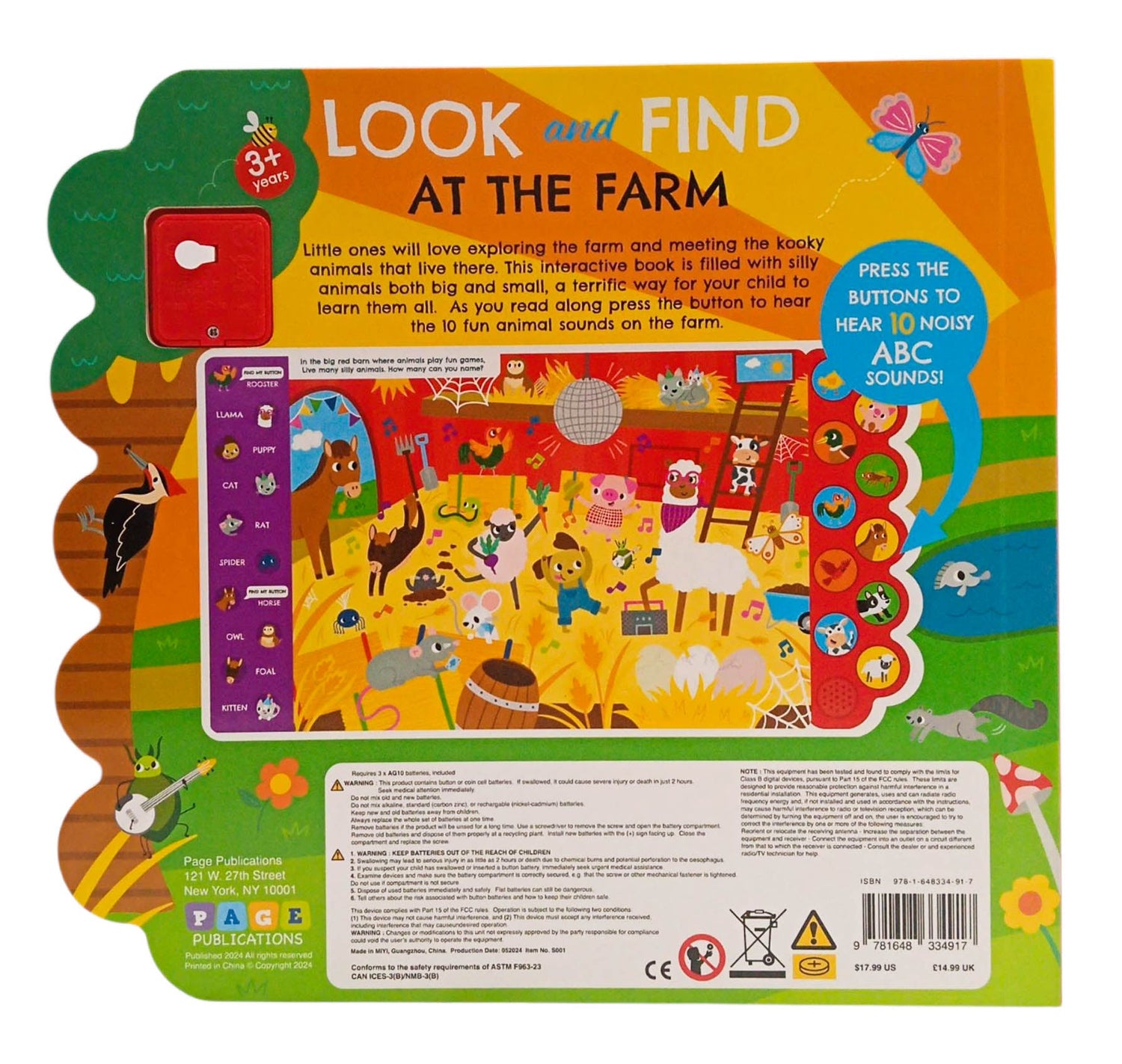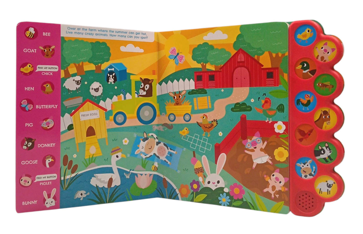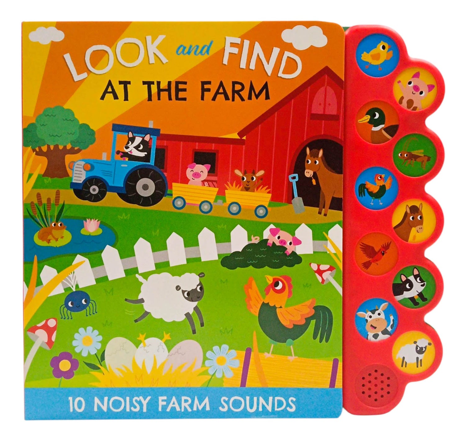 This interactive book invites kids to explore a busy farm with colorful illustrations, engaging look-and-find challenges, and 10 farm-themed sound buttons. Hear the moo of a cow, the cluck of a chicken, and the buzz of bees while searching for animals, tools, and more on every page.