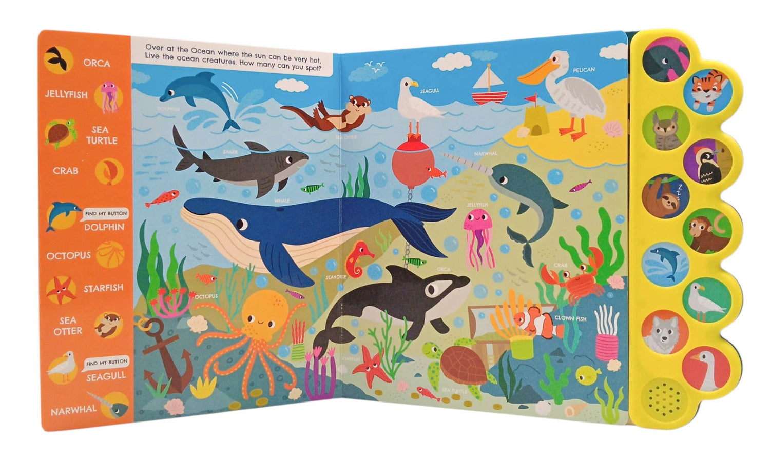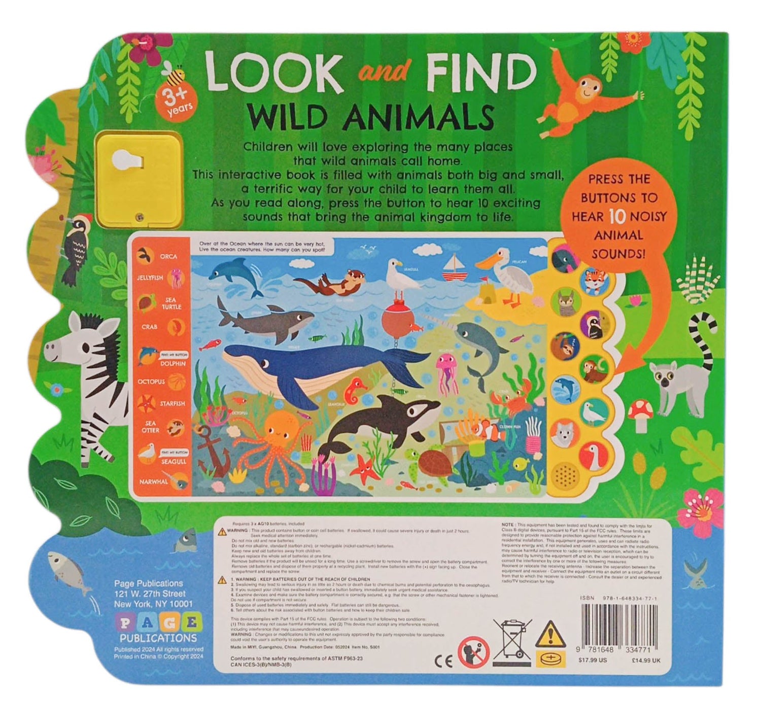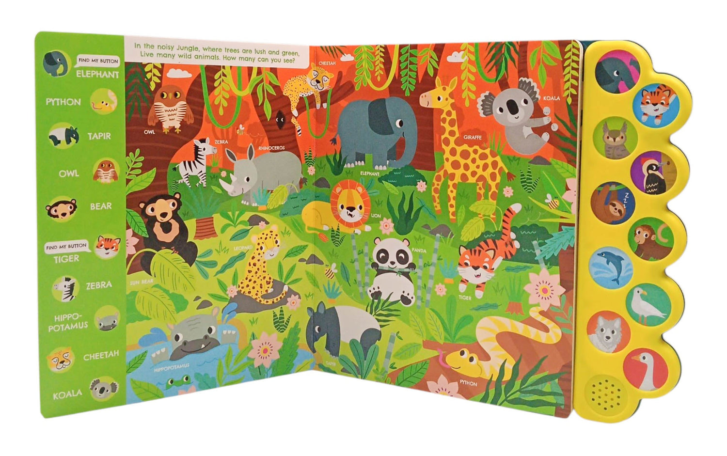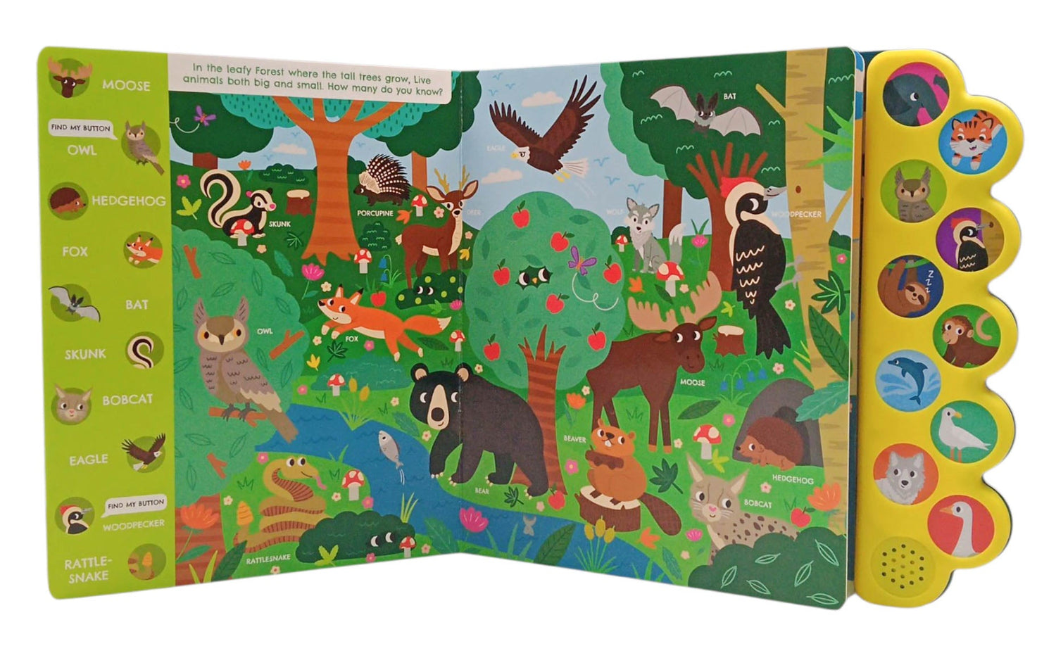 Children will love exploring the many places, that wild animals call home. This interactive book is filled with animals both big and small, a terrific way for your child to learn them all. As you read along, press the button to hear 10 exciting sounds that bring the animal kingdom to life. Press the buttons to hear 10 noisy animal sounds!