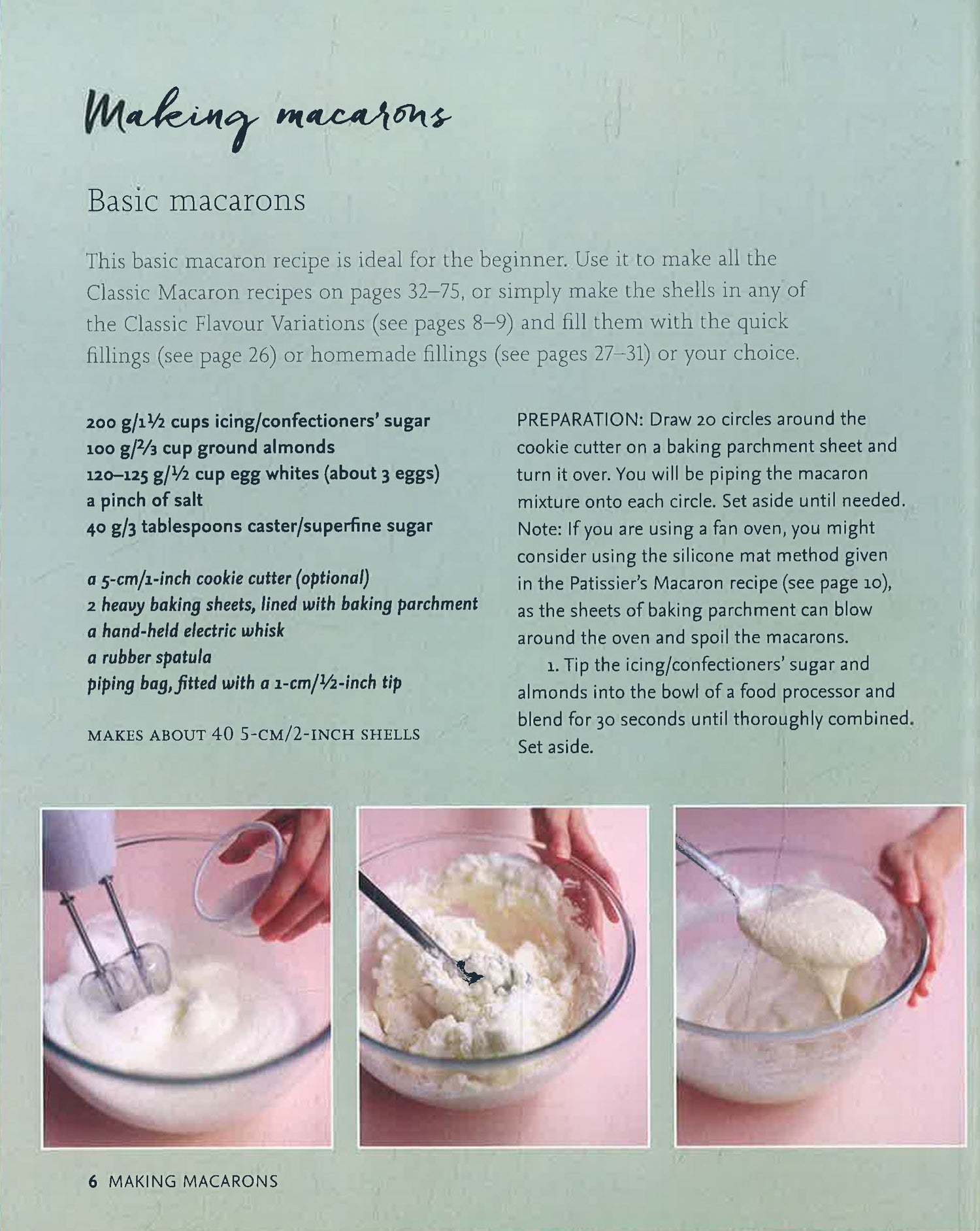 Step-by-step instruction and more than 65 recipes for simple and decorated French macarons.