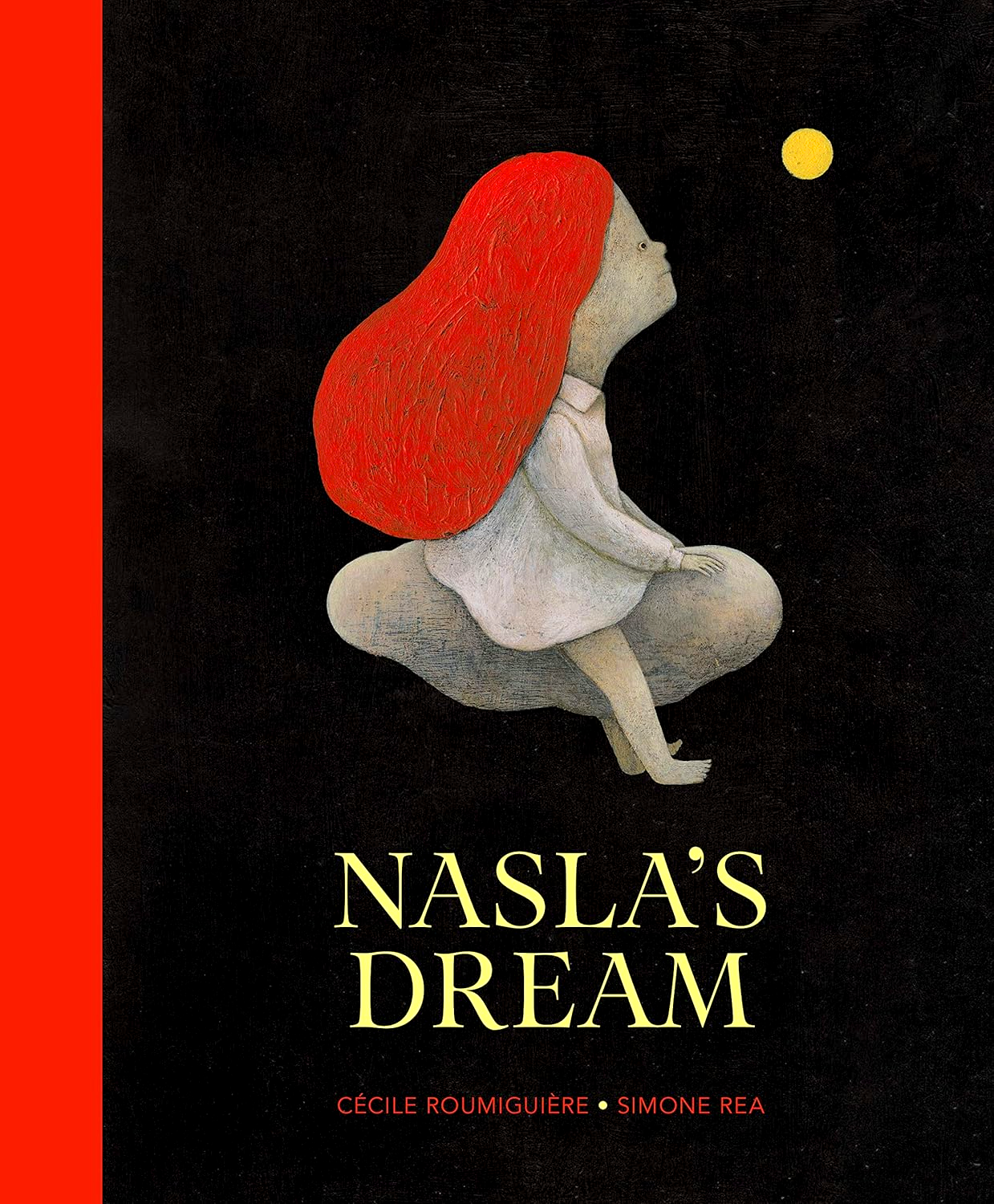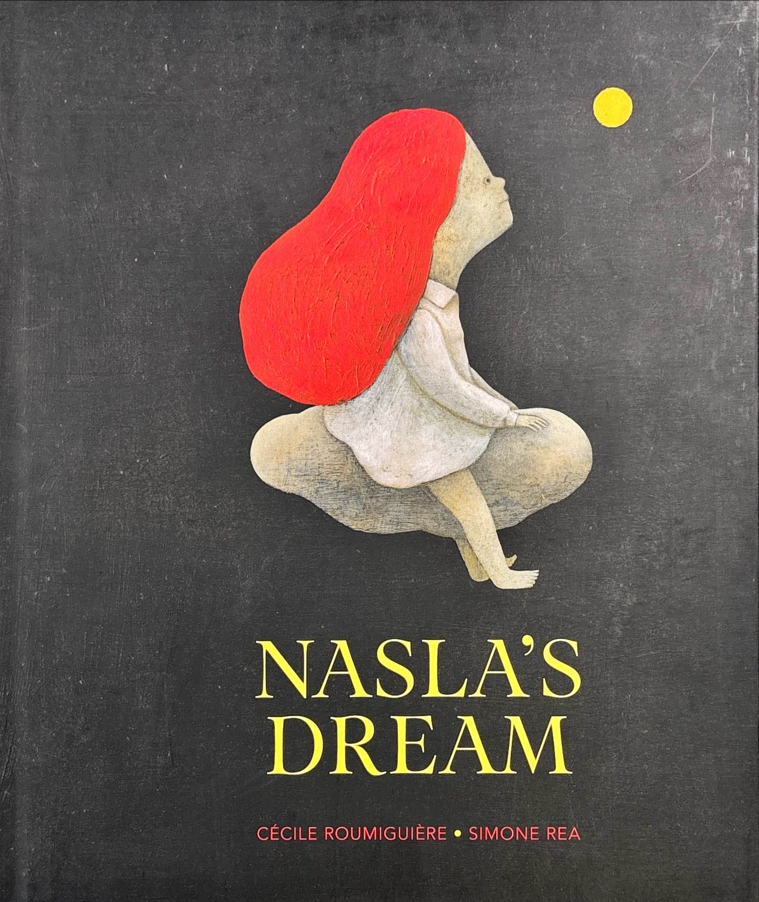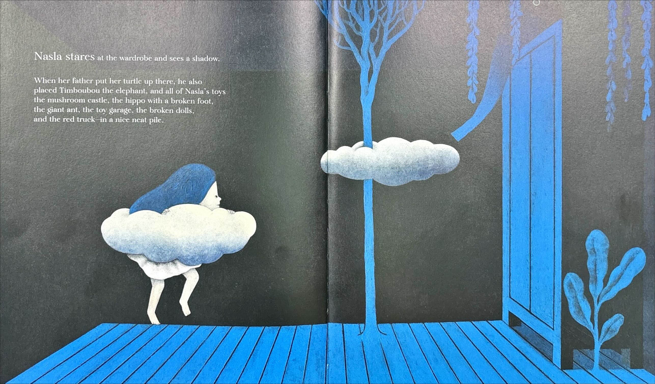At bedtime, a mysterious yellow dot appears above the top of Nasla's wardrobe—the new home for her toys now that she's decided she's too old to sleep with stuffed animals. Could it be Timboubou the elephant, or her hippo with the broken foot? As a wondrous, dreamlike world with dancing moons and swinging elephant trunks emerges from the shadows, she longs to sing and reassure her toys, but she worries that dancing and singing at night is not allowed. When her fear grows too big, she finds comfort in the secret charm under her pillow and falls asleep. The surreal imagery of Nasla's Dream beautifully depicts the imaginary world of a young child learning how to become independent.