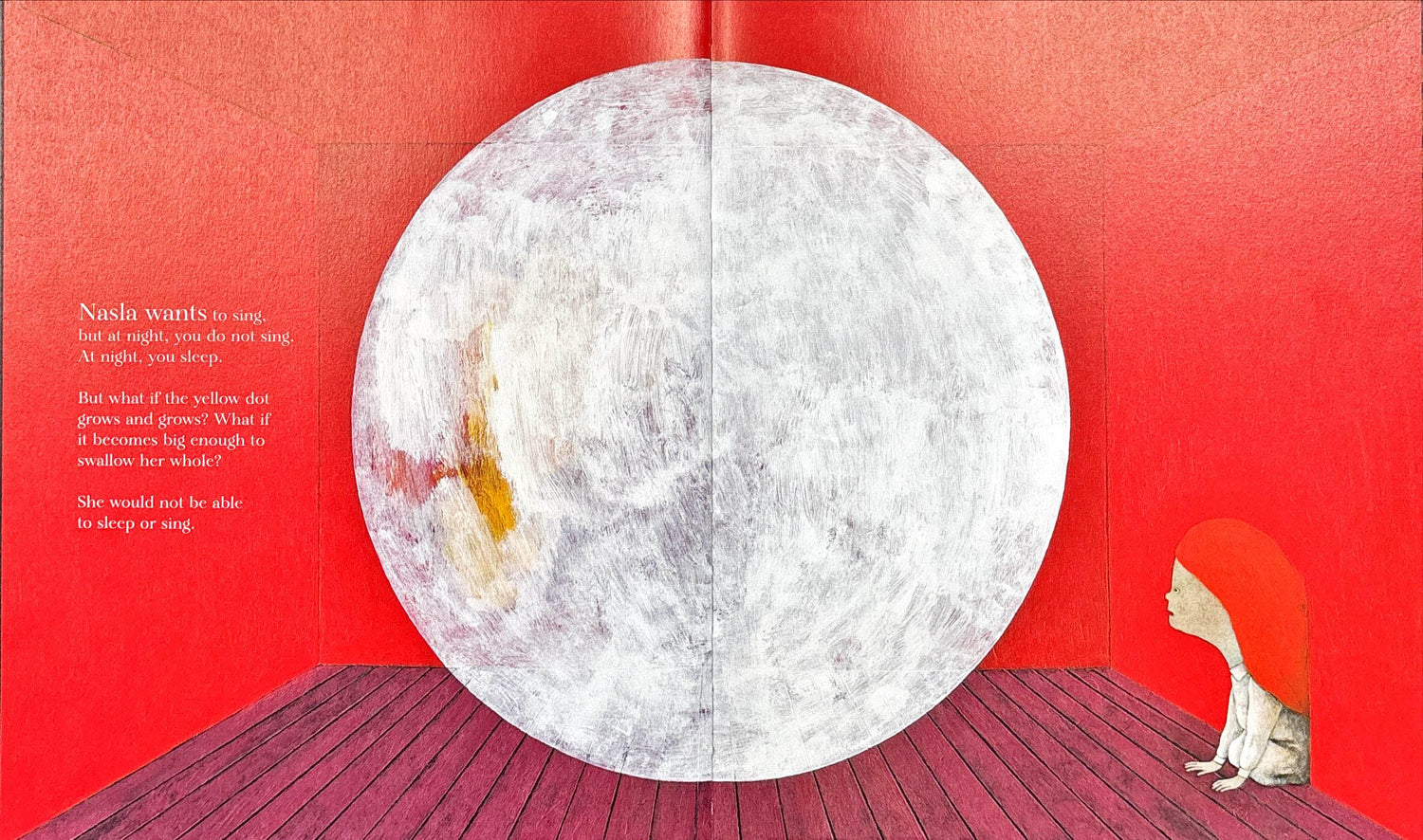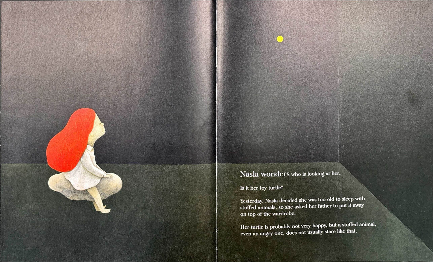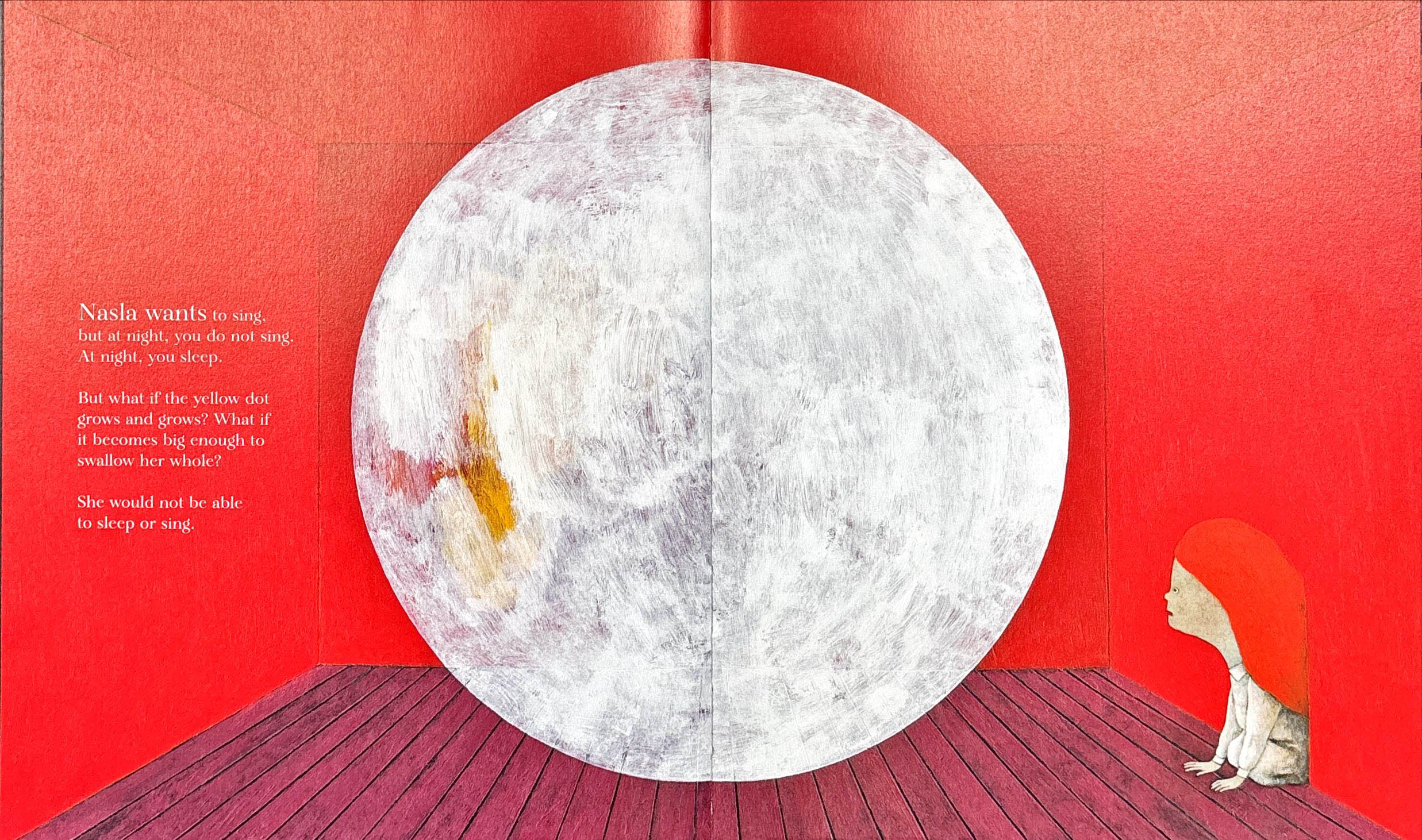 At bedtime, a mysterious yellow dot appears above the top of Nasla's wardrobe—the new home for her toys now that she's decided she's too old to sleep with stuffed animals. Could it be Timboubou the elephant, or her hippo with the broken foot? As a wondrous, dreamlike world with dancing moons and swinging elephant trunks emerges from the shadows, she longs to sing and reassure her toys, but she worries that dancing and singing at night is not allowed. When her fear grows too big, she finds comfort in the secret charm under her pillow and falls asleep. The surreal imagery of Nasla's Dream beautifully depicts the imaginary world of a young child learning how to become independent.