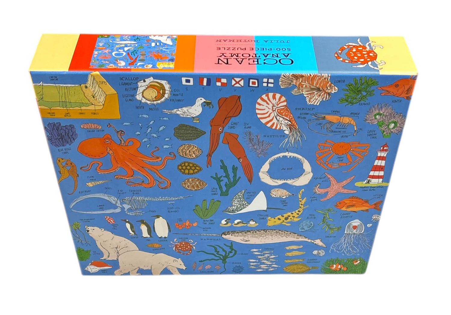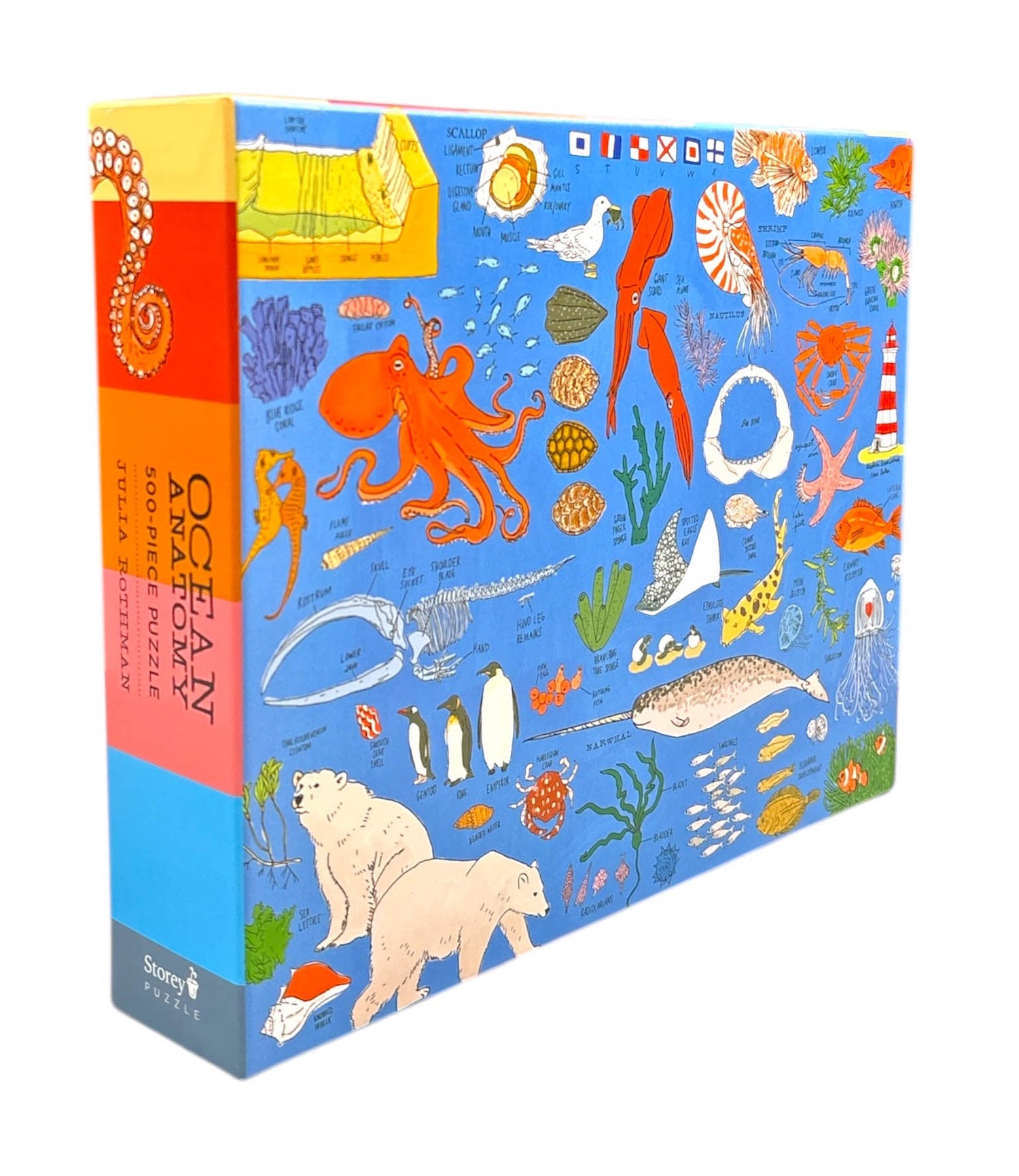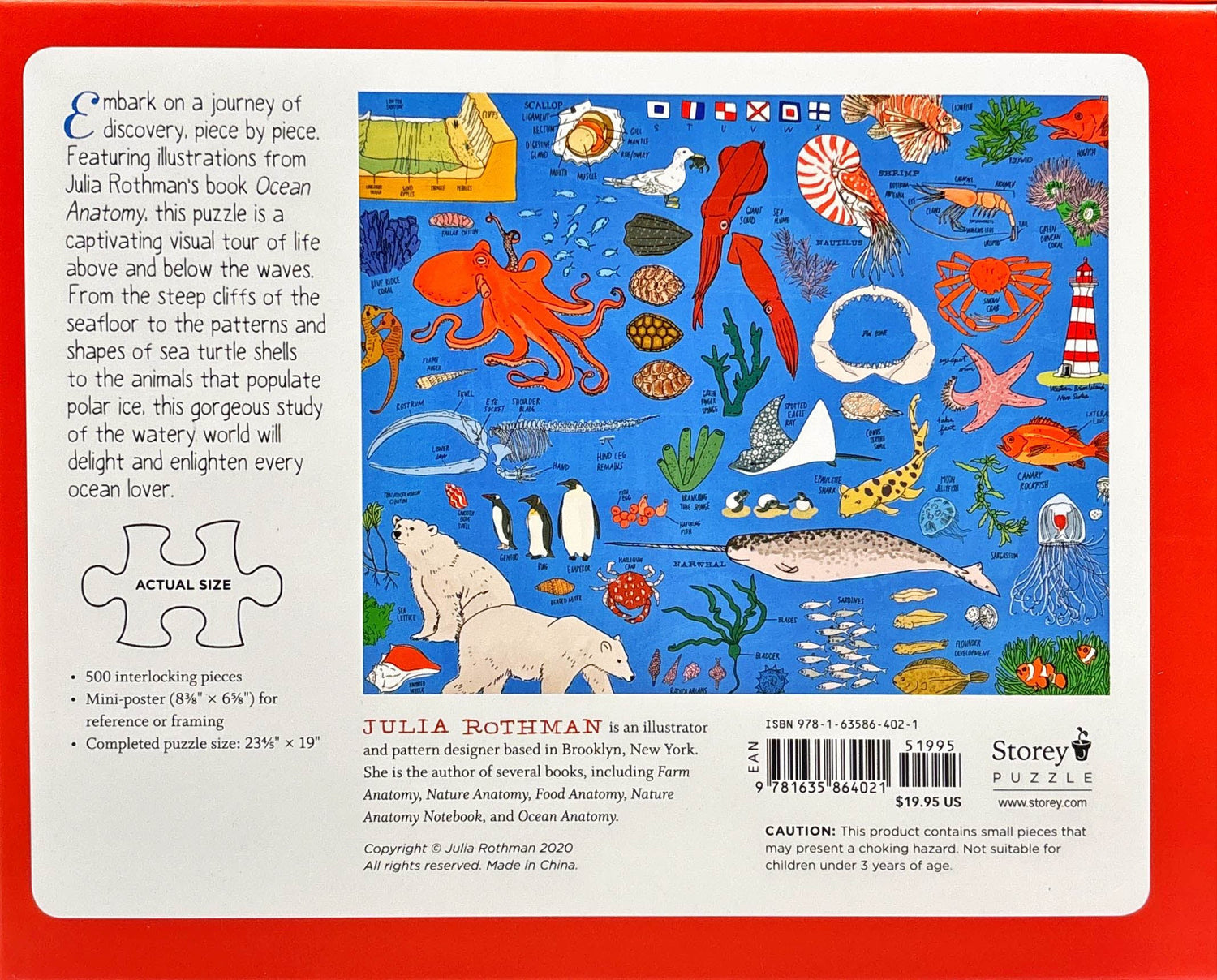 Embark on a journey of discovery, piece by piece. Featuring illustrations from Julia Rothman’s book Ocean Anatomy, this puzzle is a captivating visual tour of oceans, above and below the waves. From the steep cliffs of the seafloor to the patterns and shapes of sea turtle shells to the animals that populate polar ice, this gorgeous study of the marine world will delight and enlighten every ocean lover.