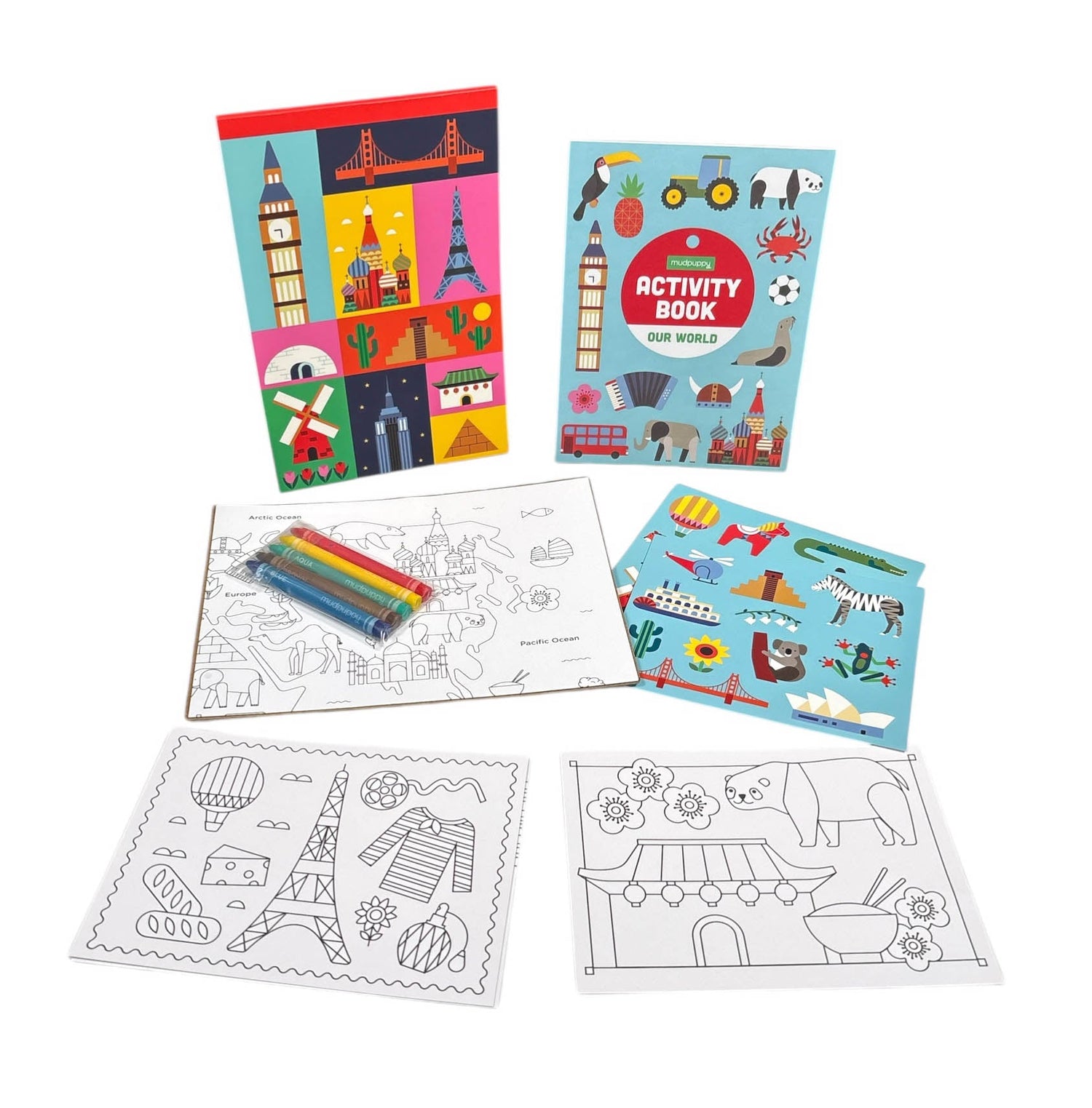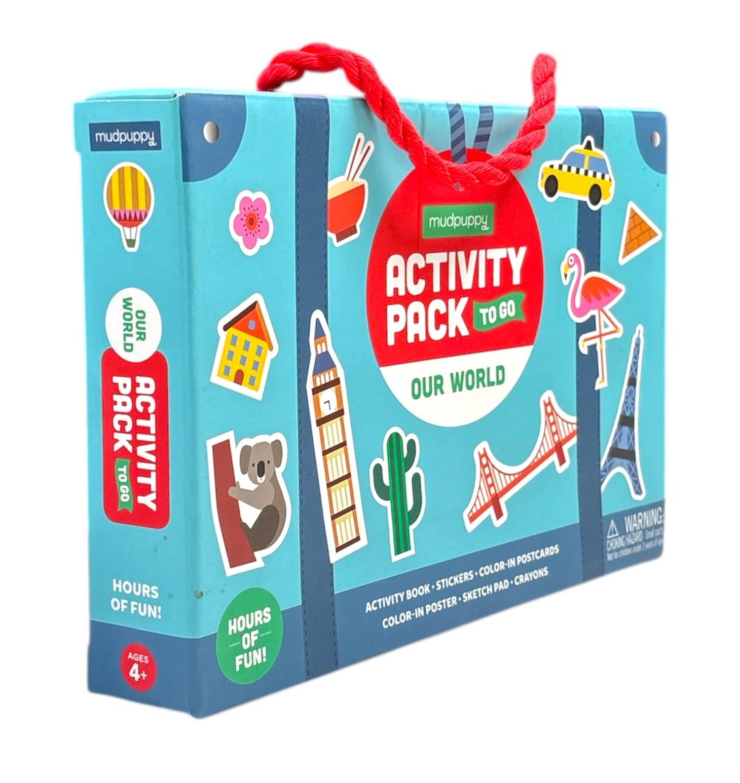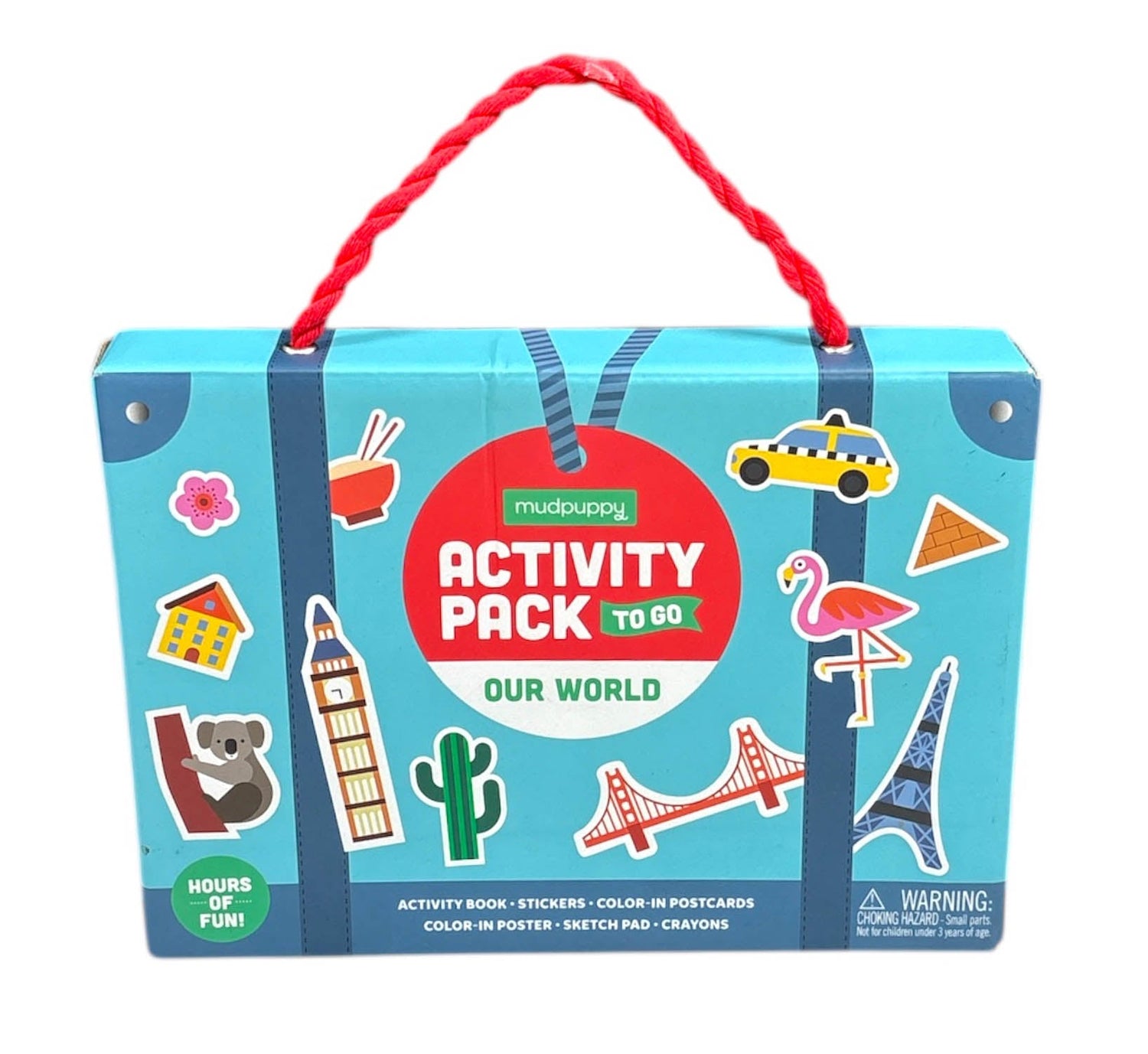 Packaged in an adorable mini-suitcase package with handle to carry, this portable package of fun activities featuring places all over the world, is perfect for travel, parties, or individual fun at home. Mudpuppy's Activity Packs To Go contain 3 color-in postcards, over 20 stickers, sketch pad, activity book, color-in poster, and 5 crayons!.